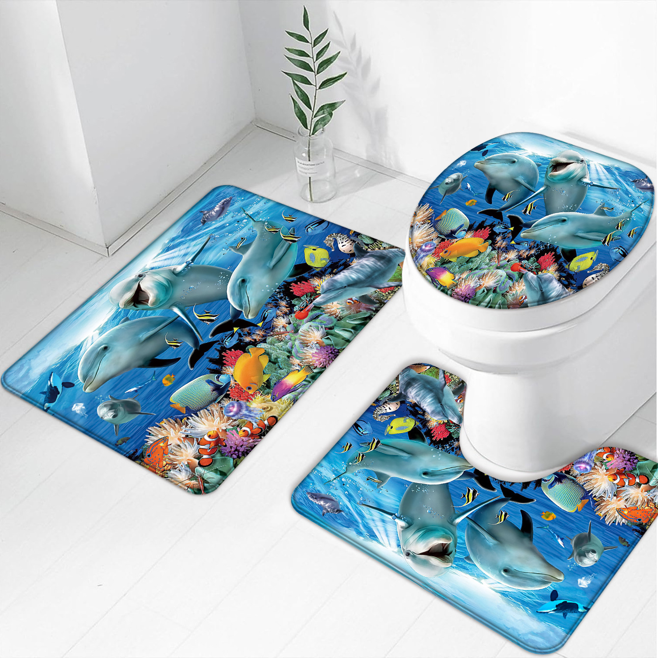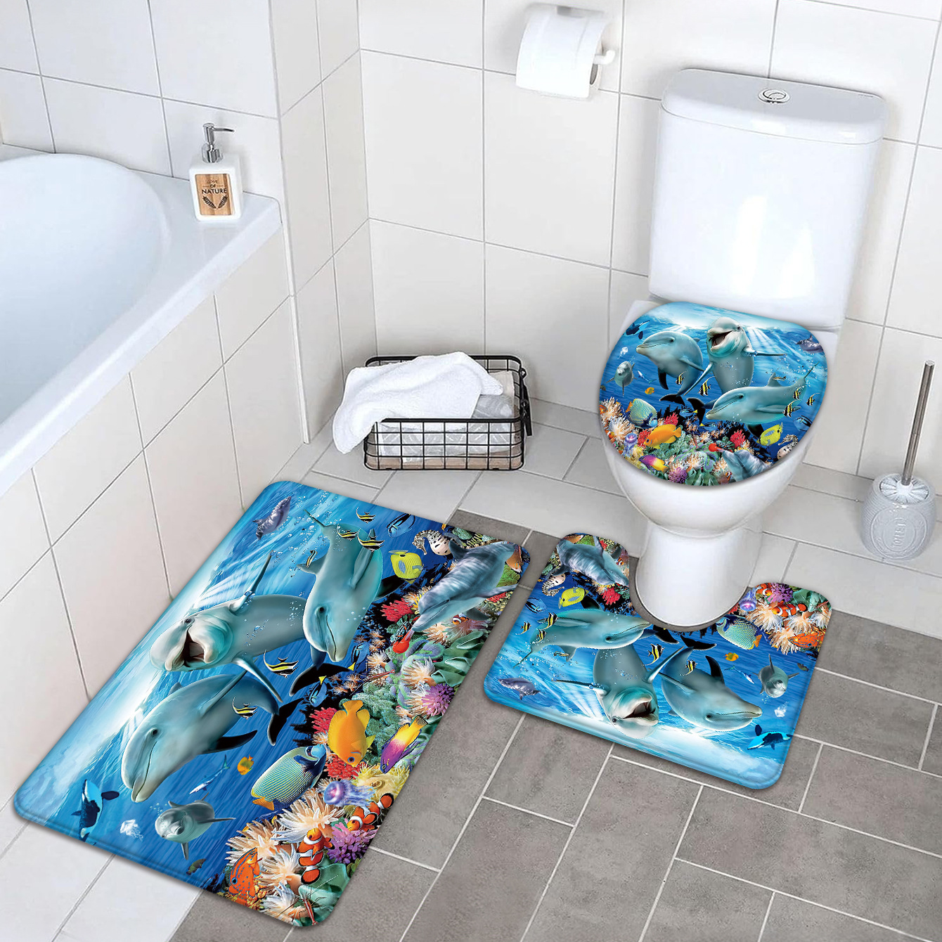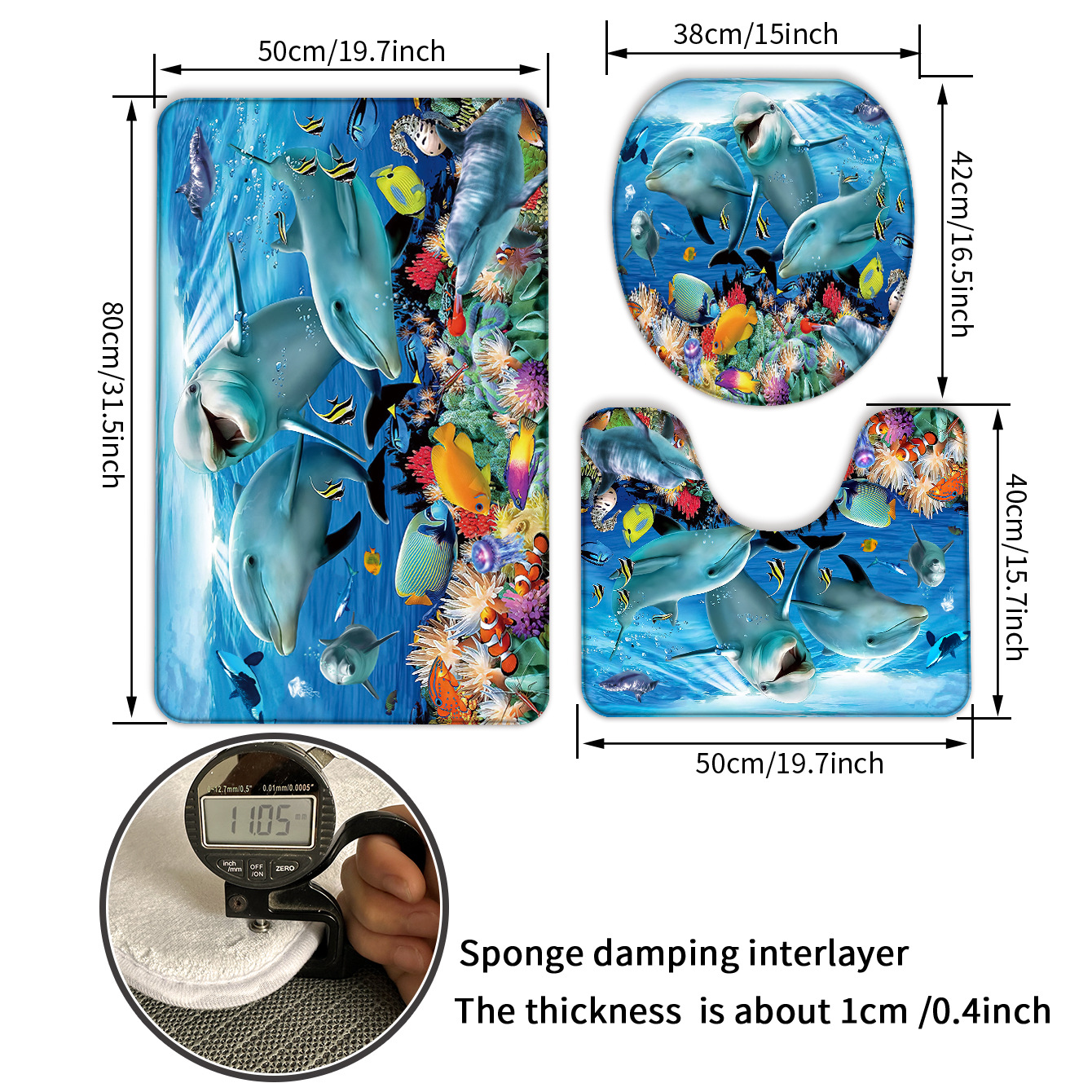 국경 바다 세계 돌고래 인쇄 화장실 매트 세트, 미끄럼 방지 욕실 카펫 회색 바닥 스폰지 매트, U 모양