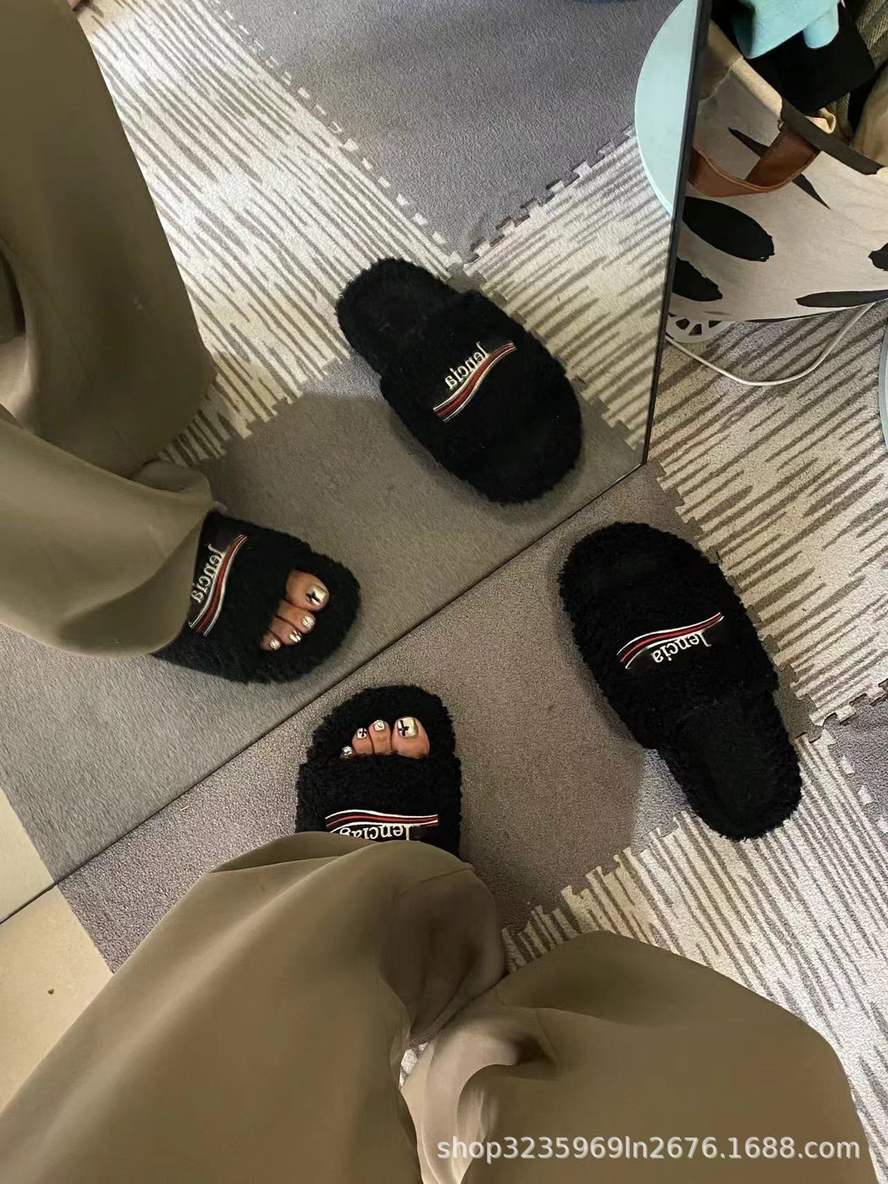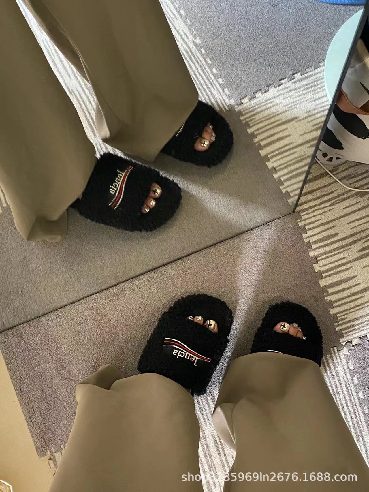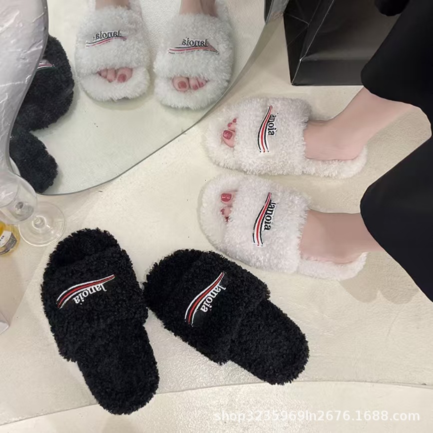 자수 B 파리 한 단어 모직 슬리퍼 여성의 2024 새로운 진짜 양모 두꺼운 외주 슬리퍼 커플 슬리퍼 여성