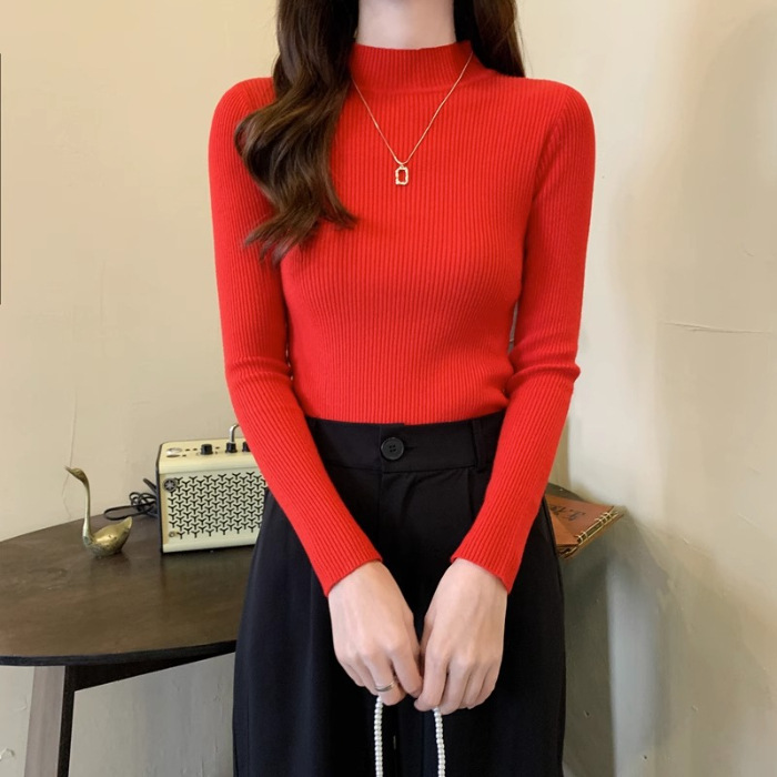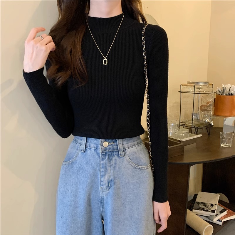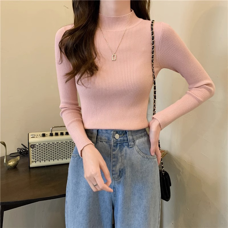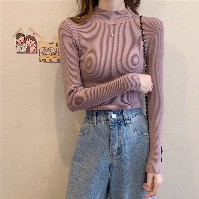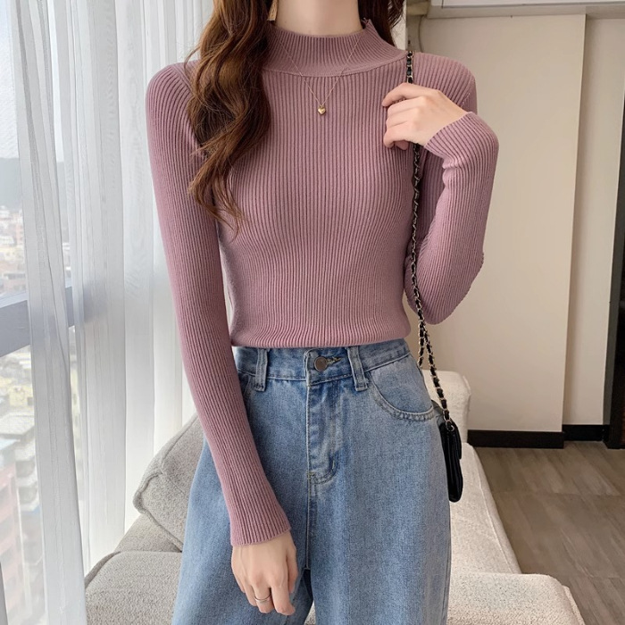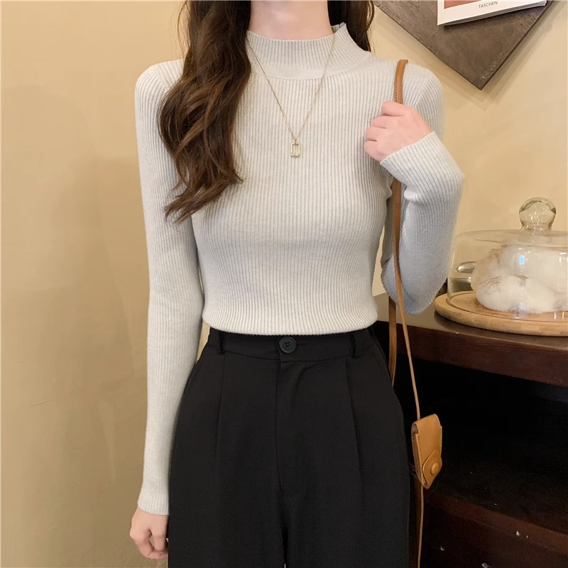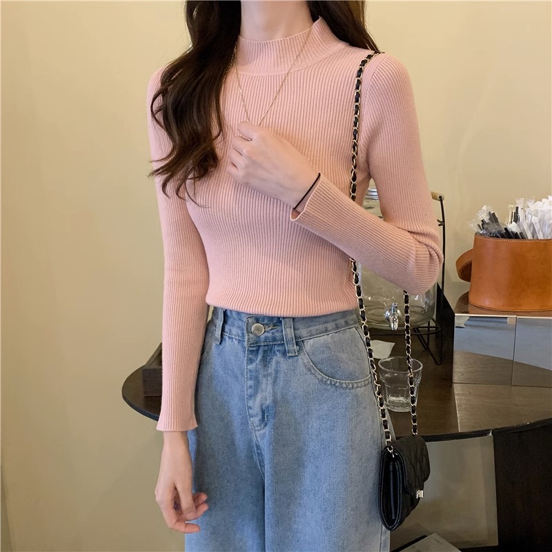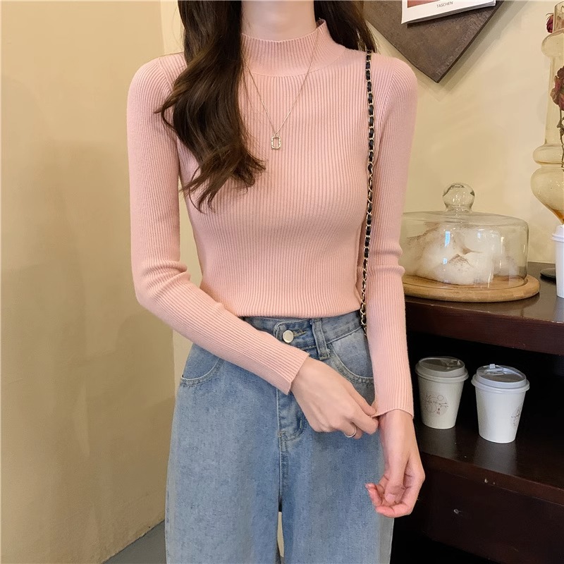이른 가을 얇은 반 터틀넥 슬림 핏 긴팔 니트 스웨터 여자 올 매치 기본 탄성 내베이스 셔츠 탑