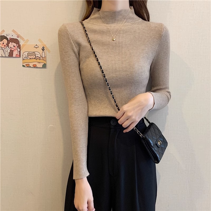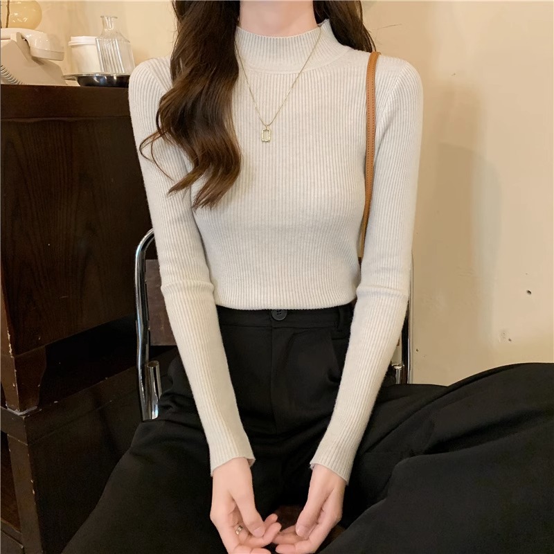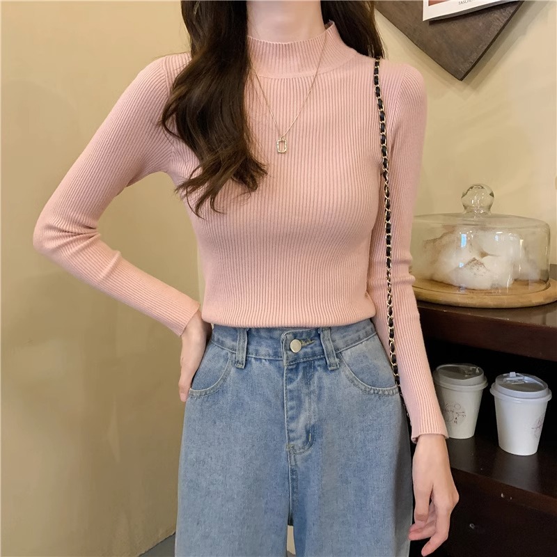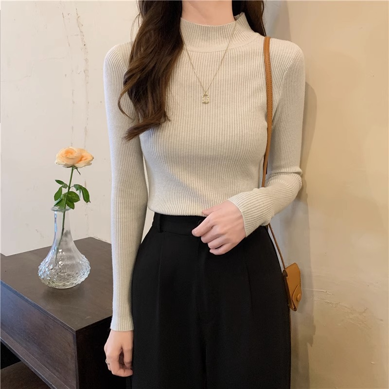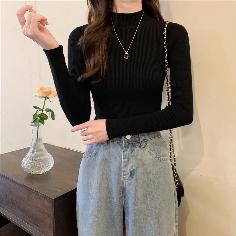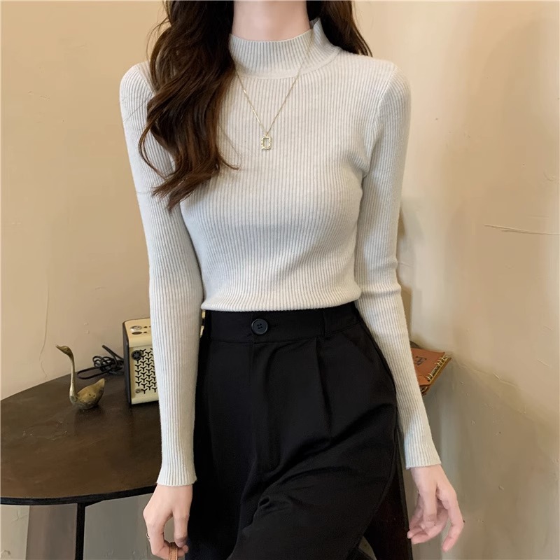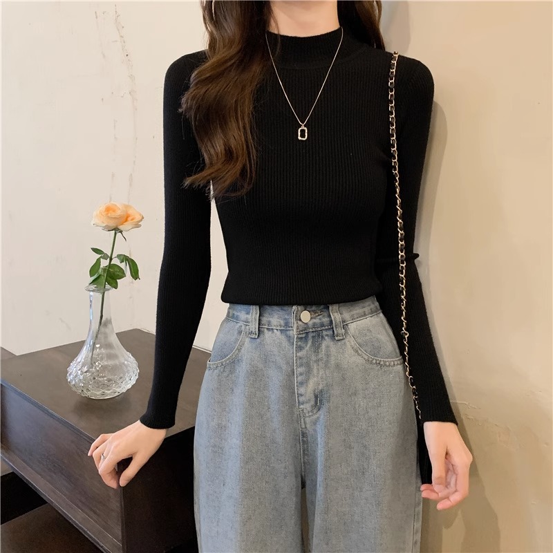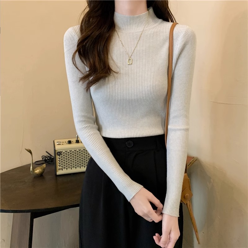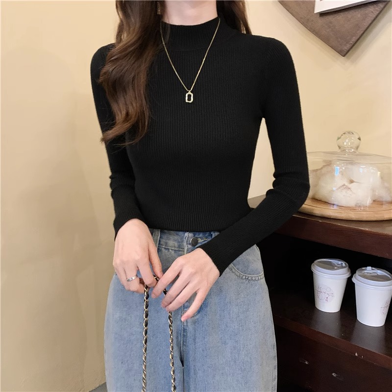 이른 가을 얇은 반 터틀넥 슬림 핏 긴팔 니트 스웨터 여자 올 매치 기본 탄성 내베이스 셔츠 탑스토어 가기