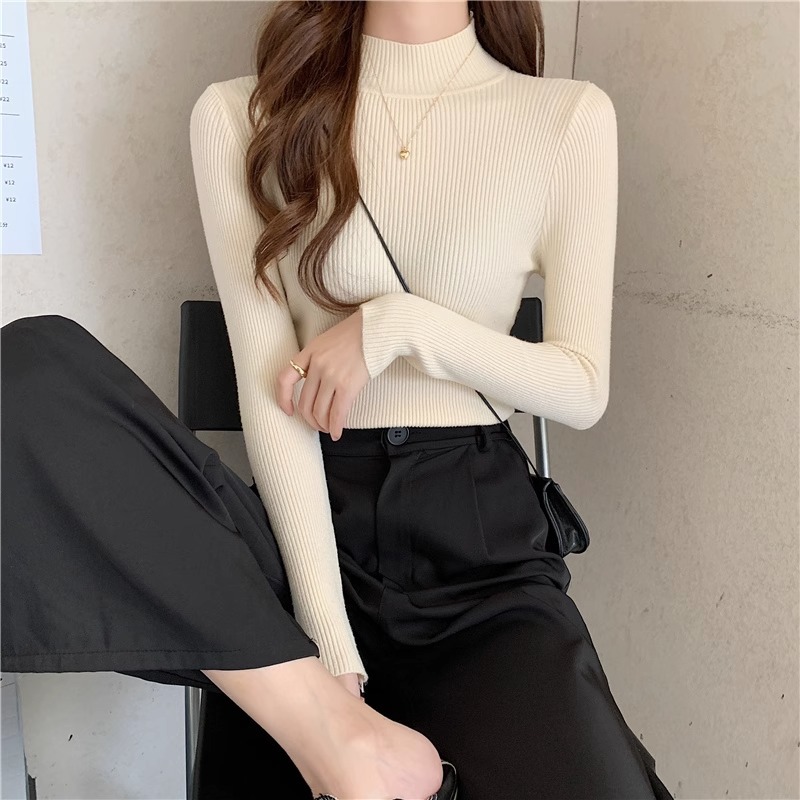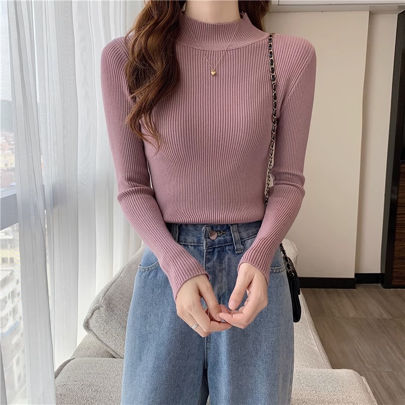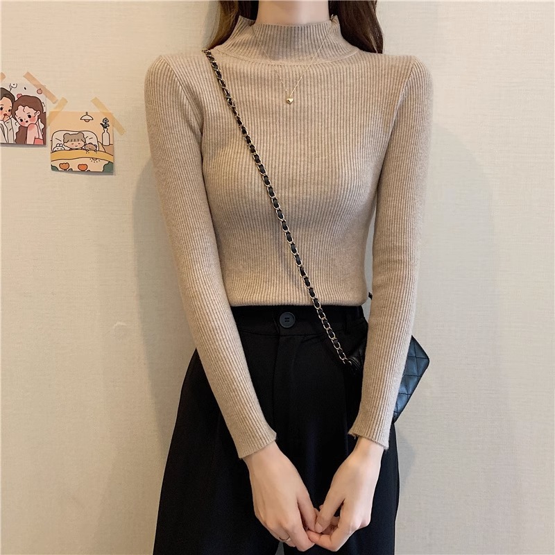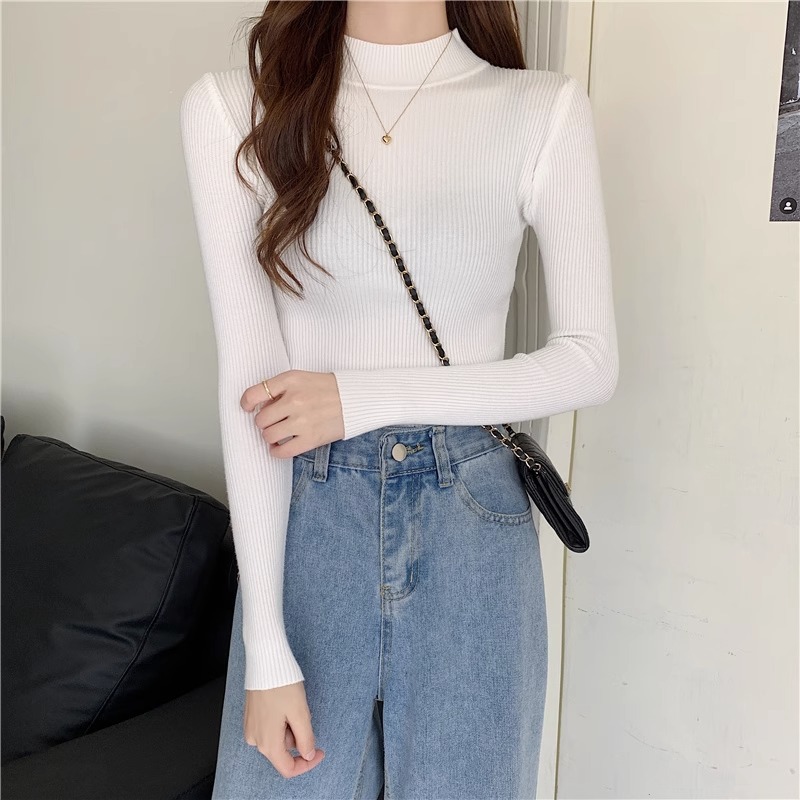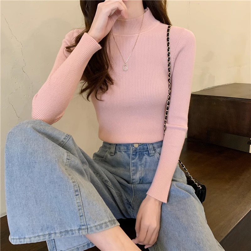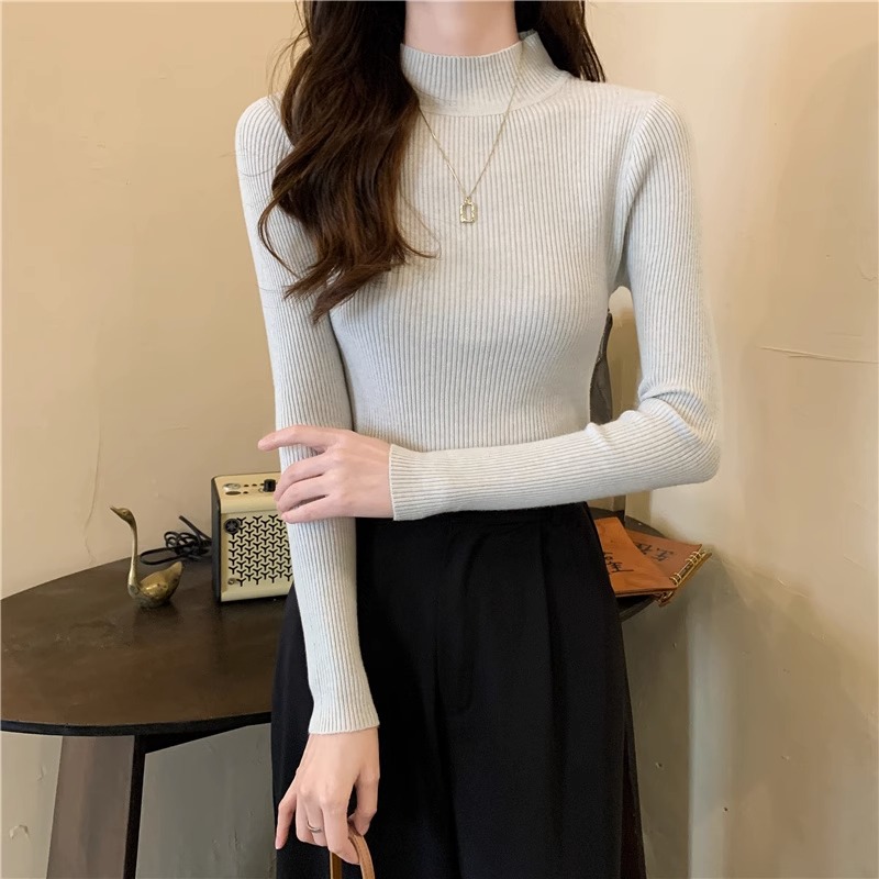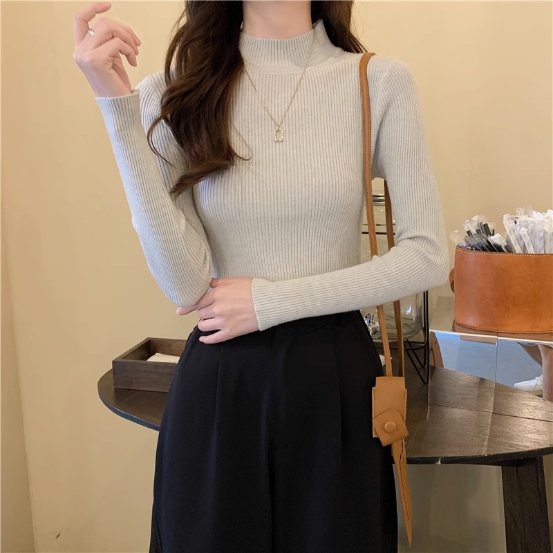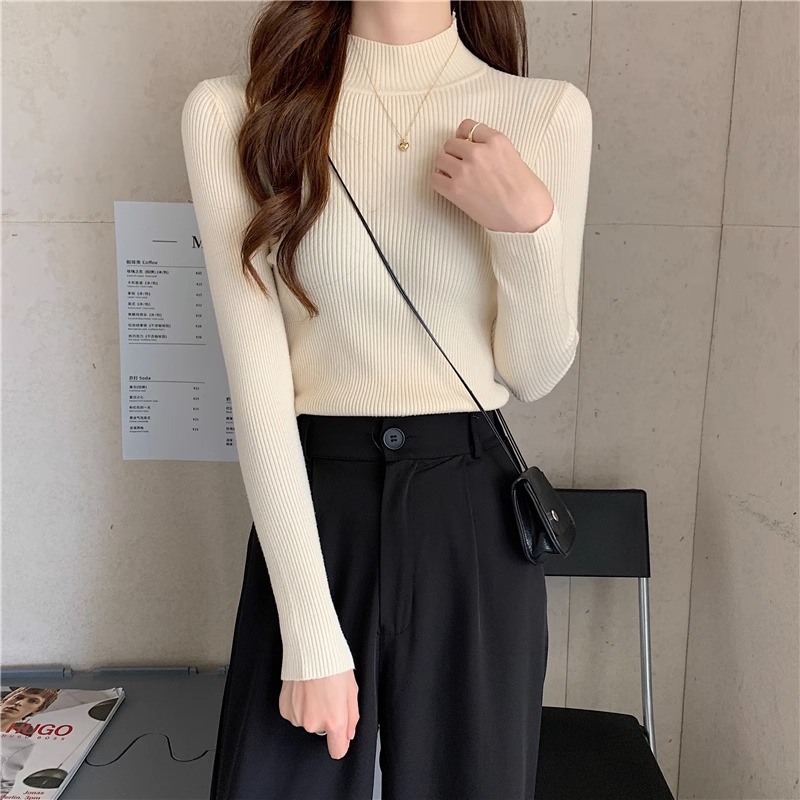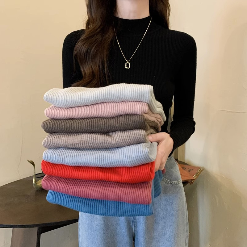 이른 가을 얇은 반 터틀넥 슬림 핏 긴팔 니트 스웨터 여자 올 매치 기본 탄성 내베이스 셔츠 탑스토어 가기