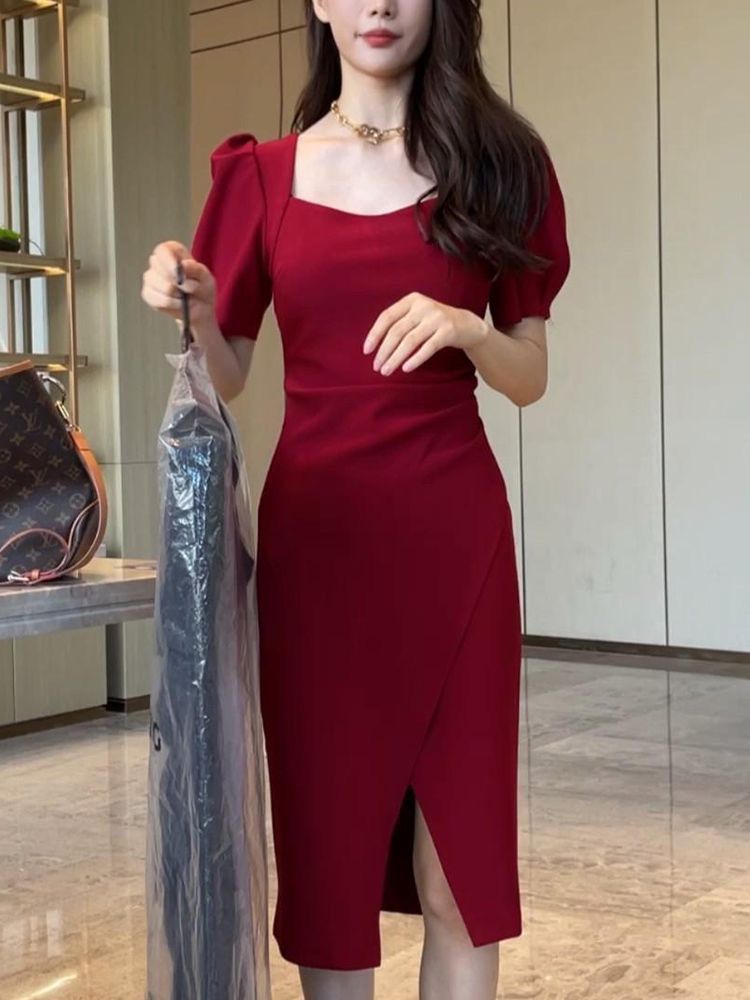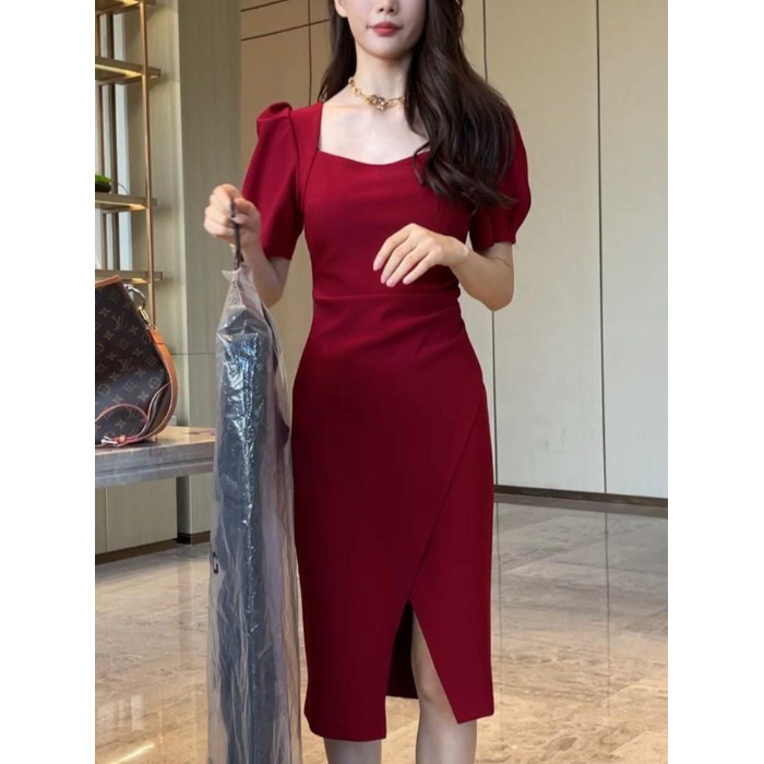 (등 지퍼 포함) 한국 기질 스퀘어 칼라 원피스 디자인 느낌 버블 슬리브 중간 길이 분할 엉덩이 스커트
