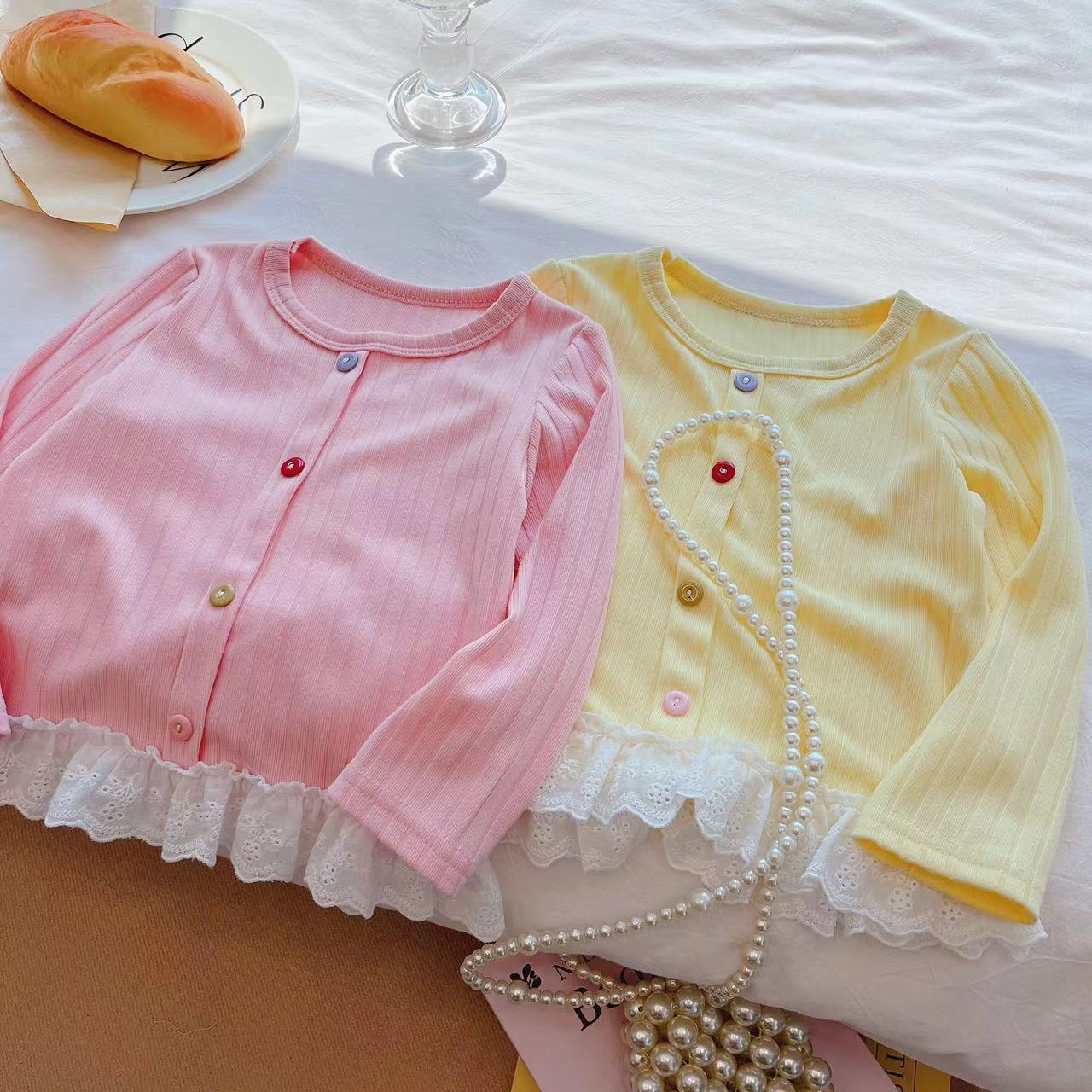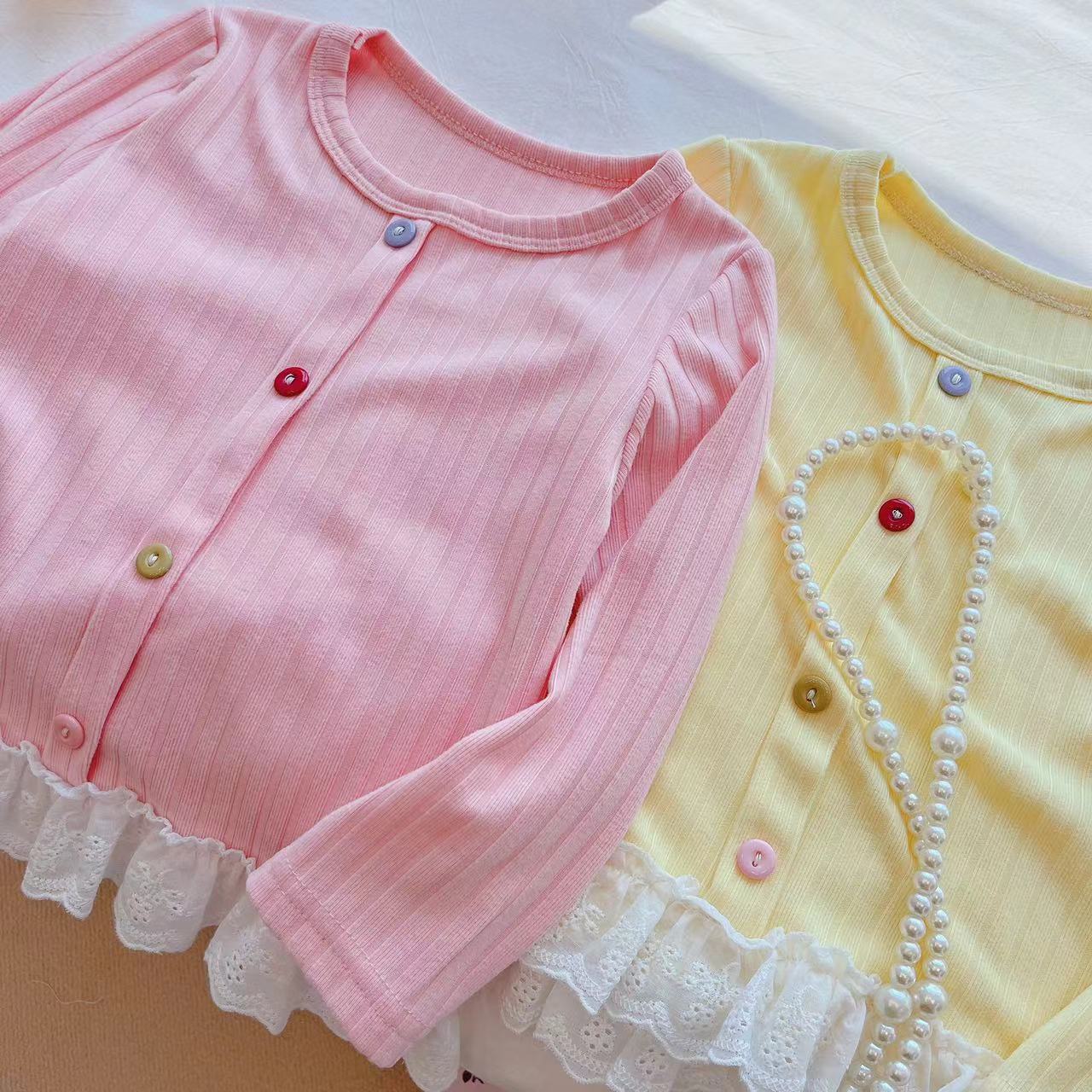 2024 새로운 소녀 가을베이스 셔츠 긴팔 티셔츠 서양식 올 매치 어린이 스위트 레이스 탑