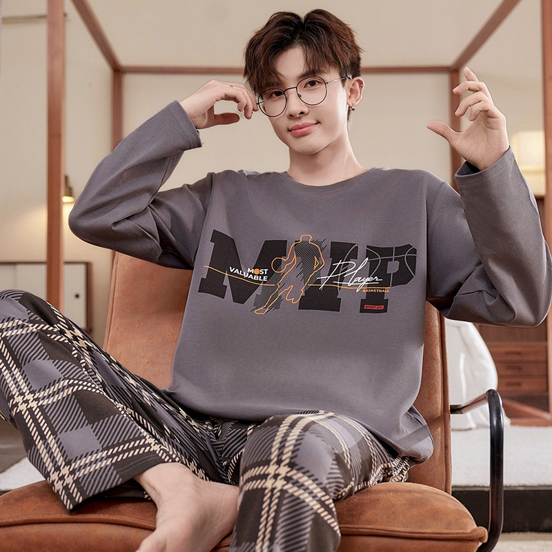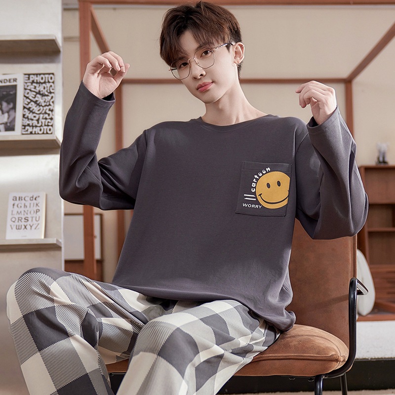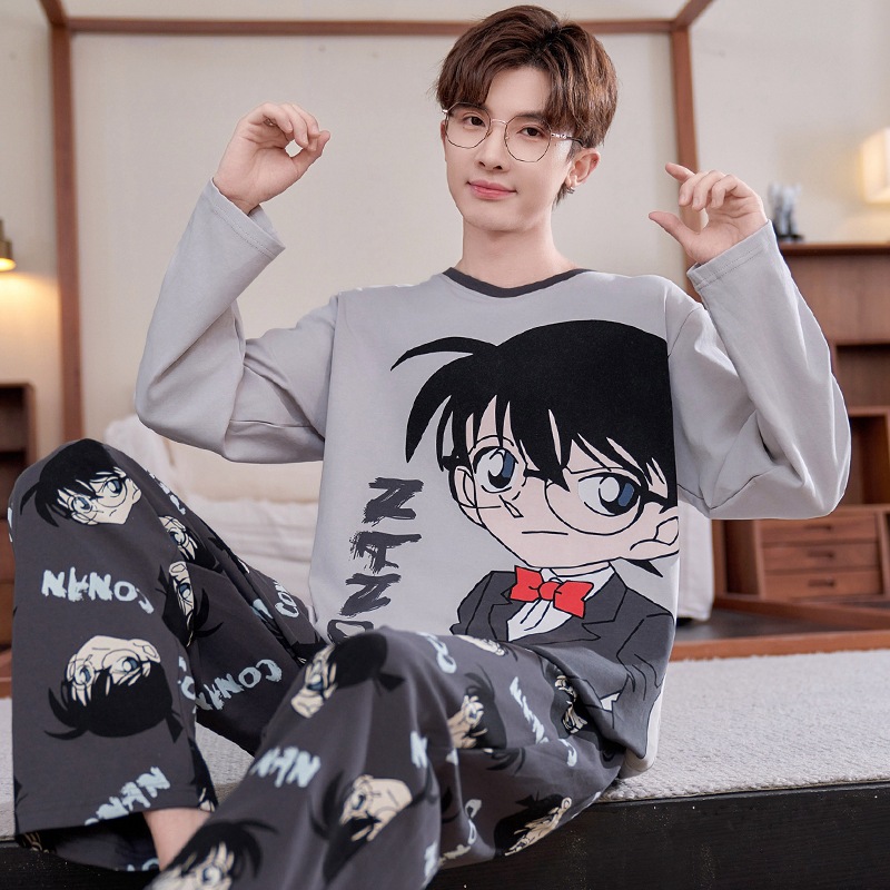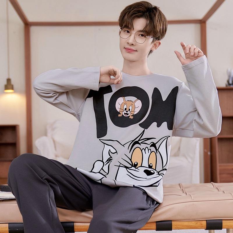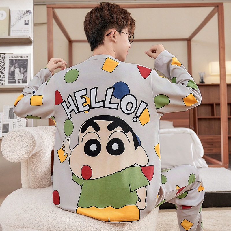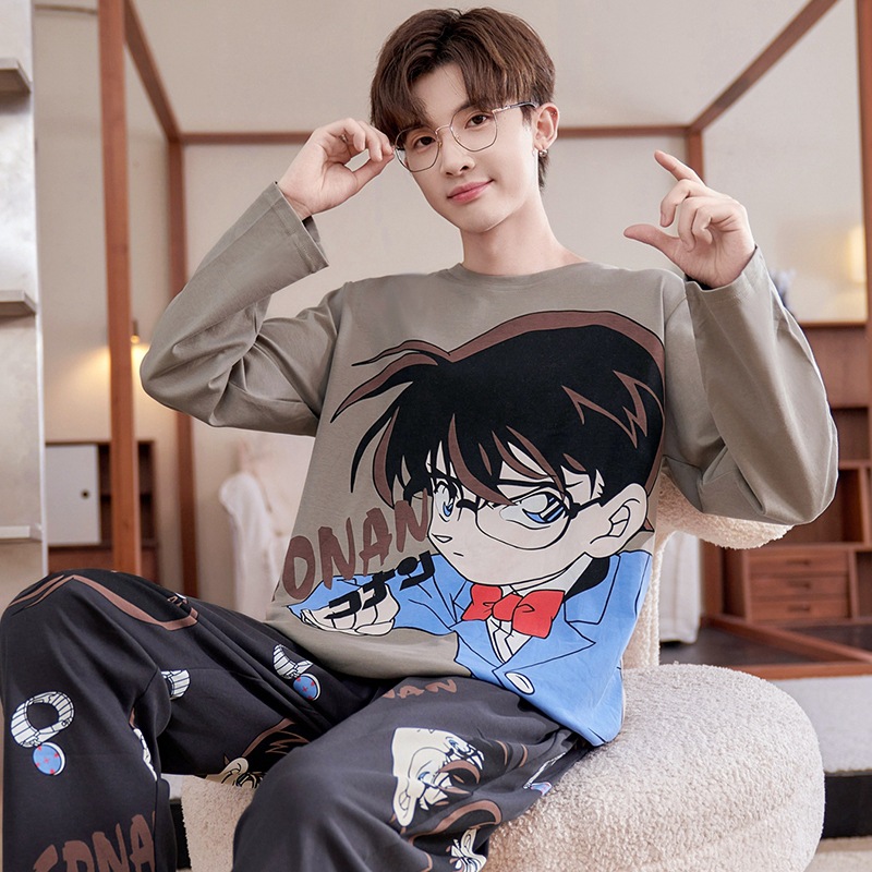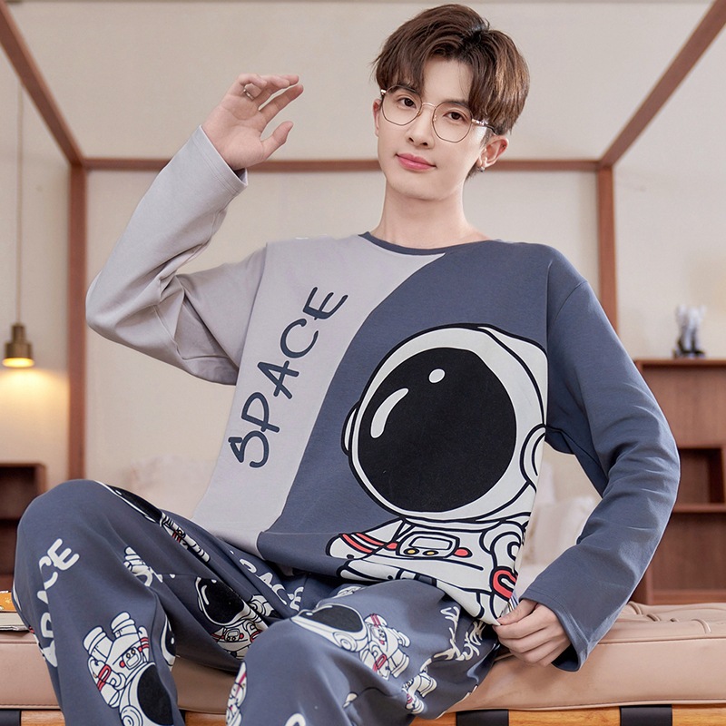 봄과 가을 코튼 파자마 남자의 겨울과 여름 풀오버 면화 청소년 느슨한 만화 의상 홈 옷 투피스 세트스토어 가기