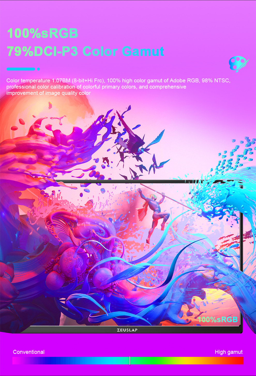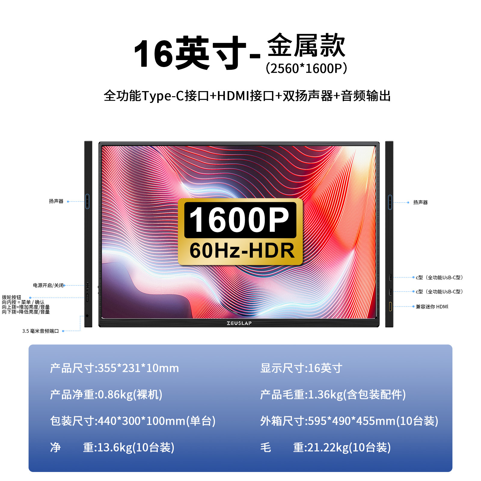 ZEUSLAP Zeus P25K 16 인치 휴대용 디스플레이 2.5k 60hz100 컬러 영역 휴대 전화 컴퓨터 디스플레이