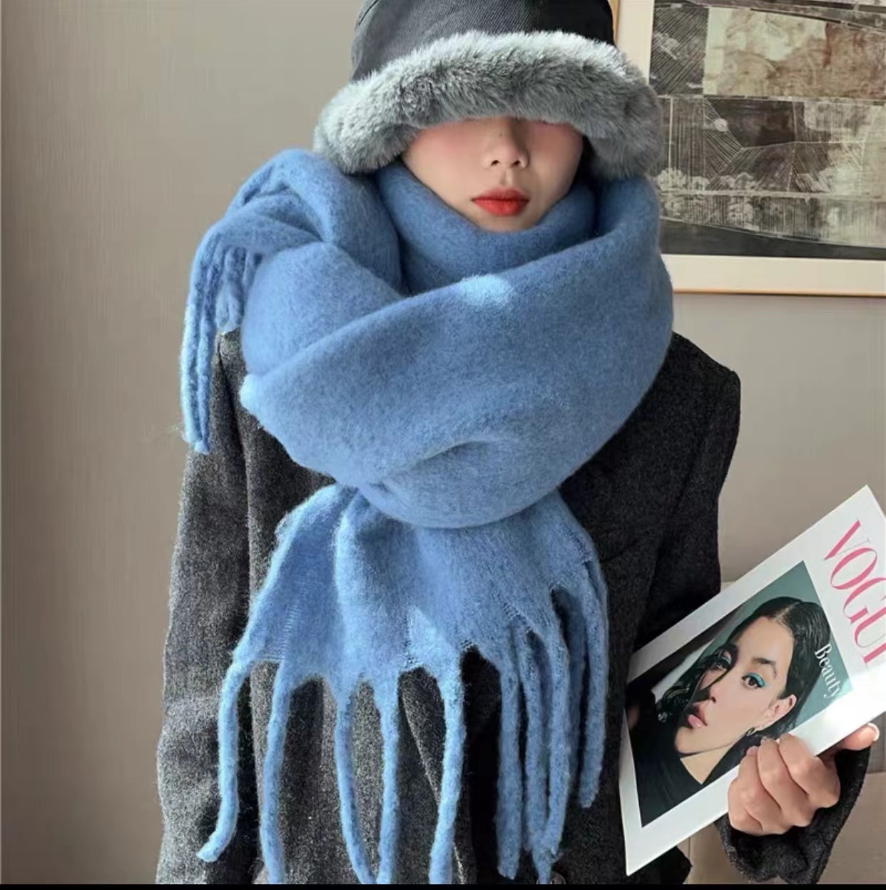 가을, 겨울 여성을위한 새로운 스타일 모헤어 부드럽고 밀랍 같은 푹신한 솔리드 컬러 스카프 겨울 다목적 모조 캐시미어 두꺼운 따뜻한 목도리 트렌드스토어 가기