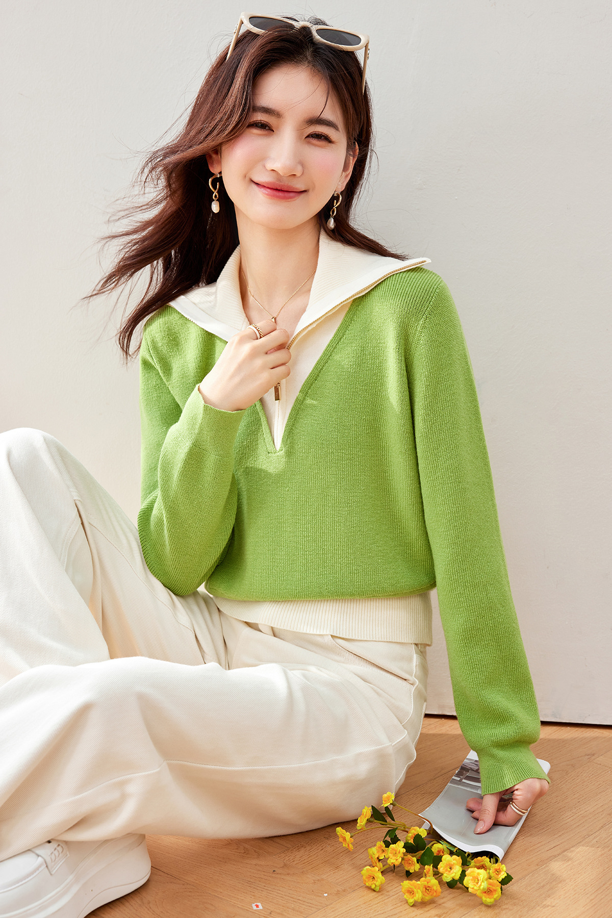 가짜 투피스 니트웨어 여성용 2024 가을 새 하프 오픈 폴로 넥 우아한 콘트라스트 컬러 탑 쇼트 스웨터