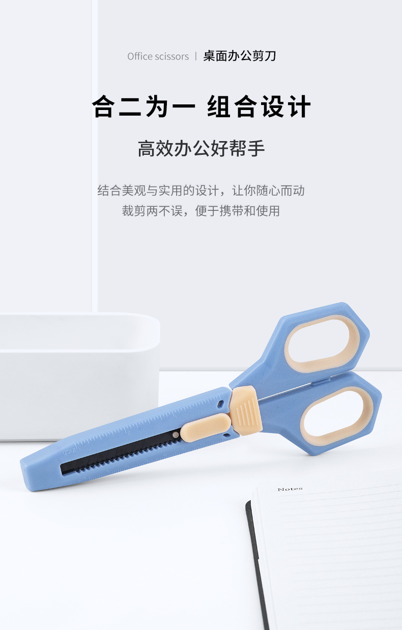 Fizz 새로운 다기능 2 대 1 가위 Teflon 사무실 유틸리티 칼 가위 조합 FZ21216 파란색과 흰색