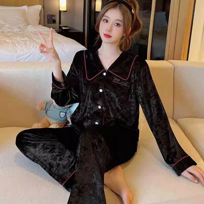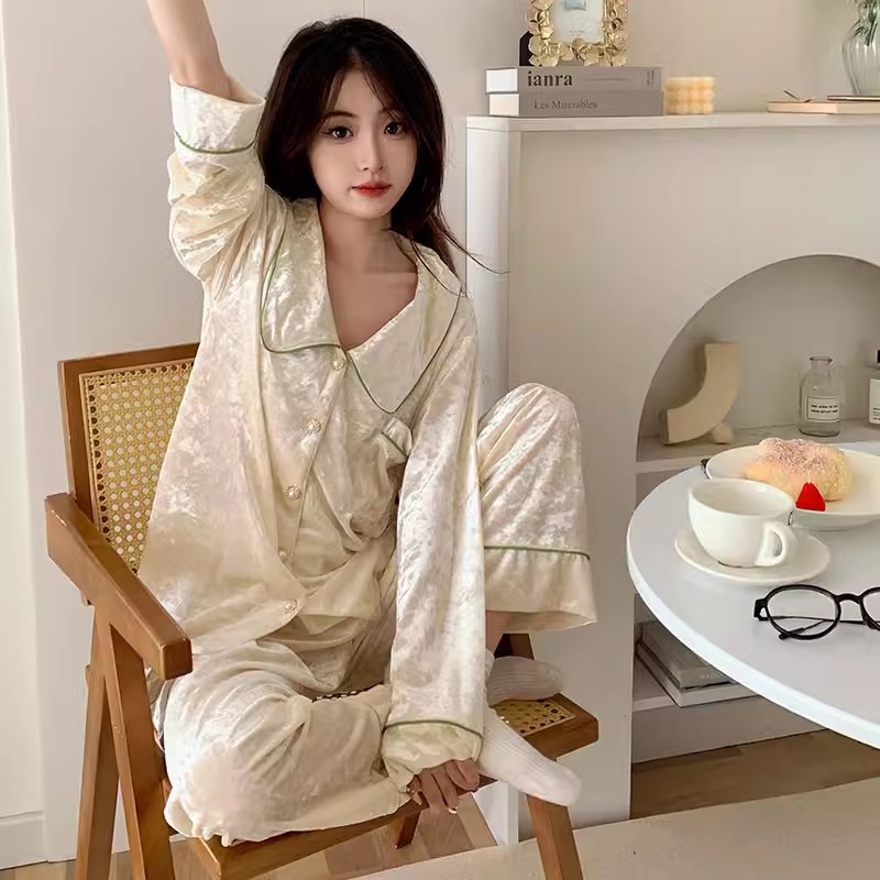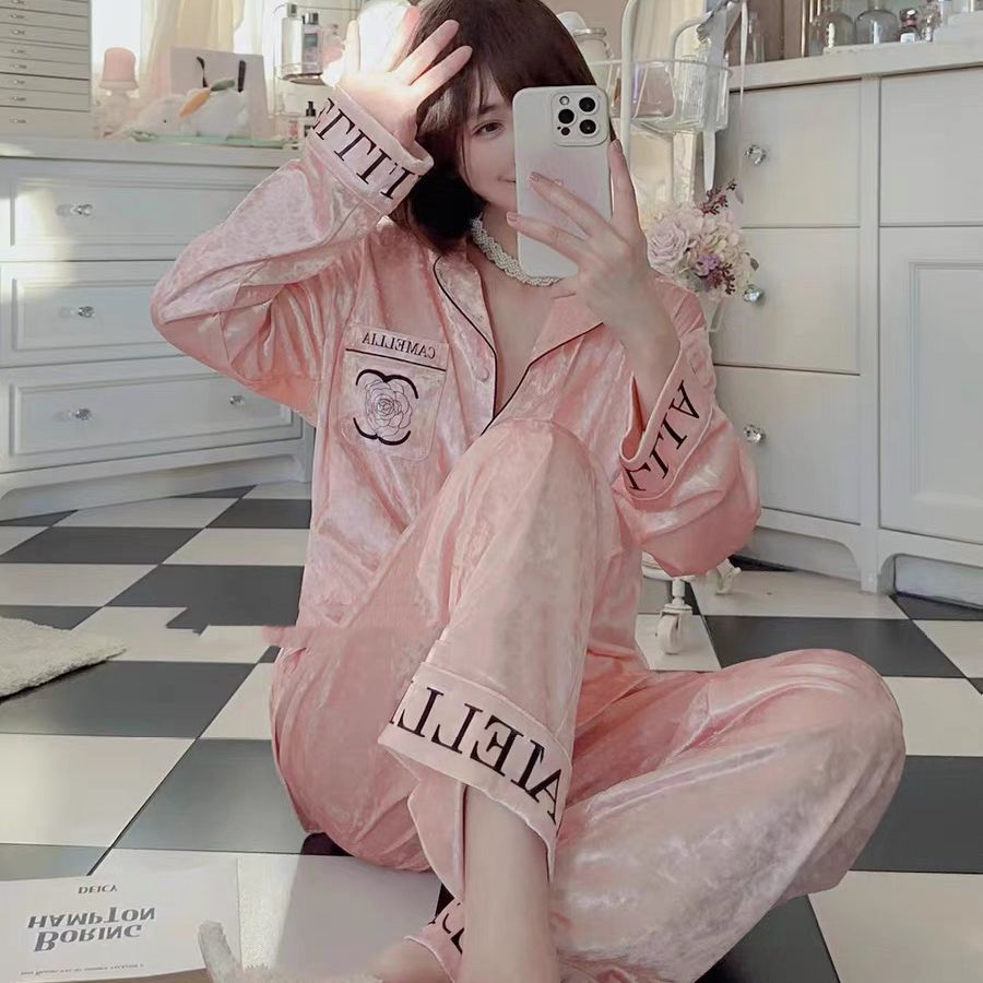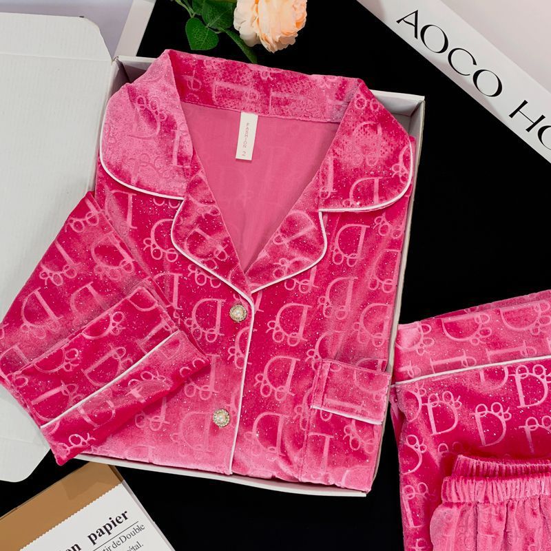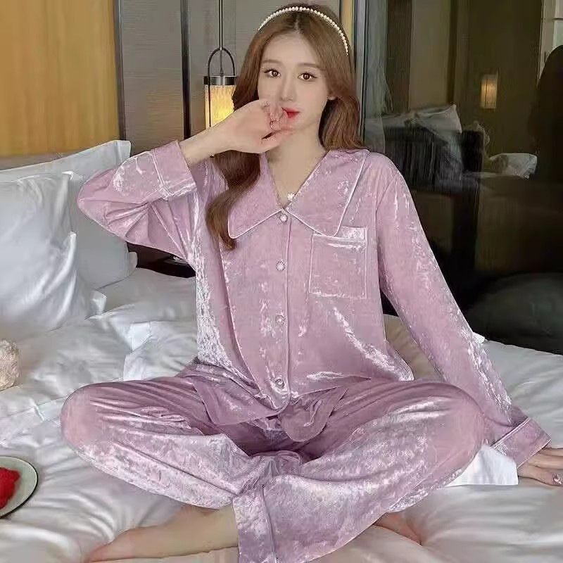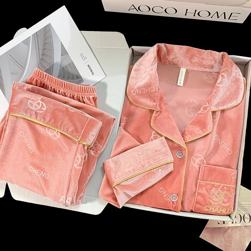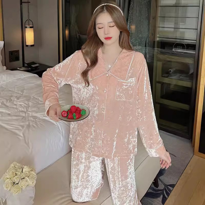 가을과 겨울 골드 다이아몬드 벨벳 새로운 잠옷 여성의 고급 순수 코트 스타일 달콤한 골드 벨벳 레저 홈 서비스 세트 공장스토어 가기