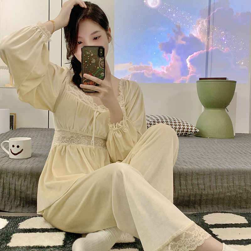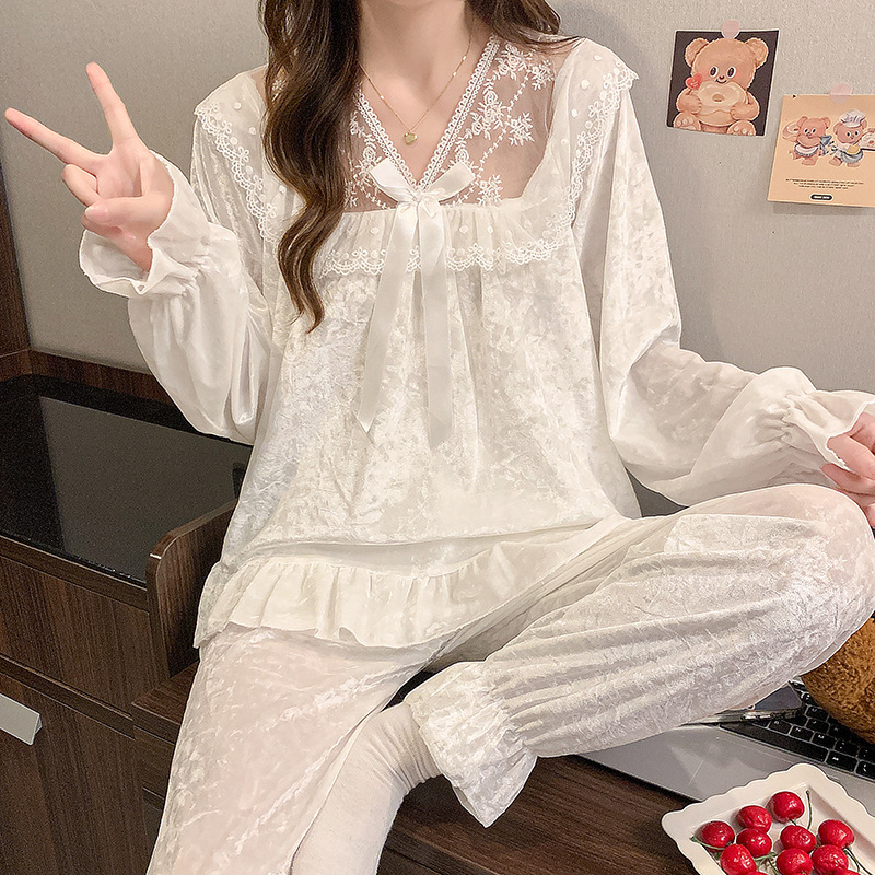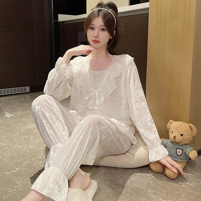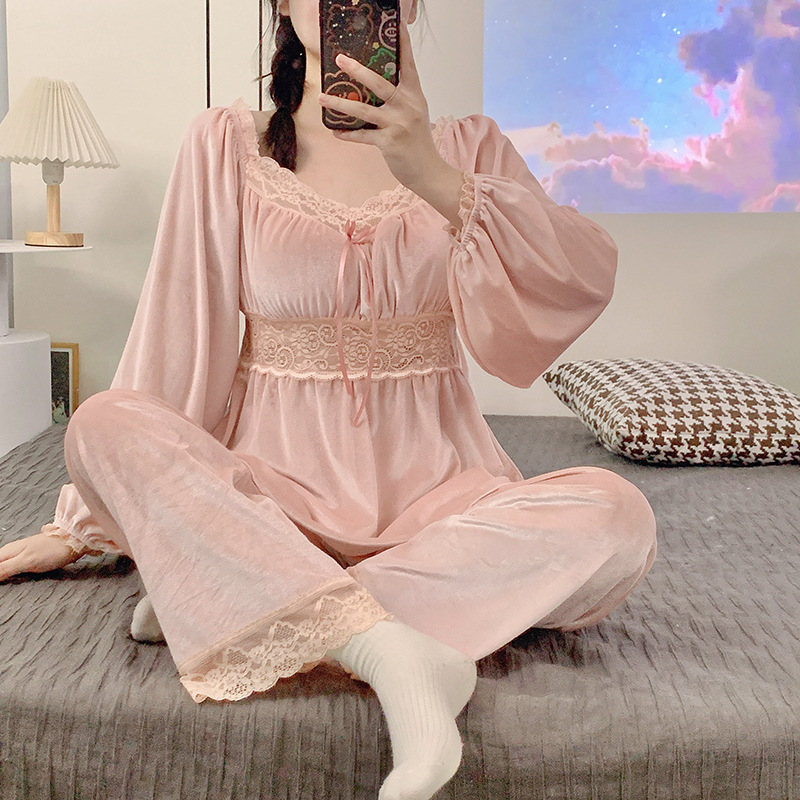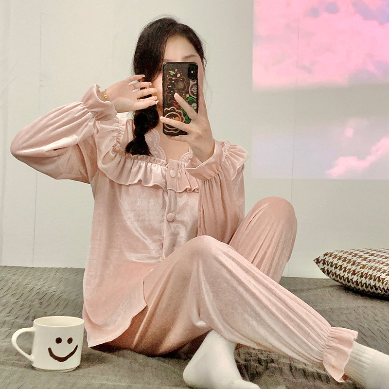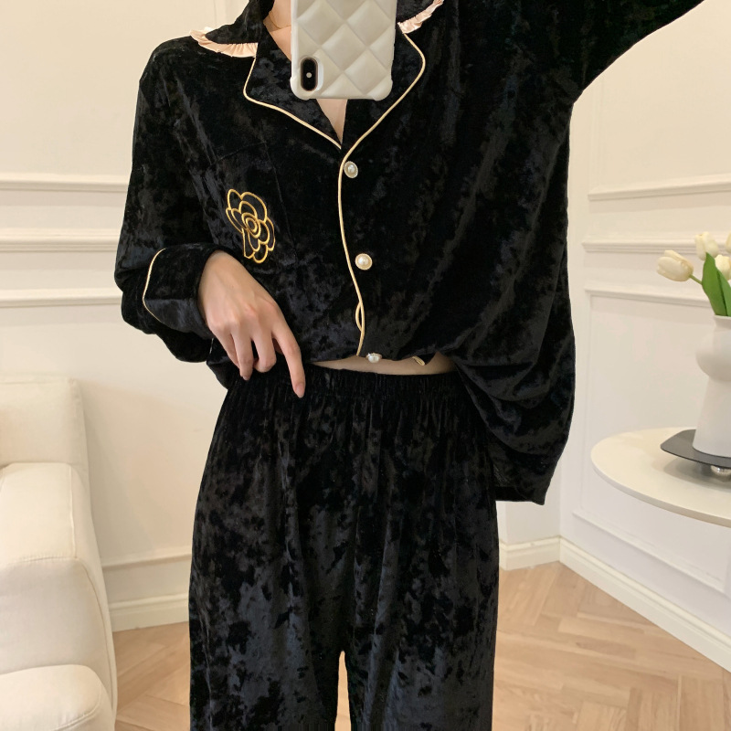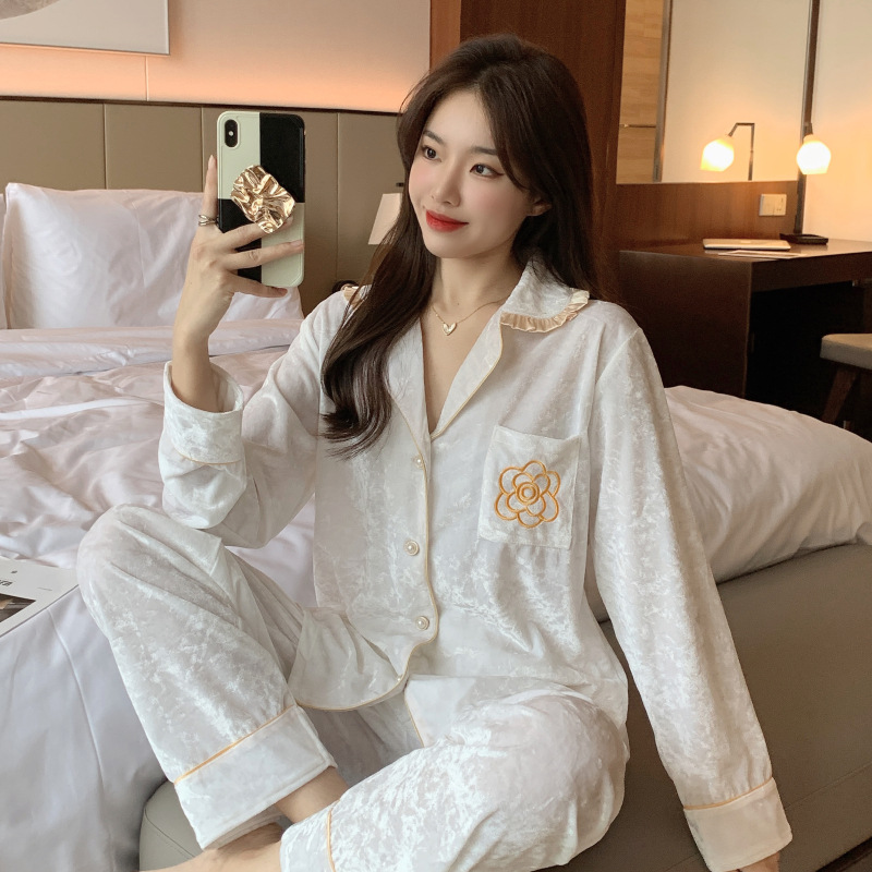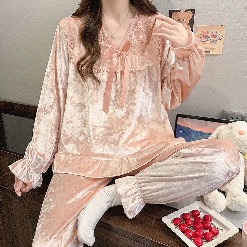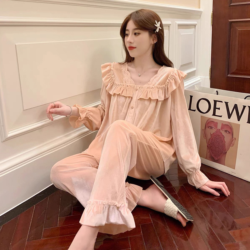 가을과 겨울 골드 다이아몬드 벨벳 새로운 잠옷 여성의 고급 순수 코트 스타일 달콤한 골드 벨벳 레저 홈 서비스 세트 공장