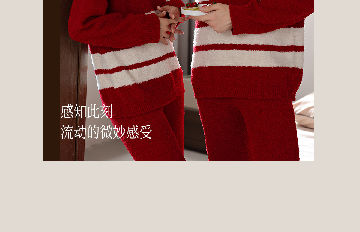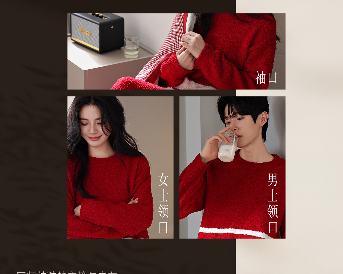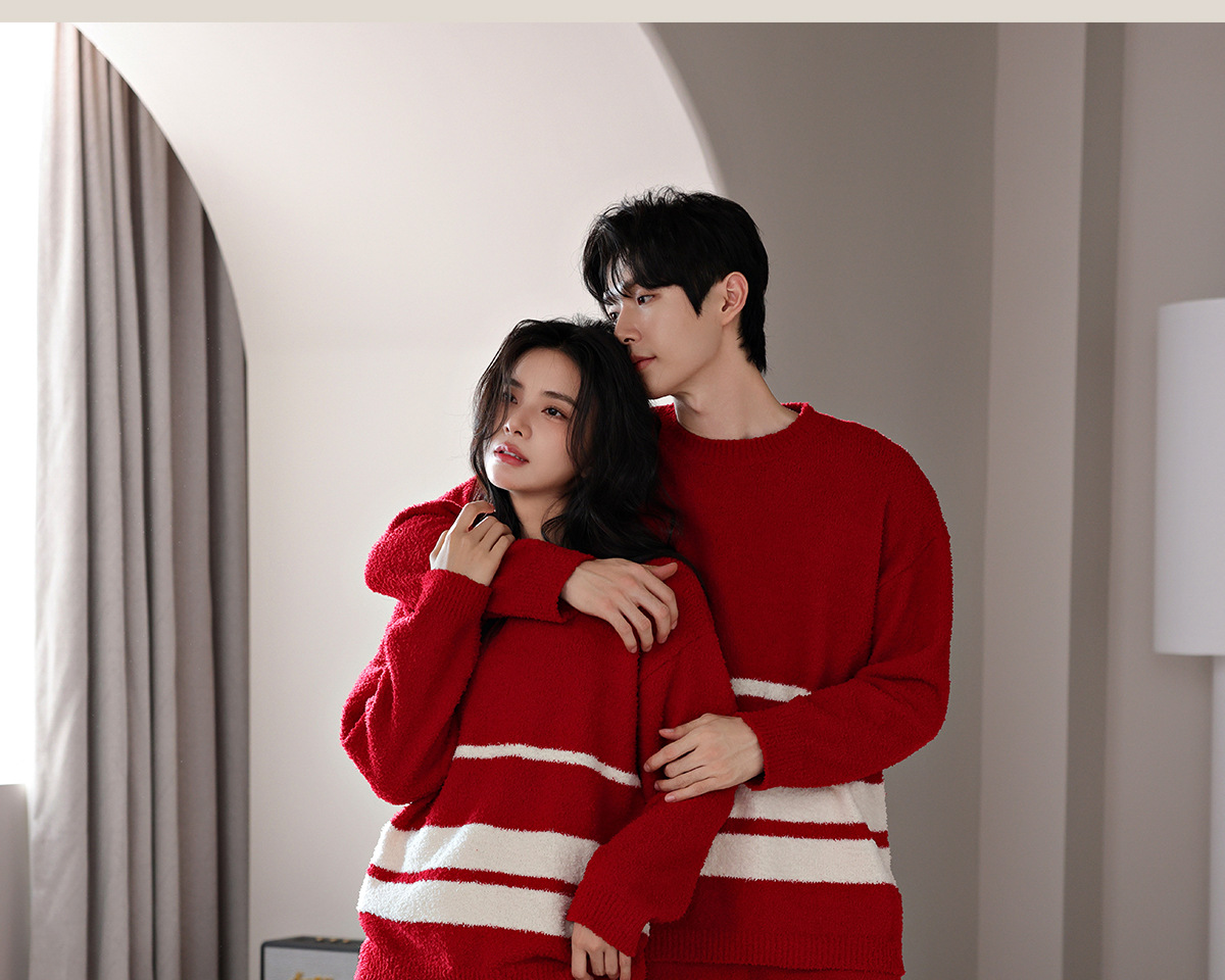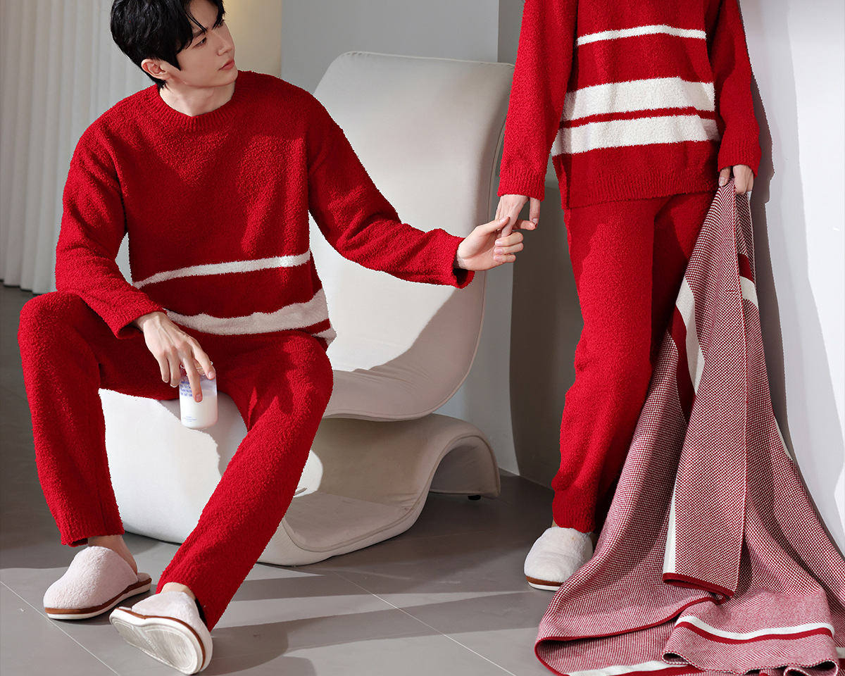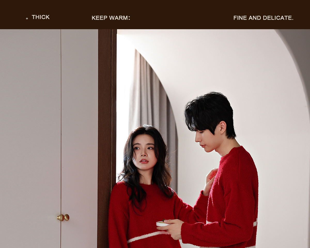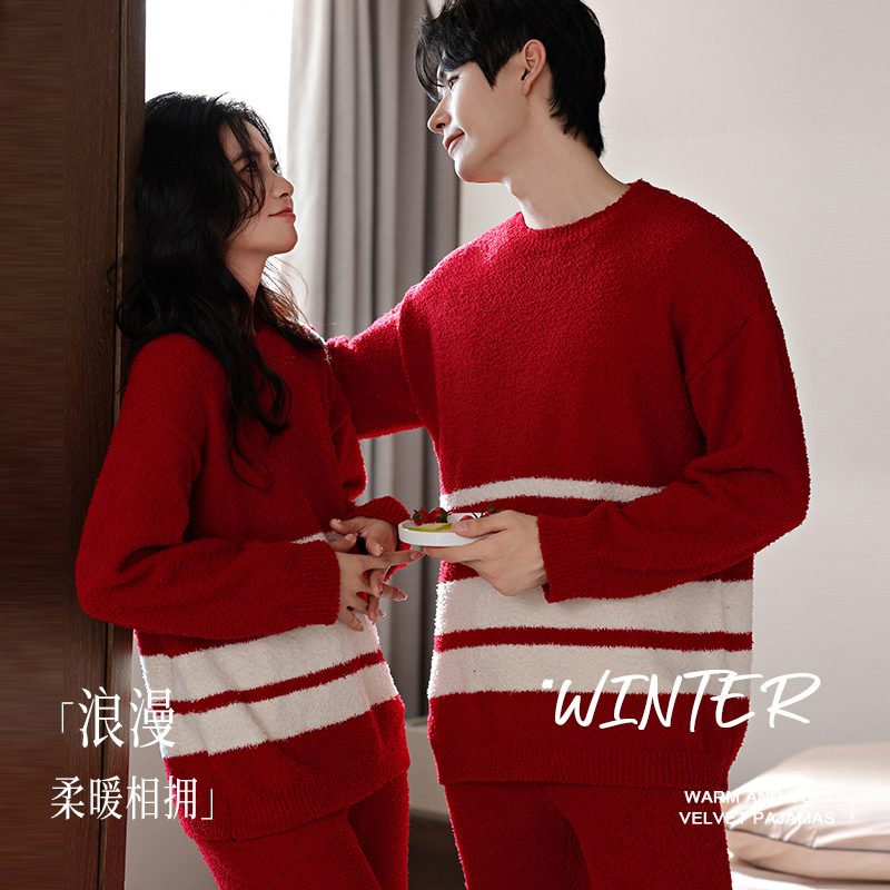 【부드러운 반양털】가을 겨울 커플 잠옷 남녀용 산호색 두꺼운 보온 세트스토어 가기