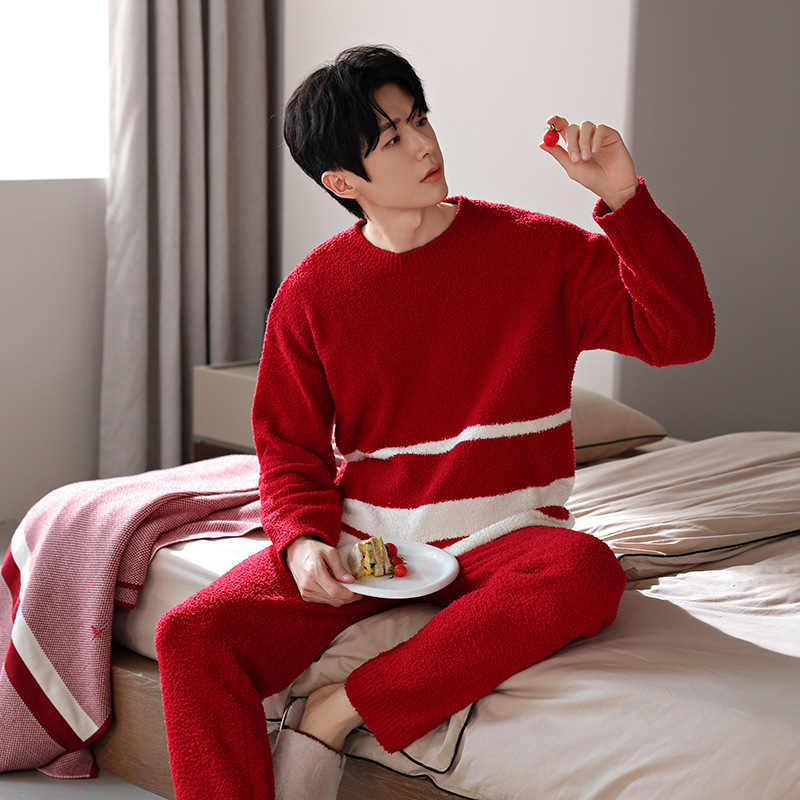 【부드러운 반양털】가을 겨울 커플 잠옷 남녀용 산호색 두꺼운 보온 세트