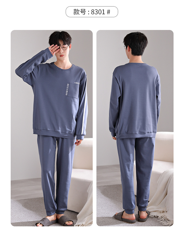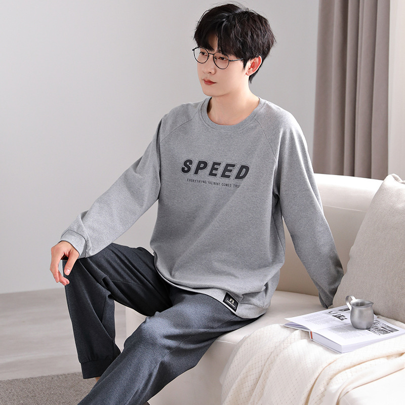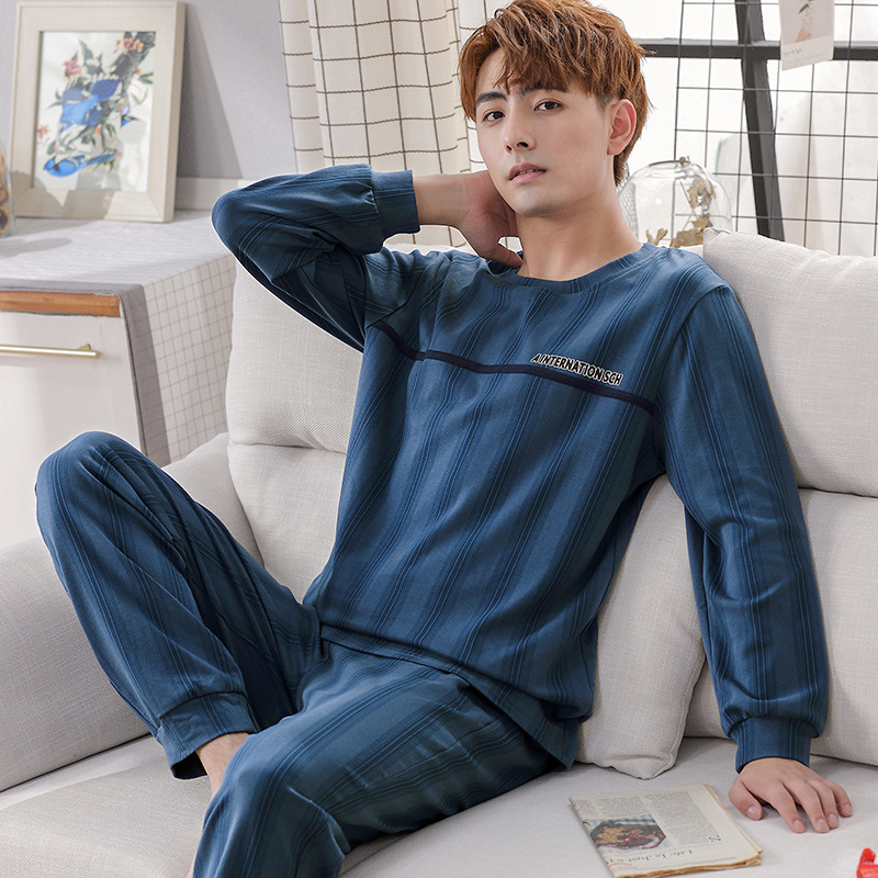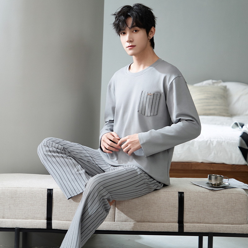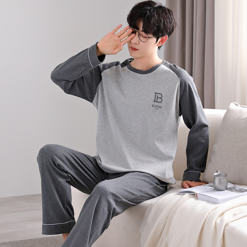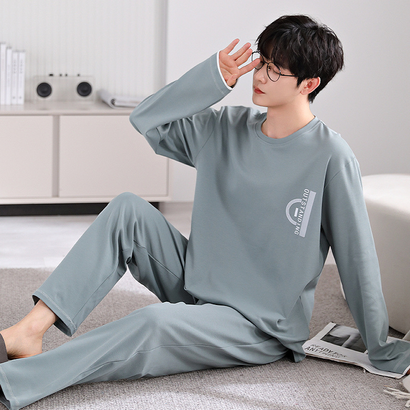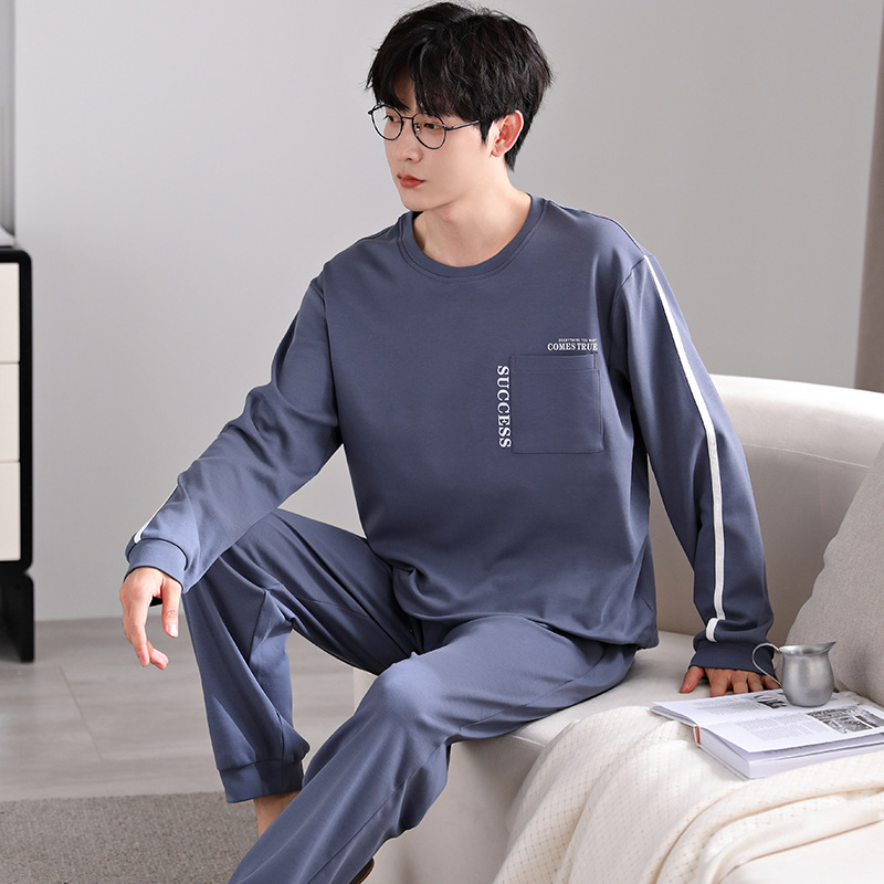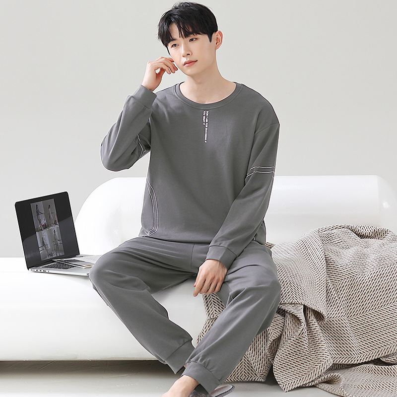 남성용 플러스 사이즈 100% 면 잠옷, 가을 겨울 순면 긴팔 라운드 넥, 피부 친화적인 학생용 아우터웨어, 봄 가을 홈웨어 세트스토어 가기