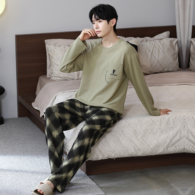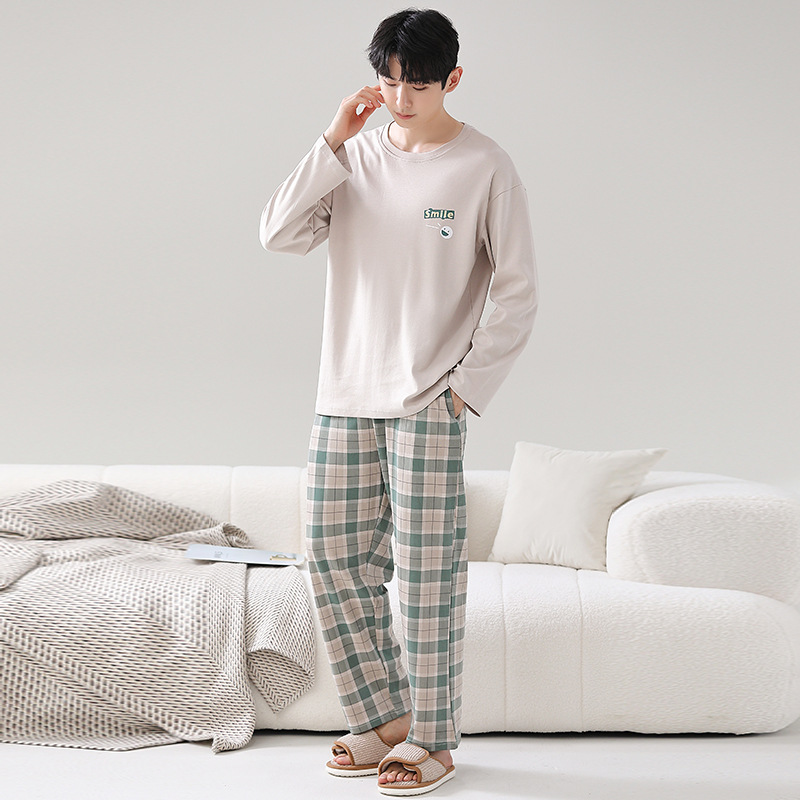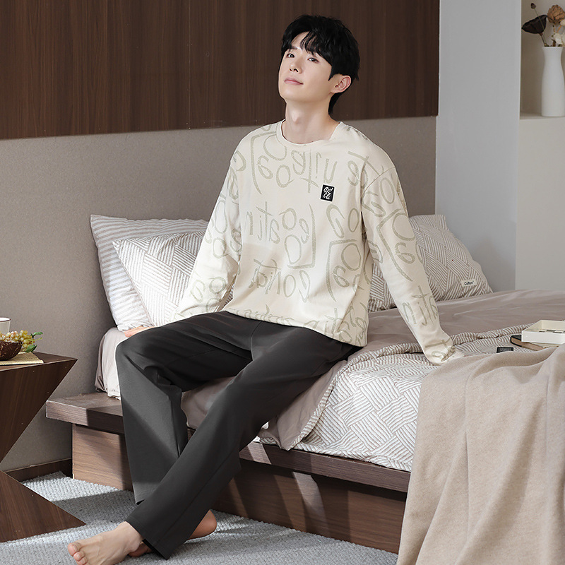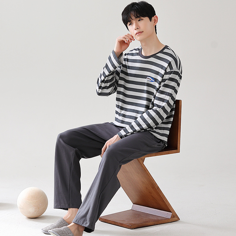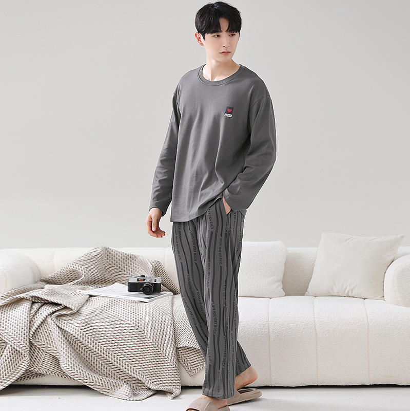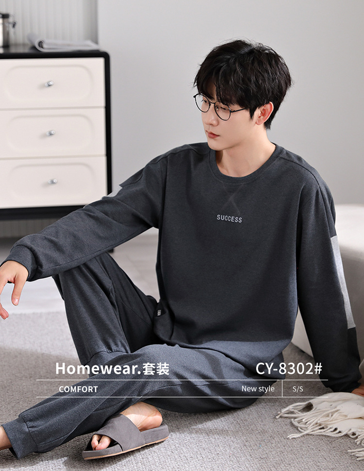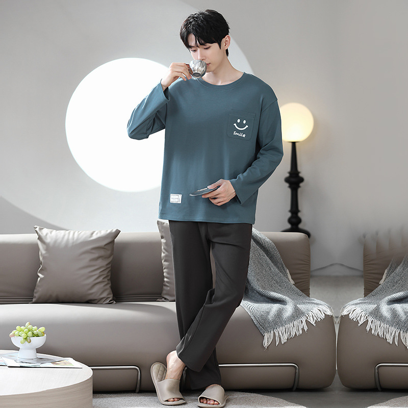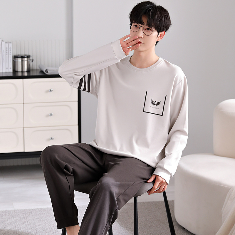 남성용 플러스 사이즈 100% 면 잠옷, 가을 겨울 순면 긴팔 라운드 넥, 피부 친화적인 학생용 아우터웨어, 봄 가을 홈웨어 세트스토어 가기