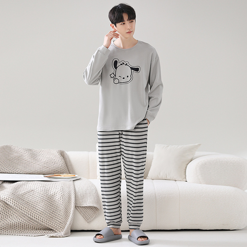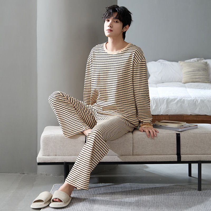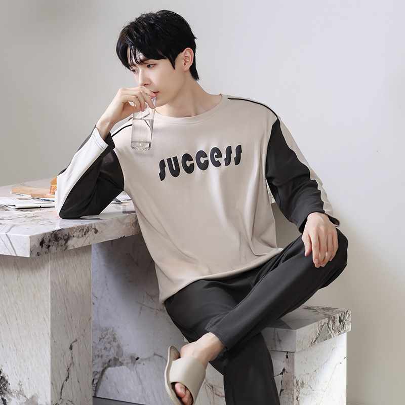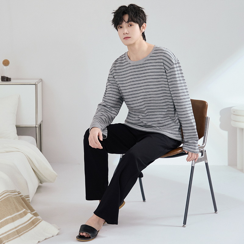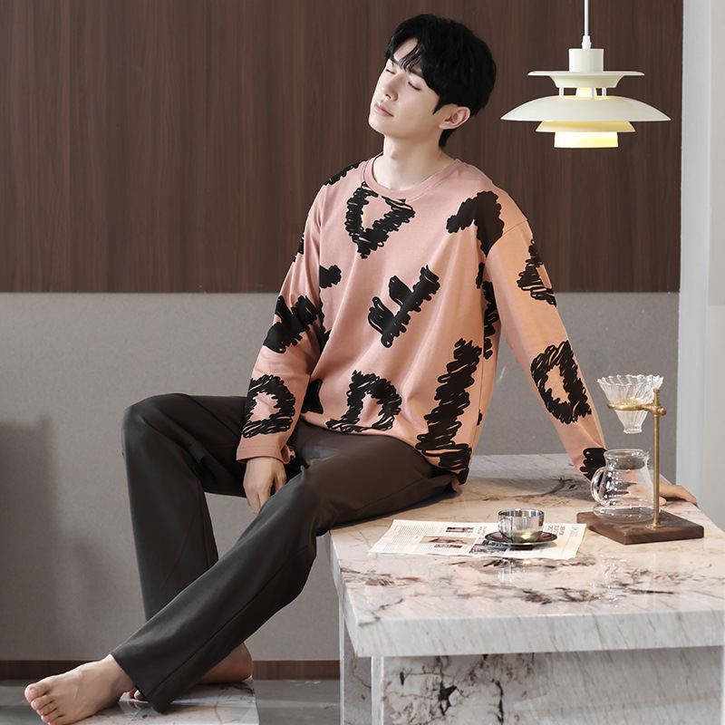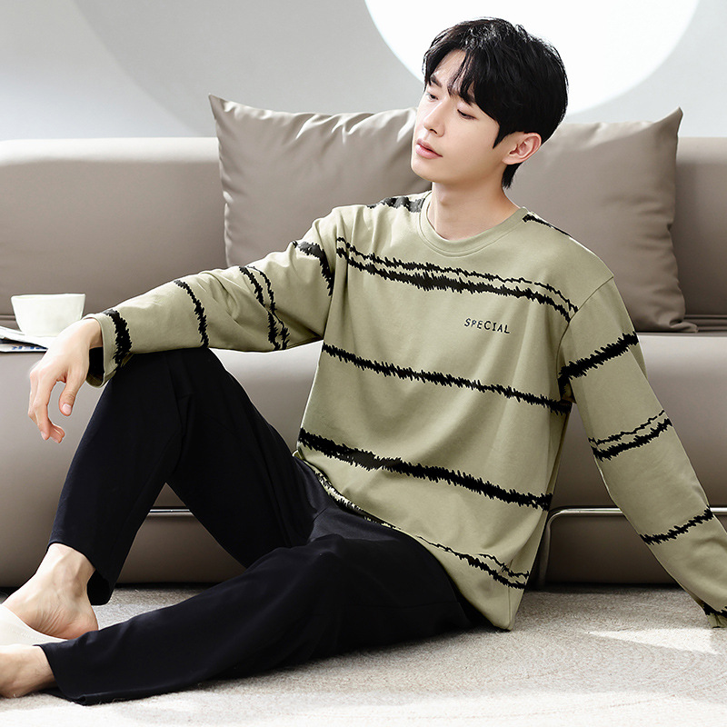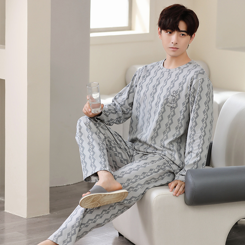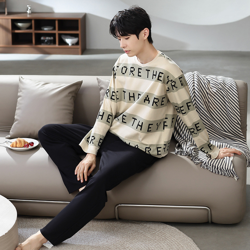 남성용 플러스 사이즈 100% 면 잠옷, 가을 겨울 순면 긴팔 라운드 넥, 피부 친화적인 학생용 아우터웨어, 봄 가을 홈웨어 세트스토어 가기