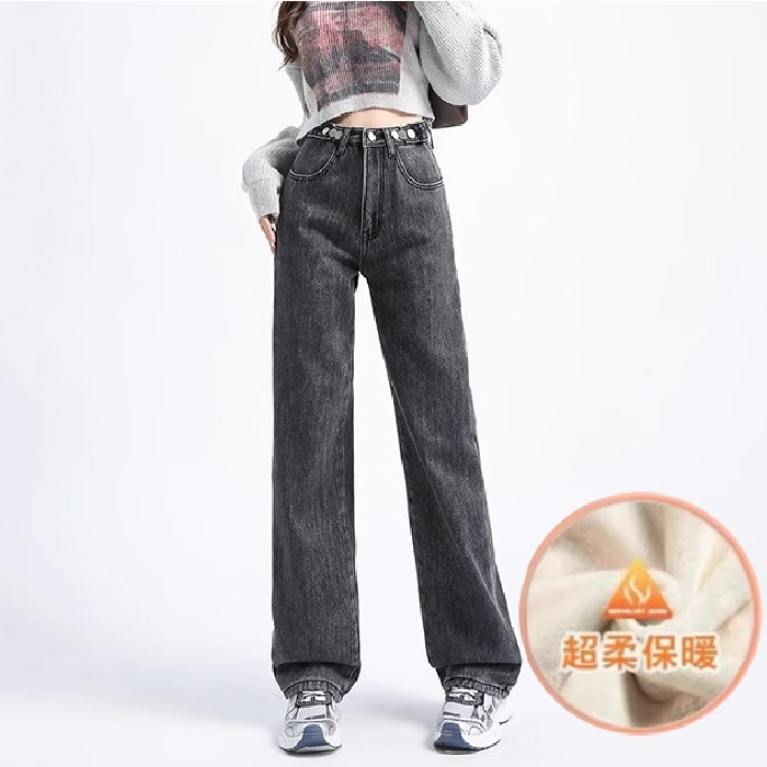 가을 겨울 여성용 벨벳 두꺼운 스트레이트 청바지 새로운 스타일 조절 가능한 허리 루즈하고 다재다능한 슬리밍 와이드 팬츠스토어 가기