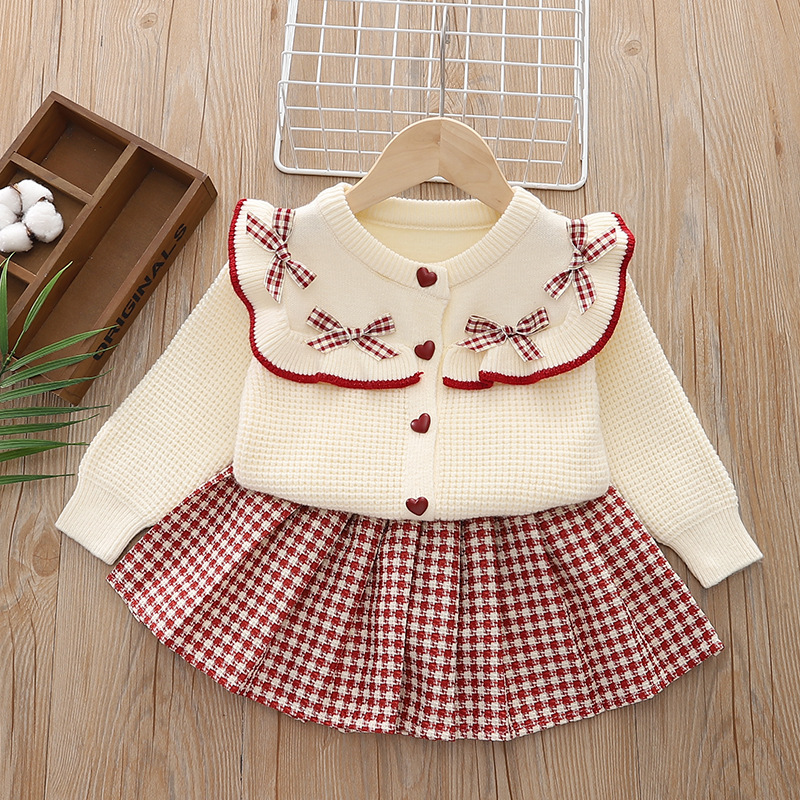 소녀 세트 2024 가을/겨울 새로운 빨간 아기 소녀 공주 원피스 어린이 니트 스웨터 2 피스 세트