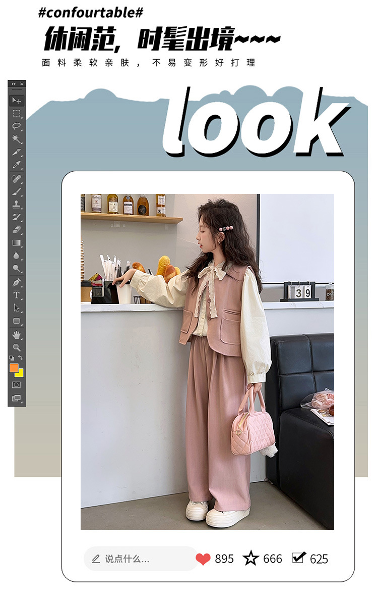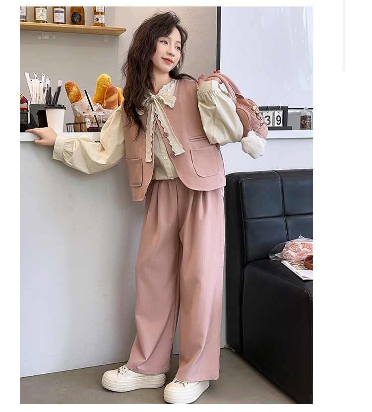 소녀의 이른 가을 착용 세트 2024 새로운 한국 스타일 유행 조끼 셔츠 넓은 다리 바지 달콤한 스타일 3 조각 세트스토어 가기