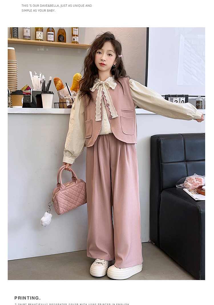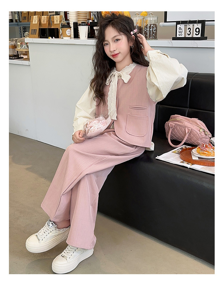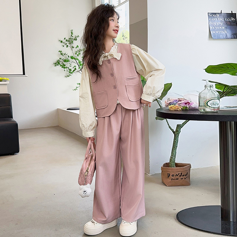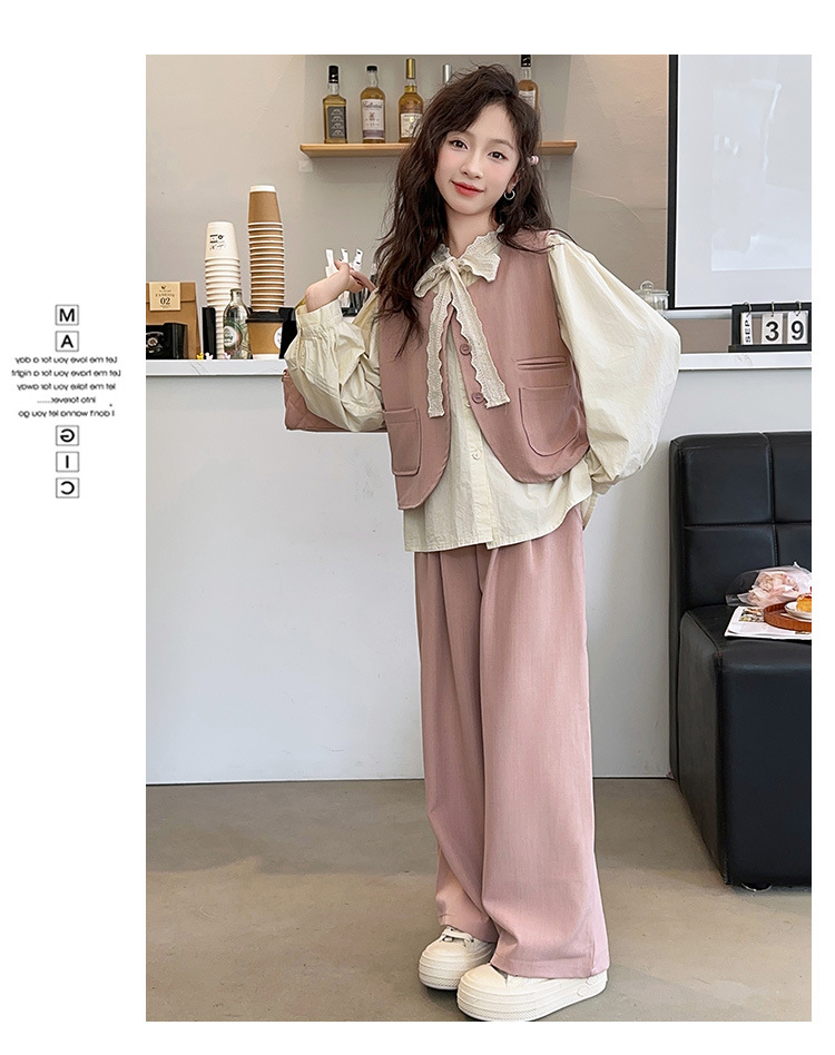 소녀의 이른 가을 착용 세트 2024 새로운 한국 스타일 유행 조끼 셔츠 넓은 다리 바지 달콤한 스타일 3 조각 세트