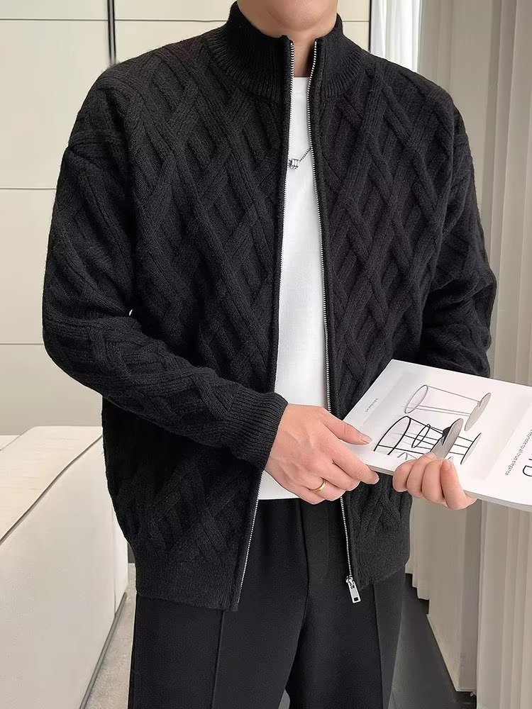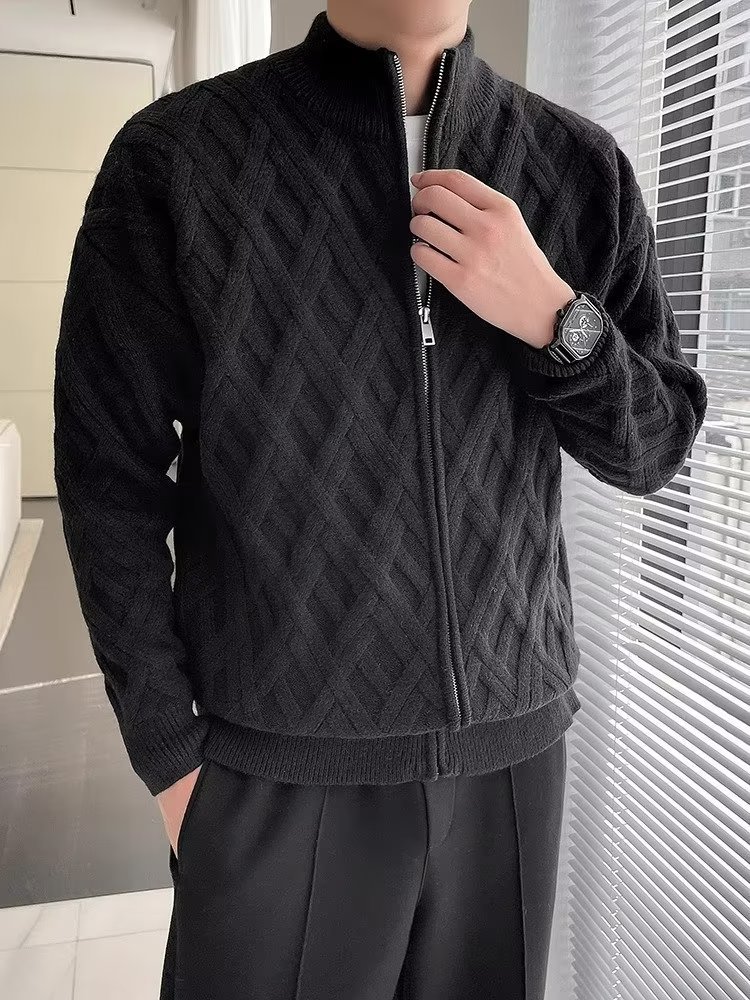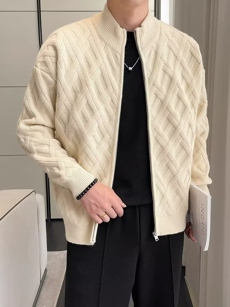 수직 칼라 카디건 니트 재킷 남자의 봄과 가을 새로운 2023 폭발 하이 엔드 센스 남성 격자 무늬 스웨터 재킷스토어 가기