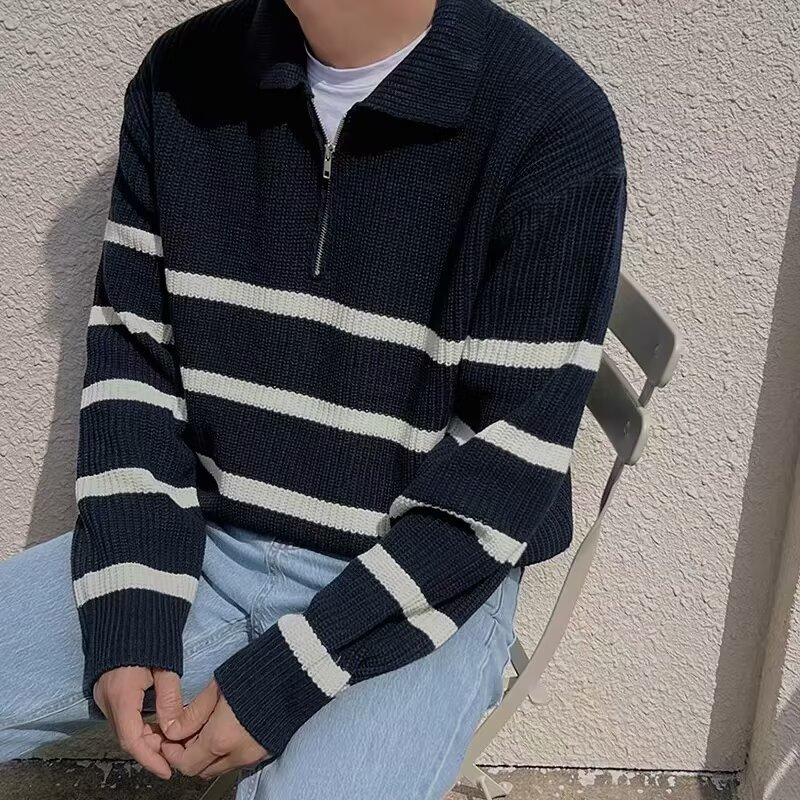 가을과 겨울 옷깃 긴 소매 스웨터 남자 한국 스타일 루즈 레트로 캐주얼 하프 지퍼 폴로 스트라이프 스웨터 탑