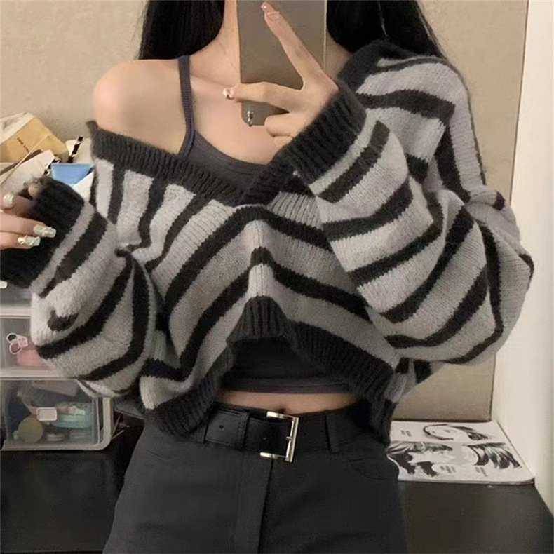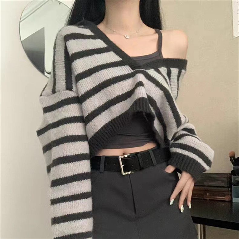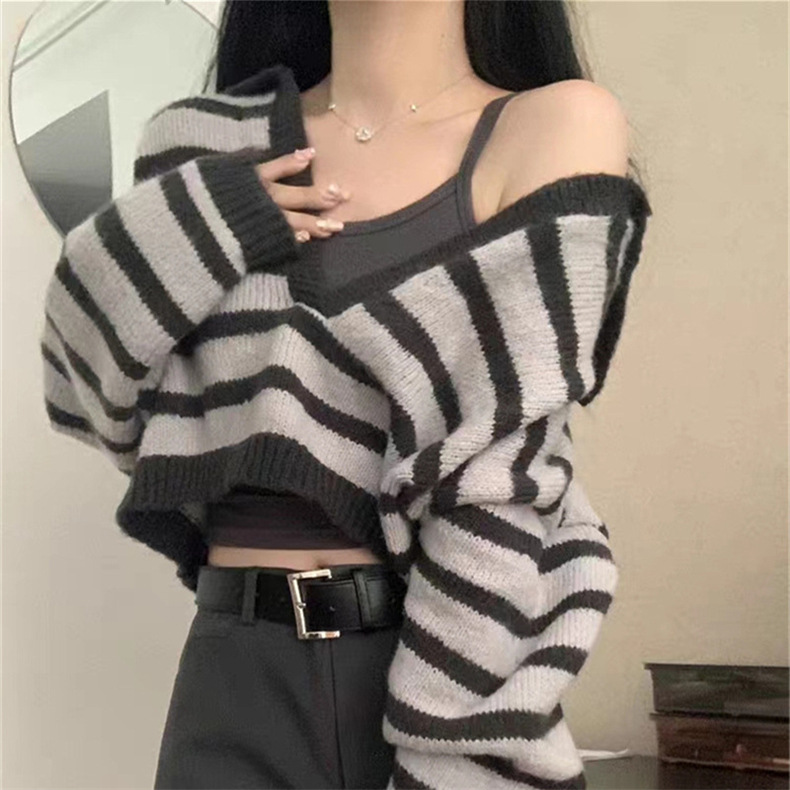 이른 가을 대학 소금부 스웨터 여성 2024 새로운 색상 매칭 스트라이프 V-넥 한국 우아한 긴 소매 니트 스웨터스토어 가기