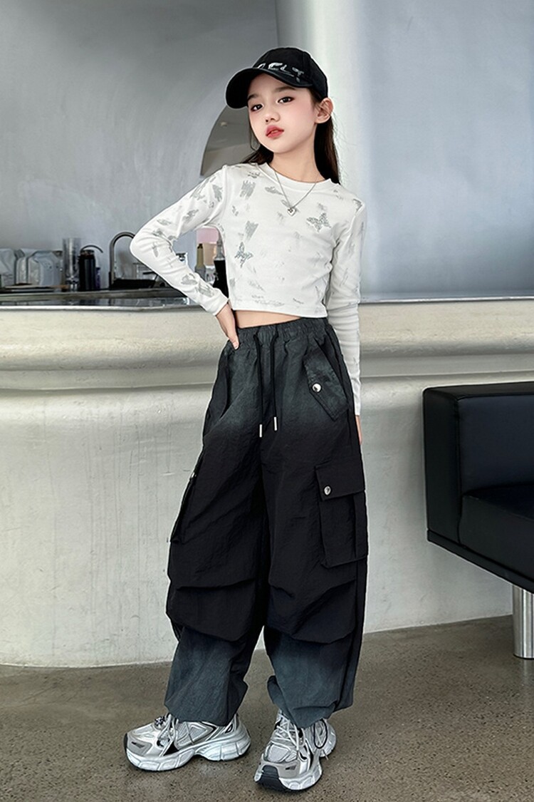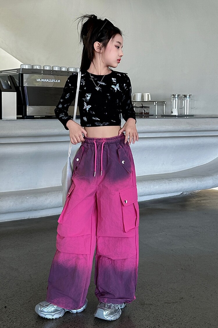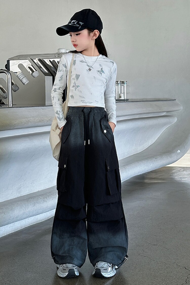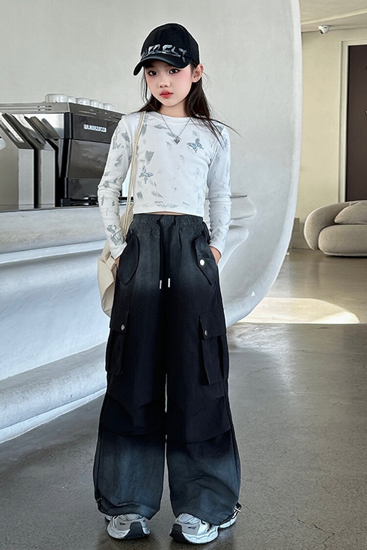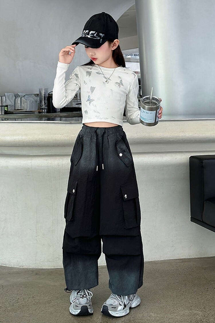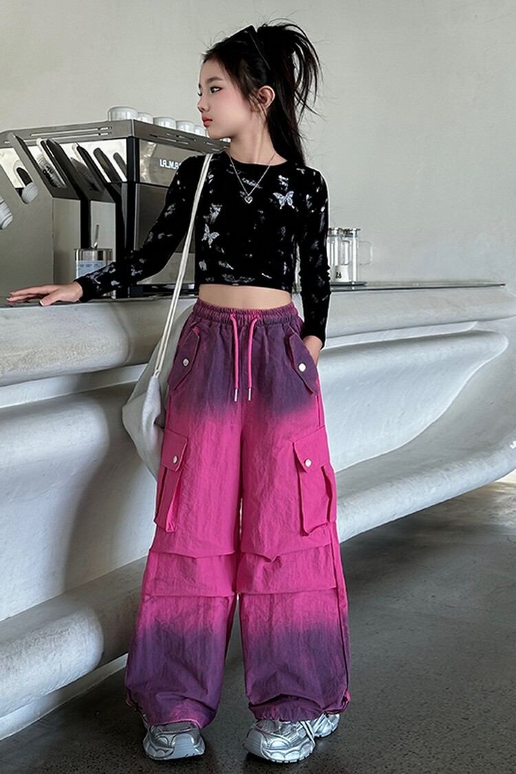국경 간 소녀 코일 바지 세트 트렌디 쿨 어린이 긴팔 나비 티셔츠 빛나는 와이드 레그 바지 2 피스 봄과 가을 세트