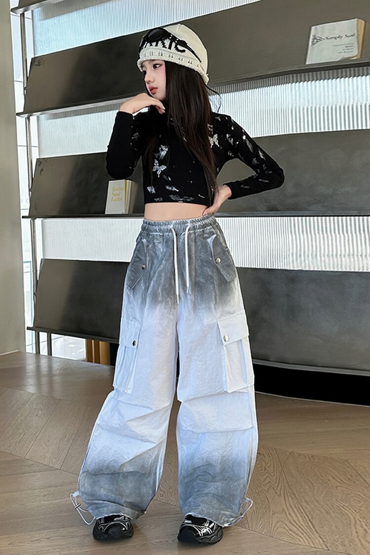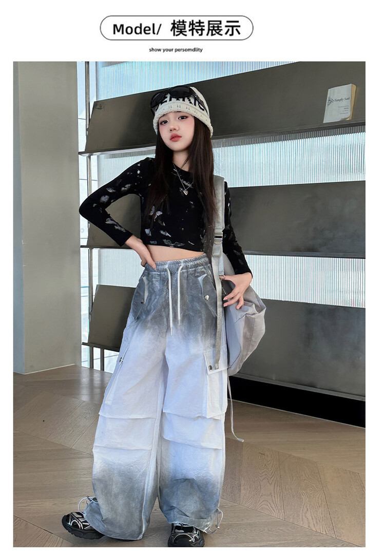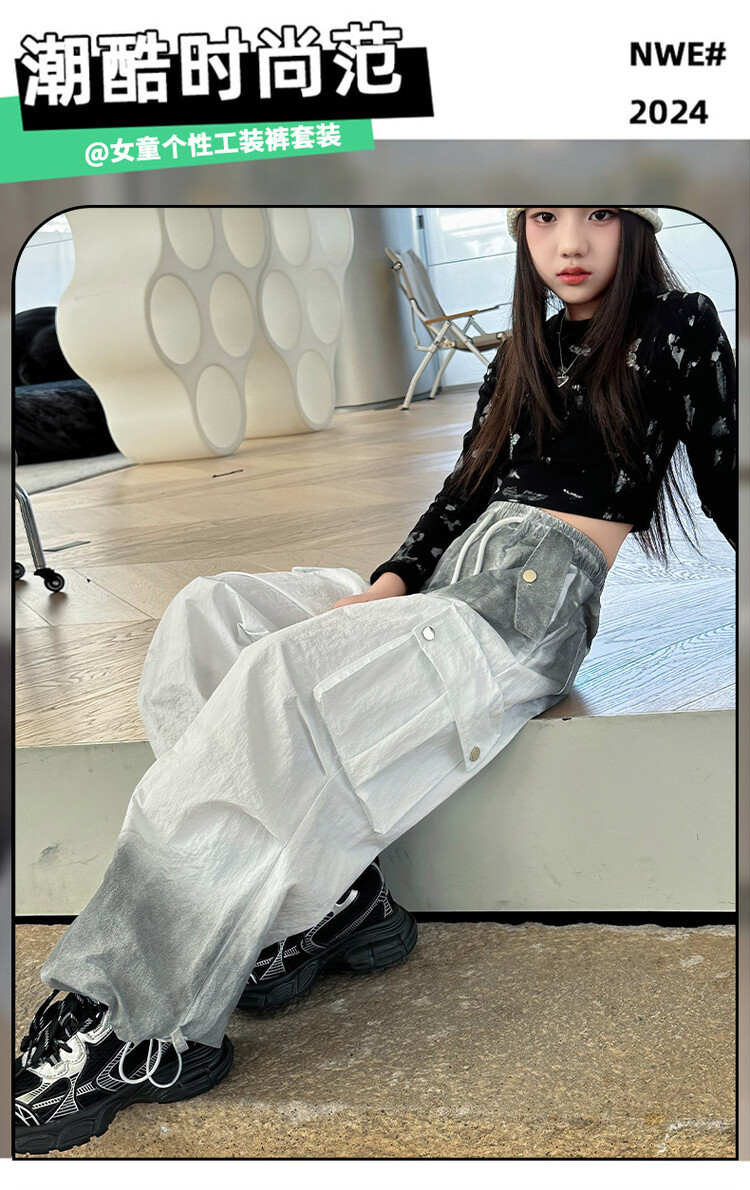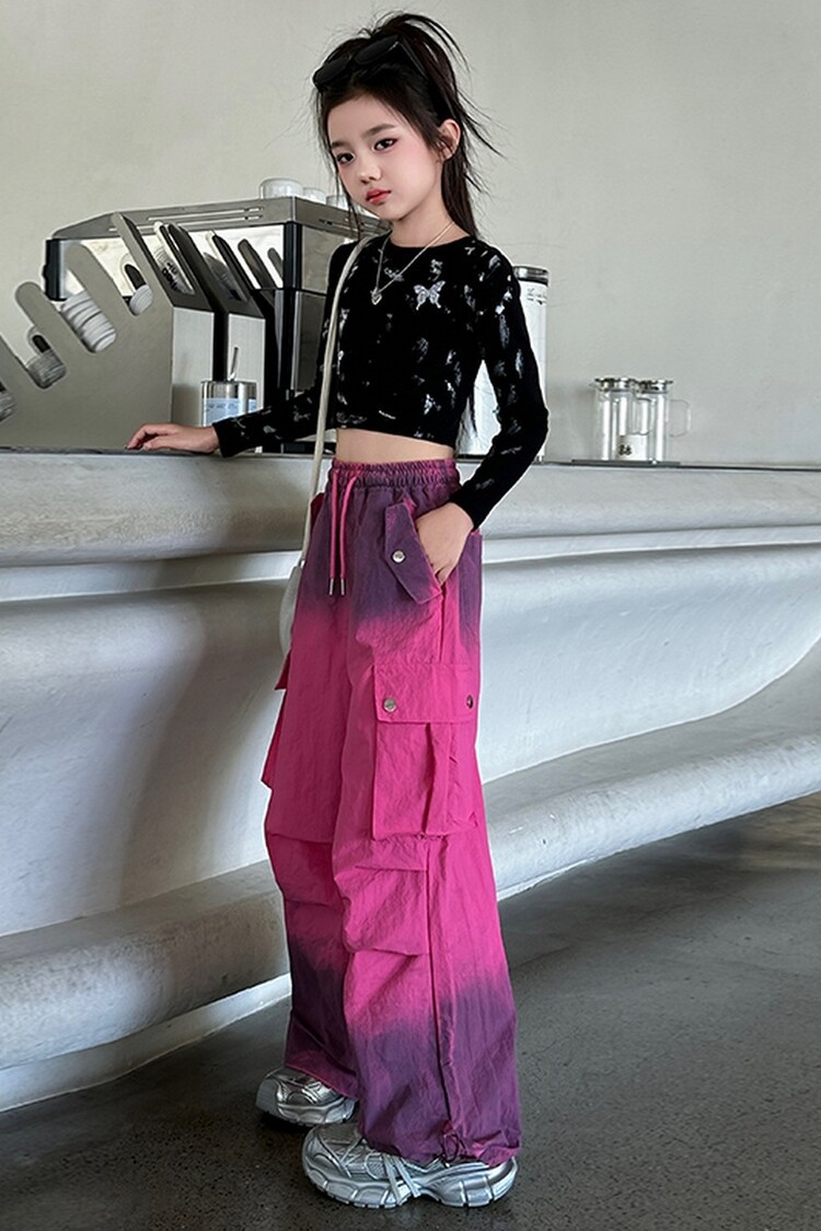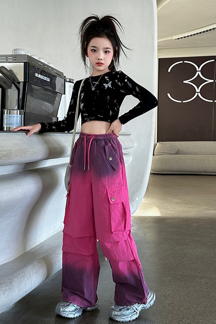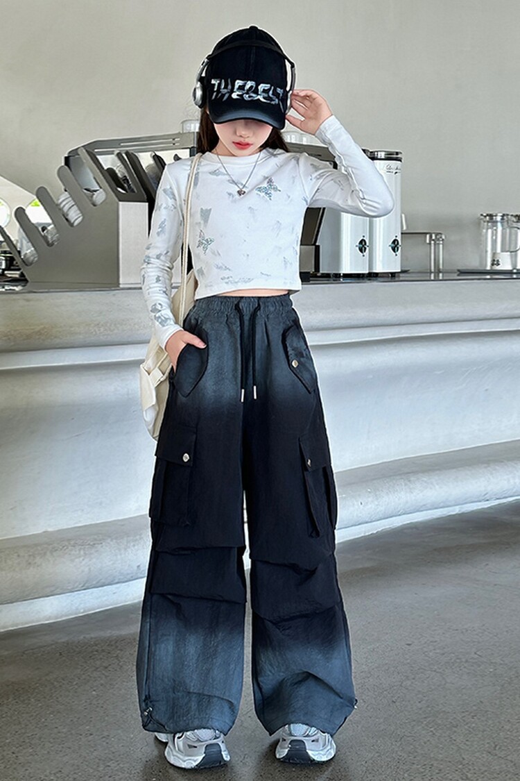 국경 간 소녀 코일 바지 세트 트렌디 쿨 어린이 긴팔 나비 티셔츠 빛나는 와이드 레그 바지 2 피스 봄과 가을 세트