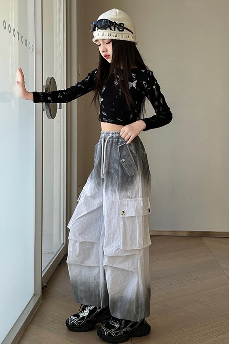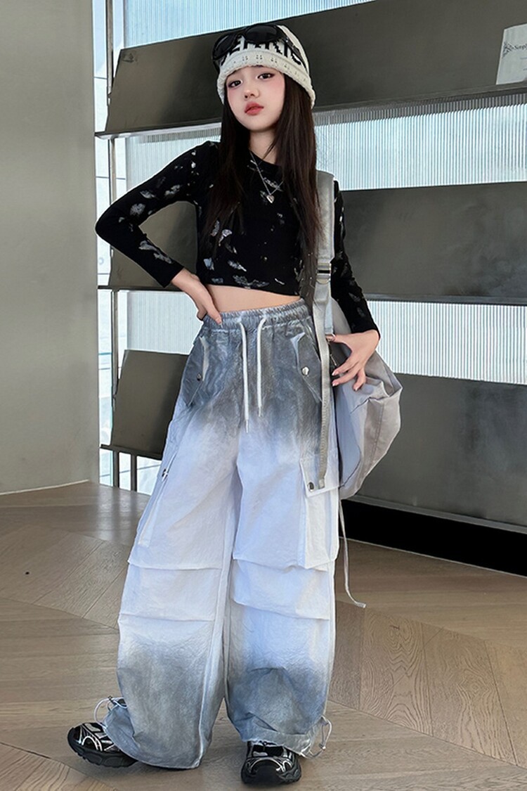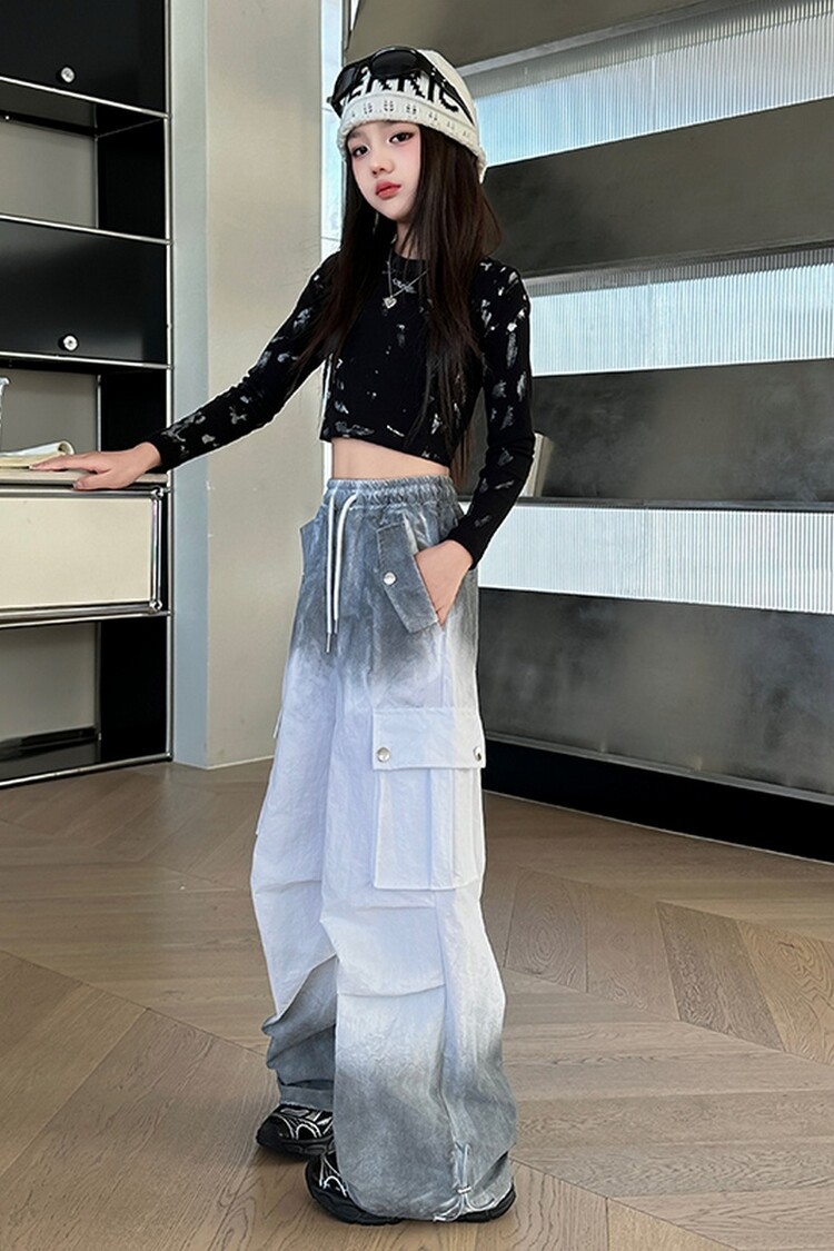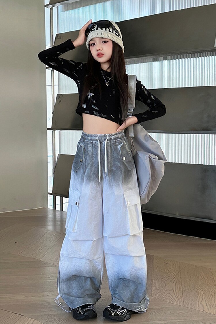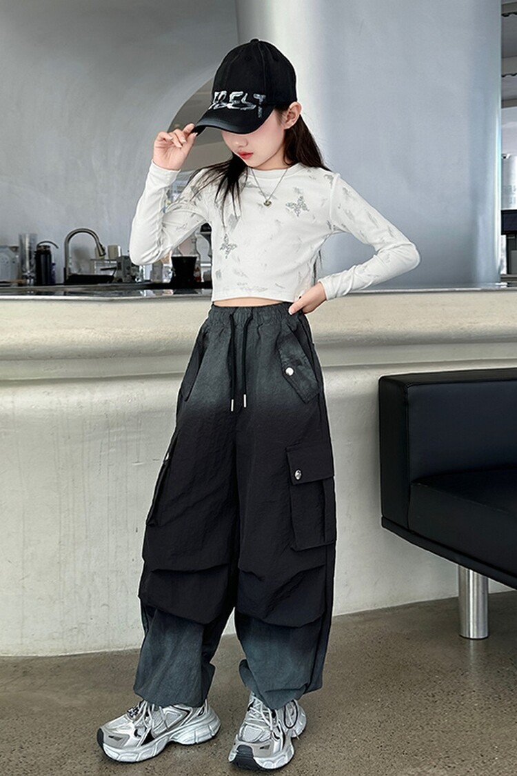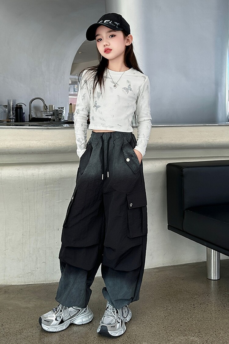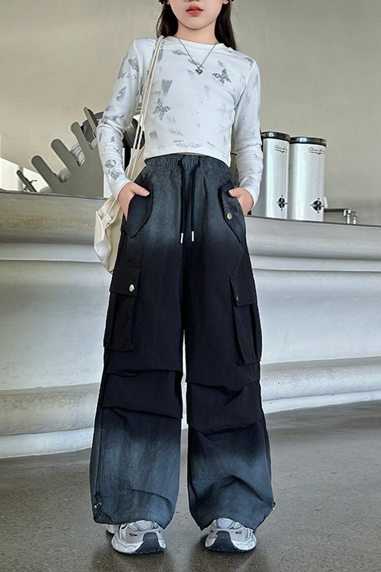 국경 간 소녀 코일 바지 세트 트렌디 쿨 어린이 긴팔 나비 티셔츠 빛나는 와이드 레그 바지 2 피스 봄과 가을 세트