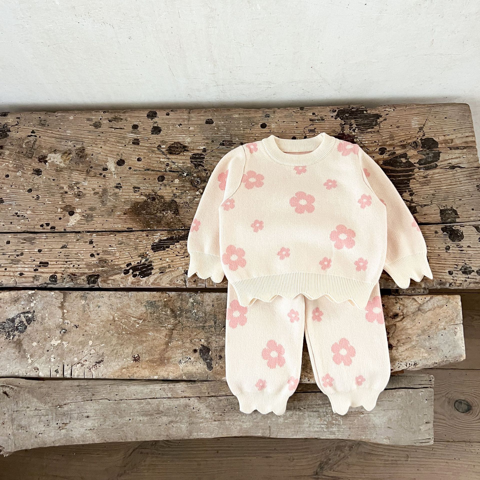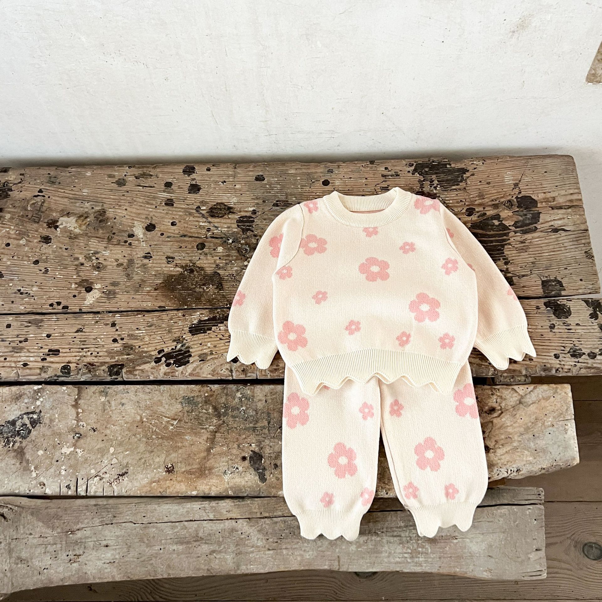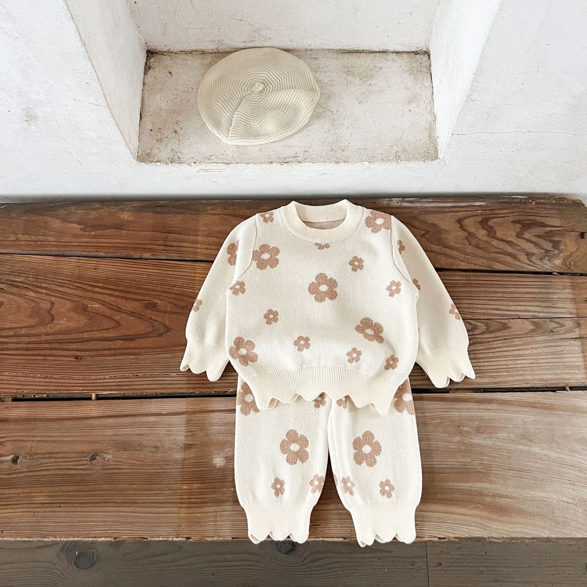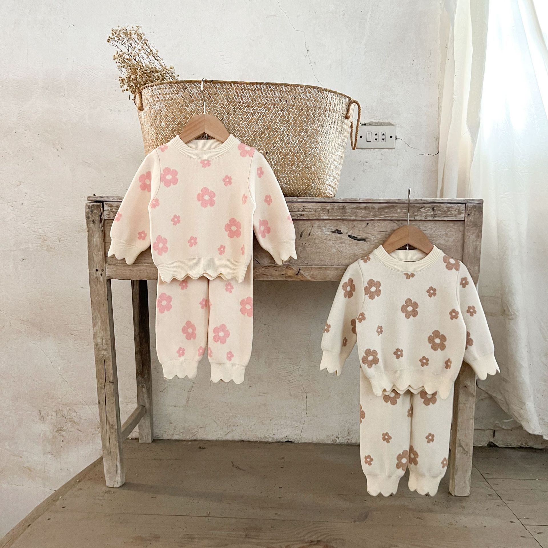 Ins 한국식 소녀 아기면 꽃 양모 세트 느슨한 스웨터 탑 느슨한 바지스토어 가기