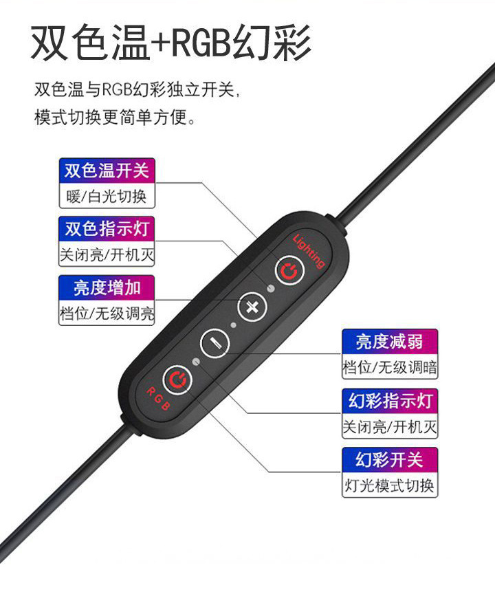 • 12inch RGB 필 라이트 + 팬/틸트 + 휴대폰 호스 클램프 + RGB 리모콘 [표준 구성]