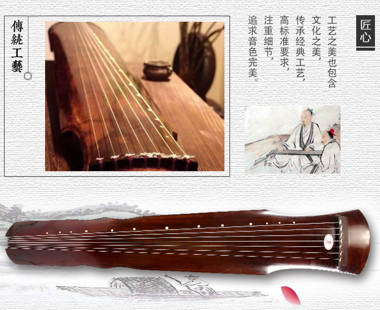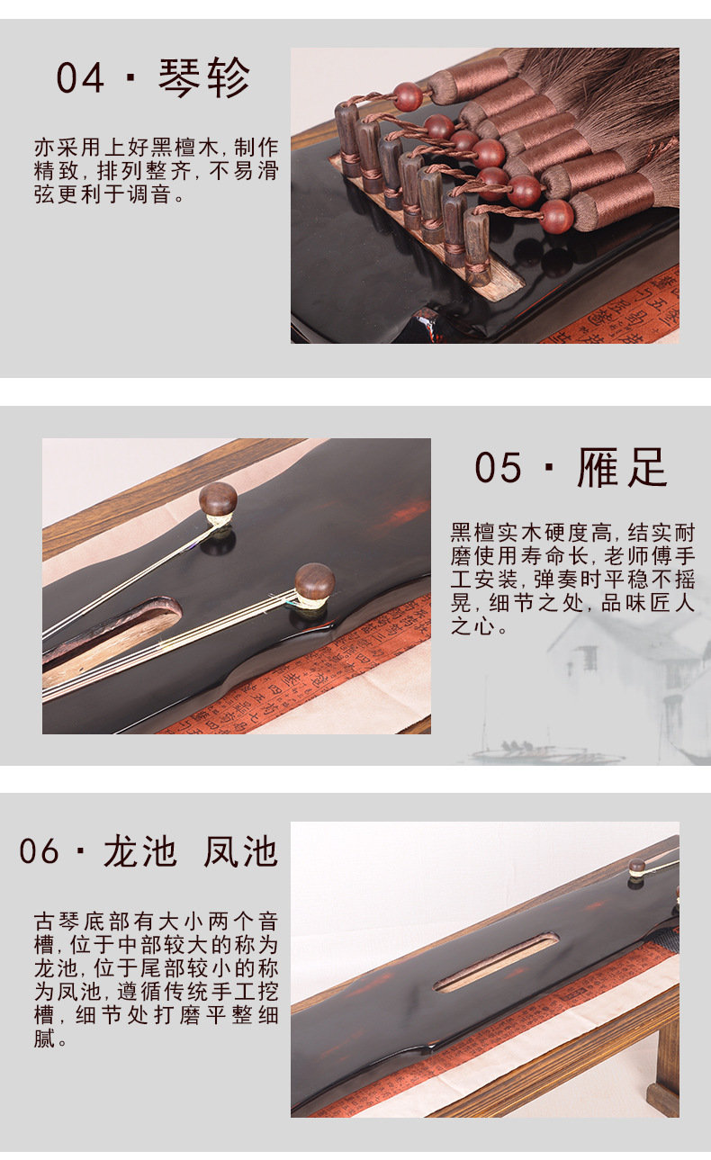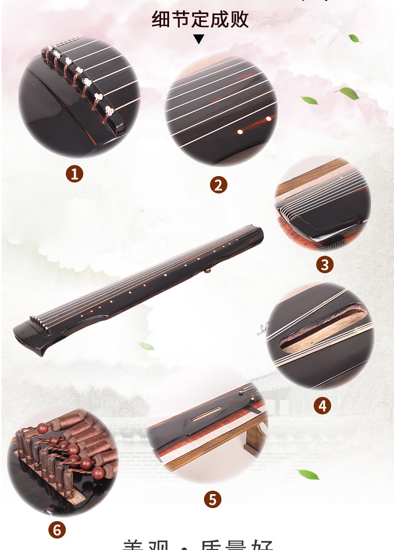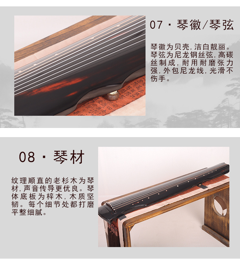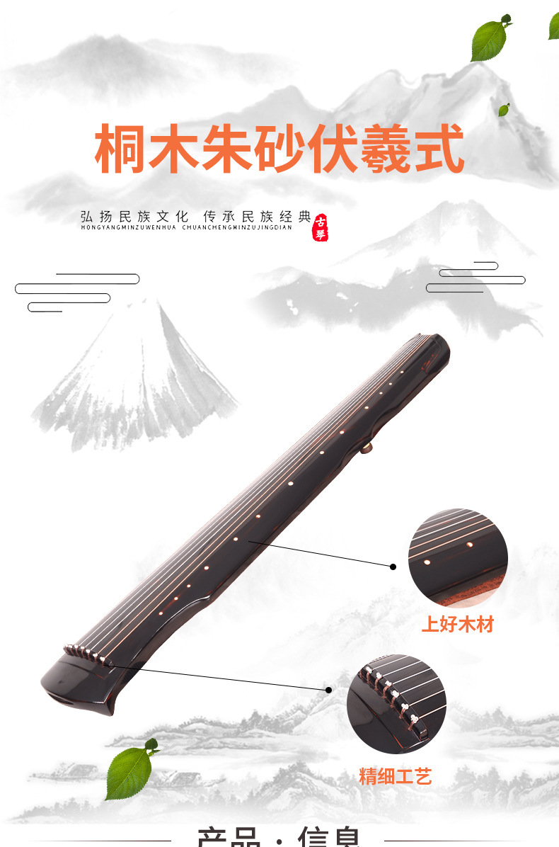出厂配置:古琴(已调好音)、琴囊、琴穗、防滑垫、养弦膏、擦琴布
