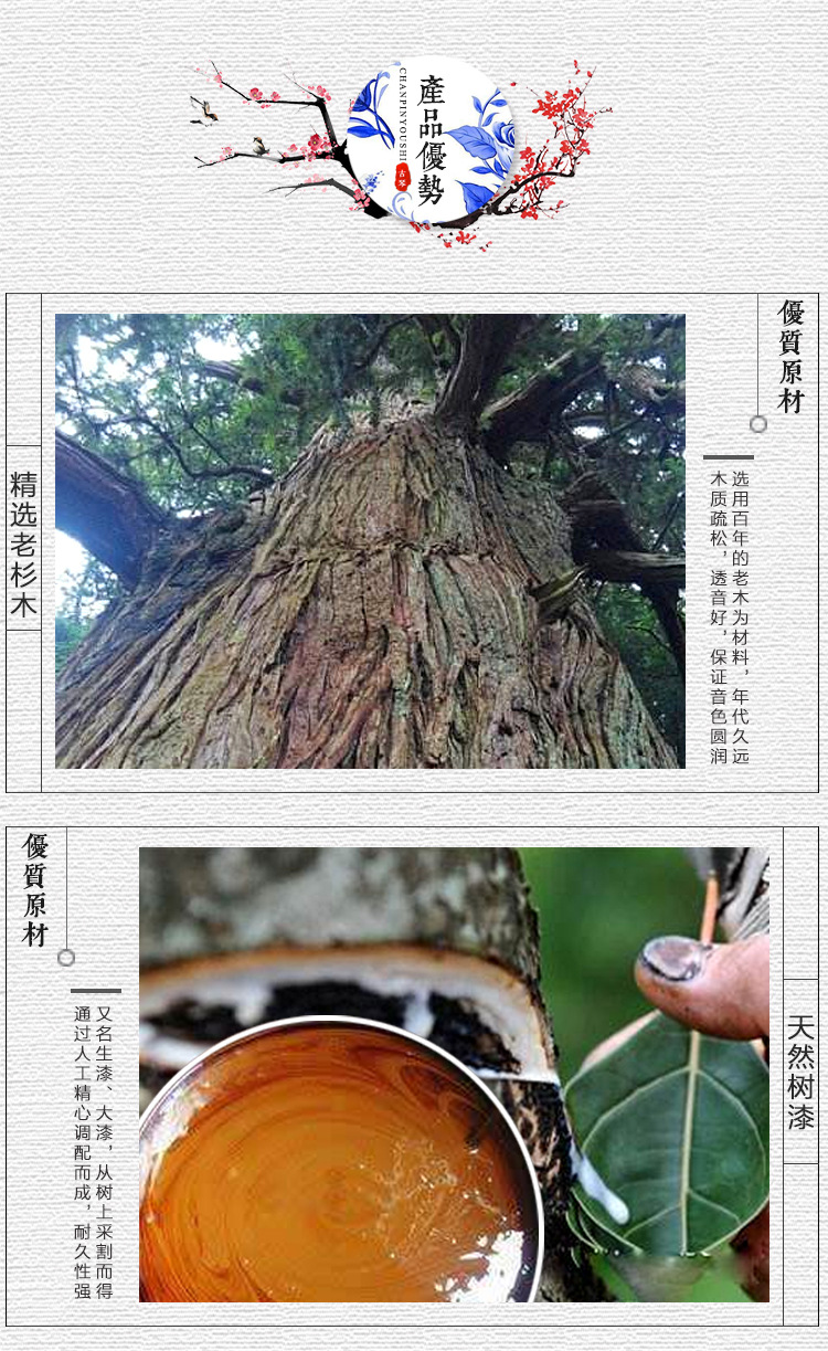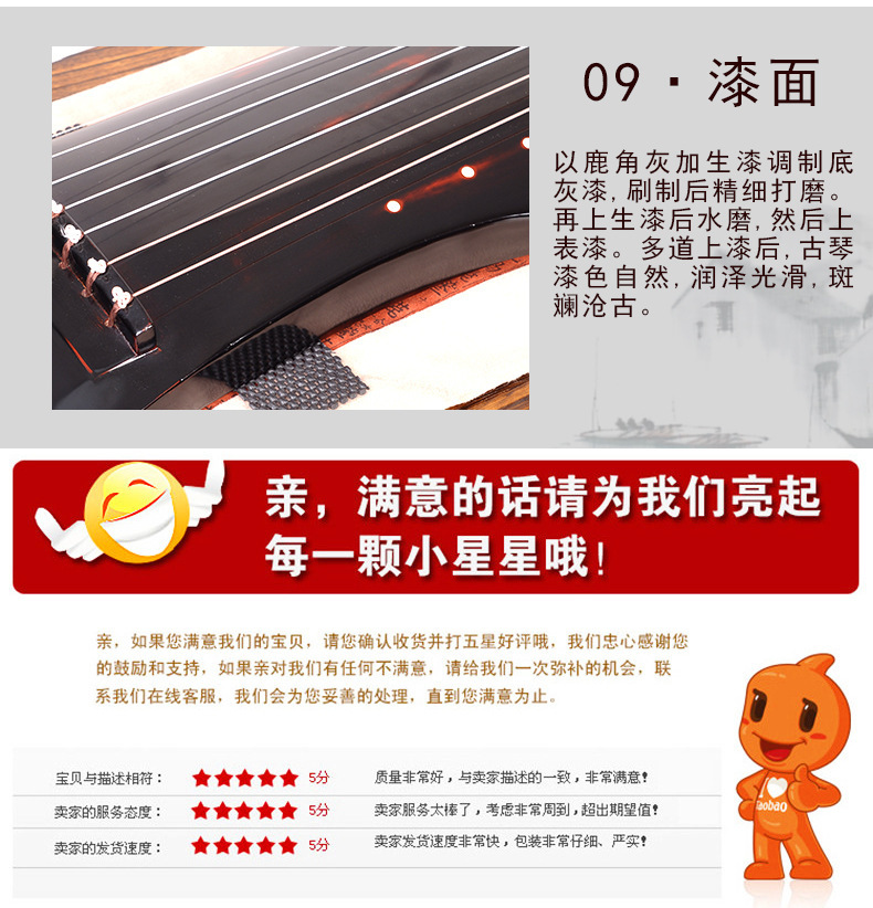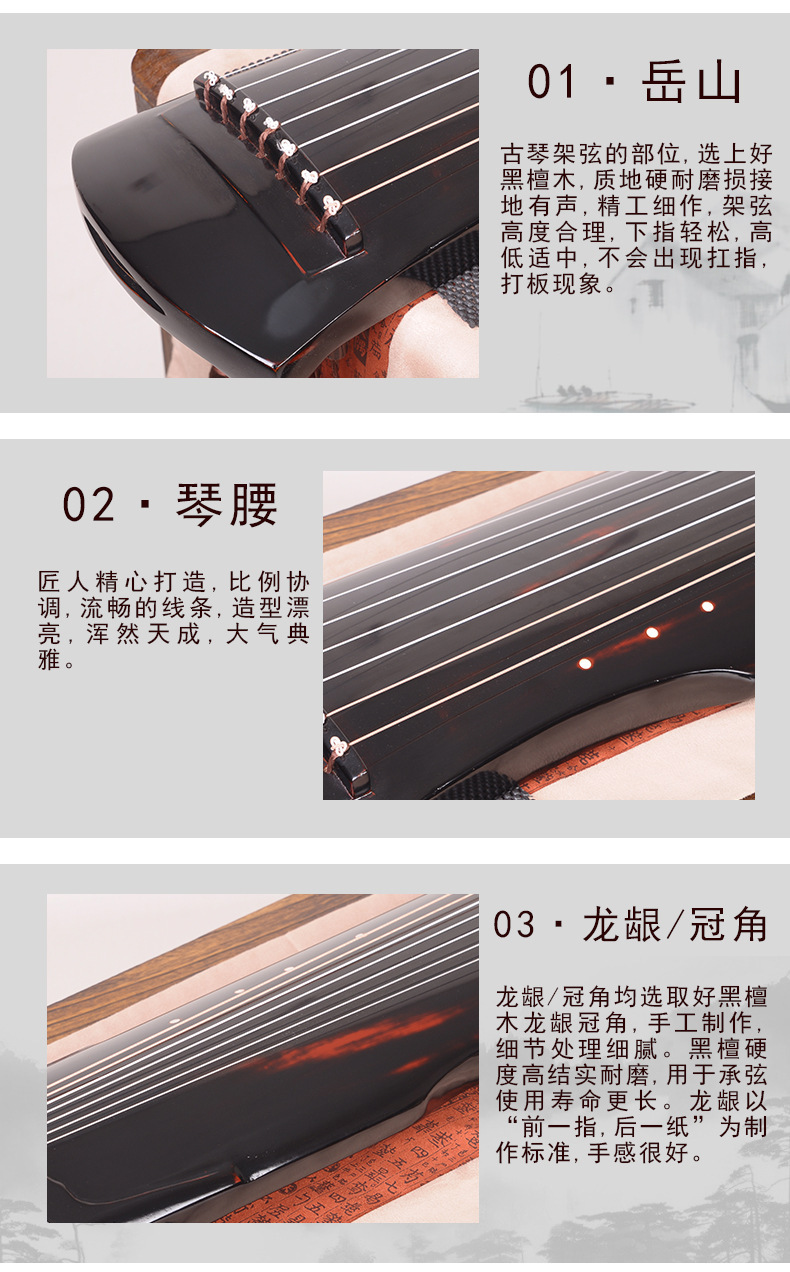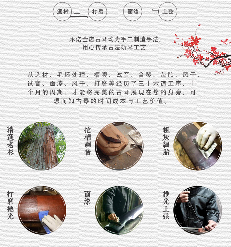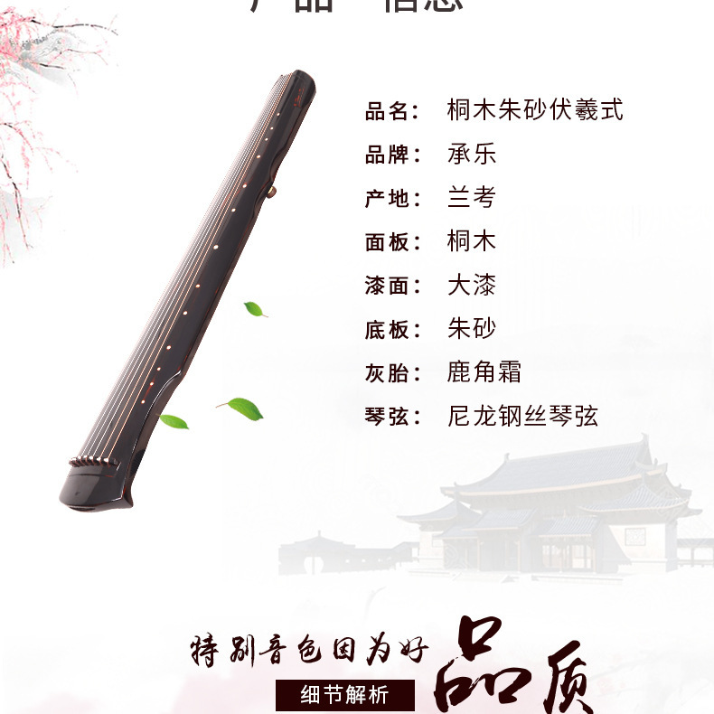 出厂配置:古琴(已调好音)、琴囊、琴穗、防滑垫、养弦膏、擦琴布