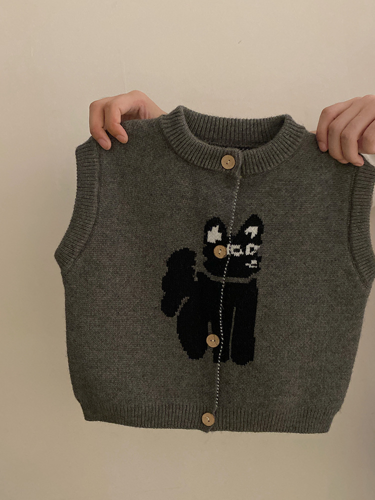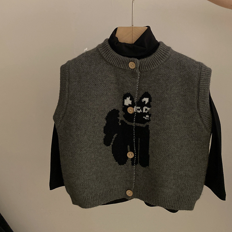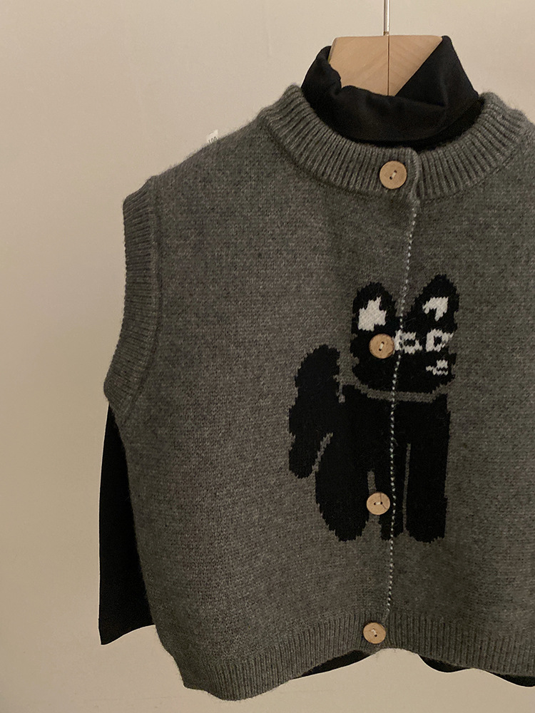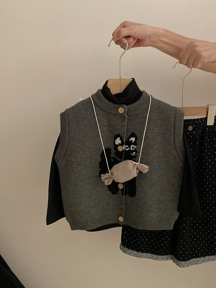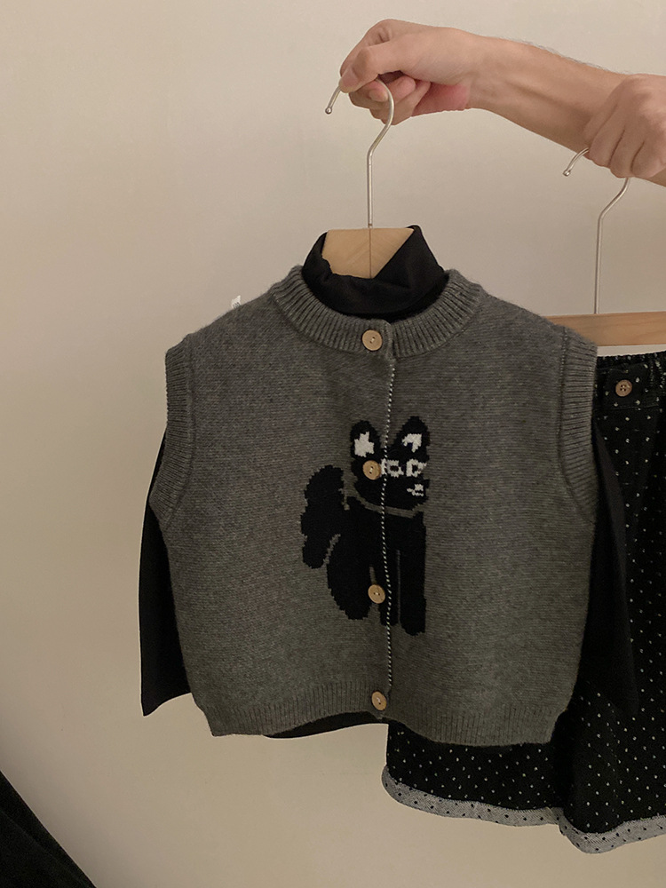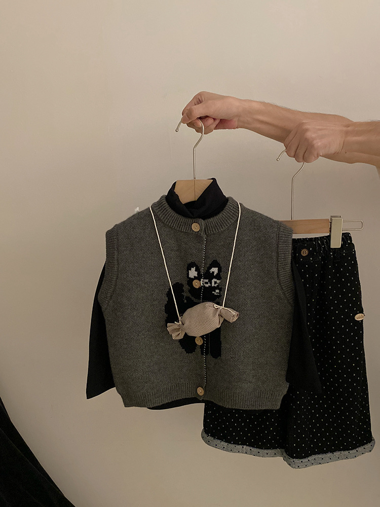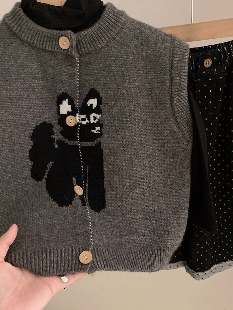 한국 스타일 소녀의 만화 고양이 니트 조끼 2024 가을 새로운 단색베이스 셔츠 유행 폴카 점 바지 세트