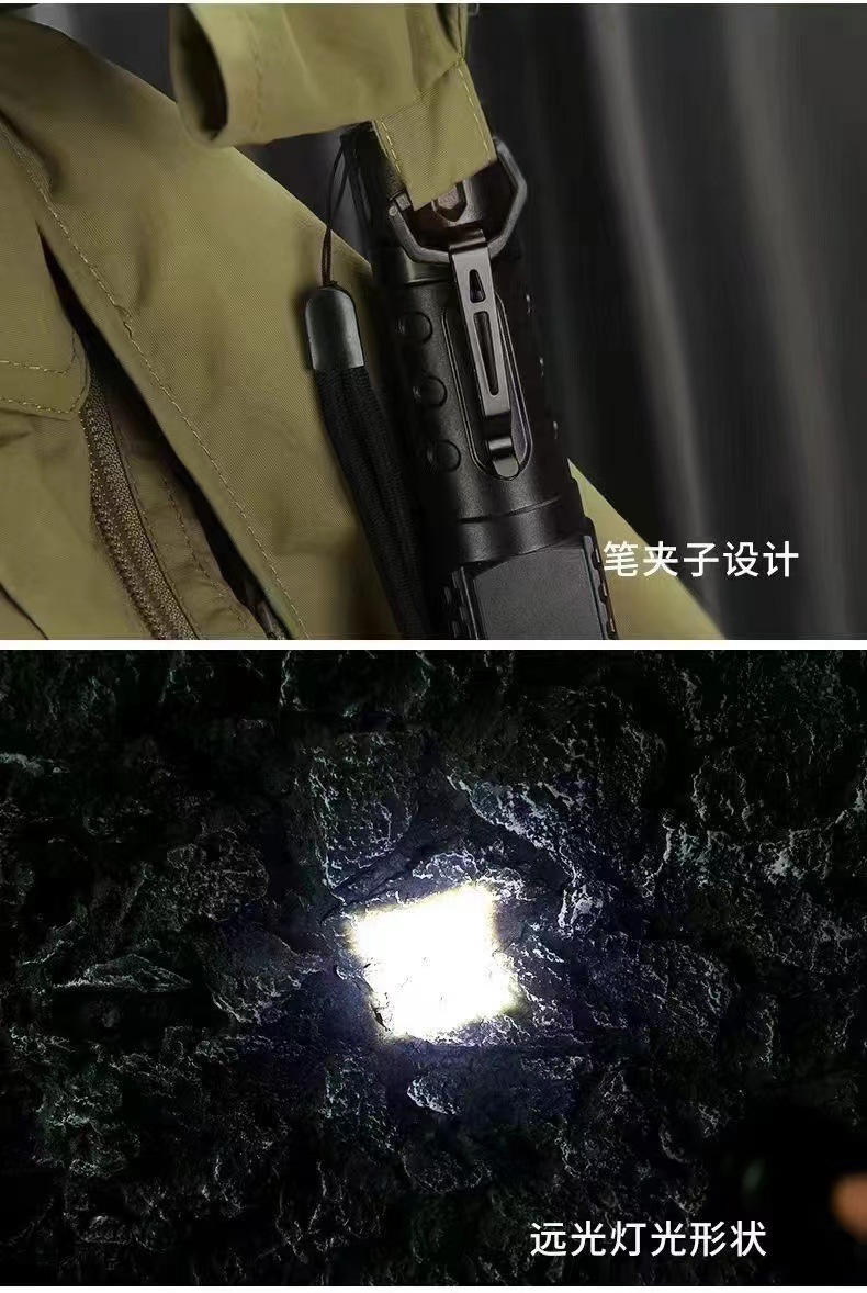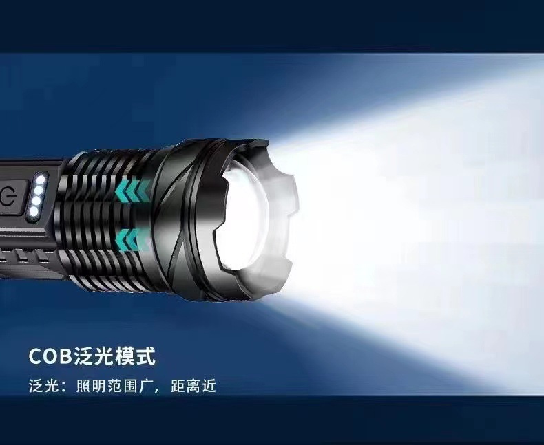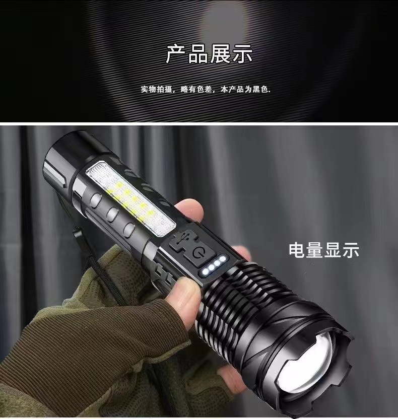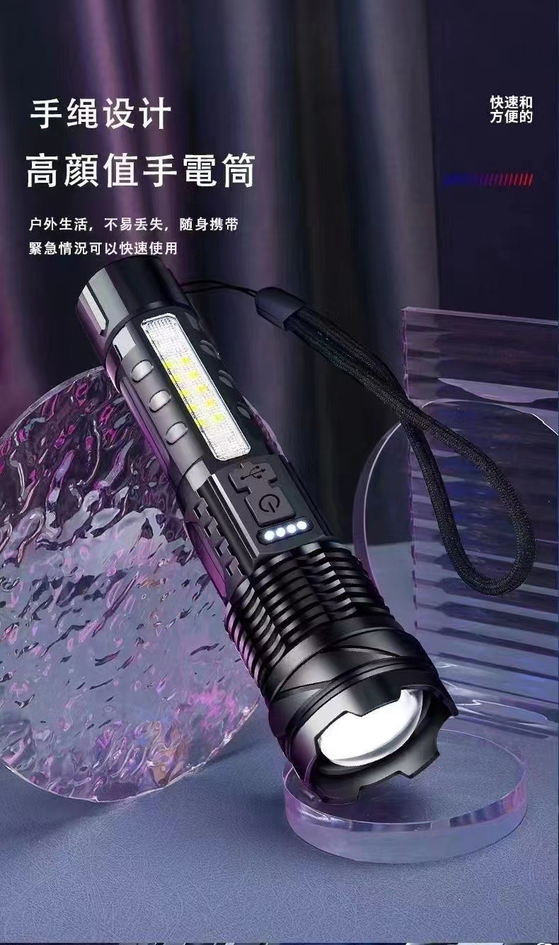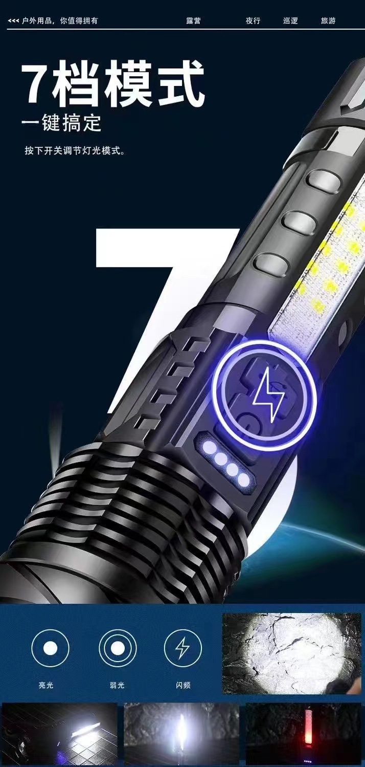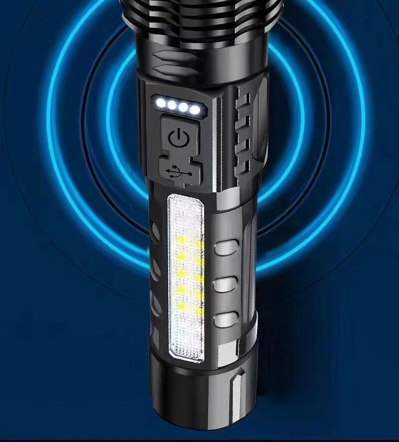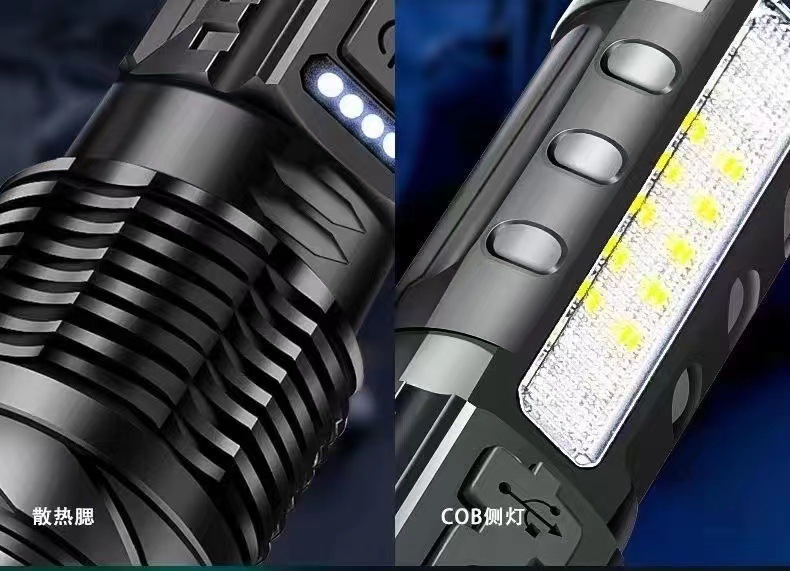 국경 간 인기 강한 빛 손전등 충전식 야외 조명 다기능 COB 경고 빨간색과 파란색 플래시 측면 작업 조명