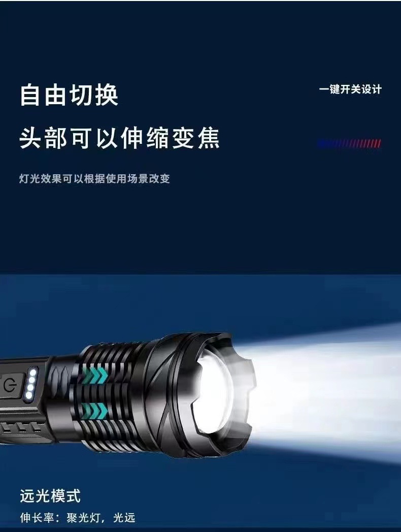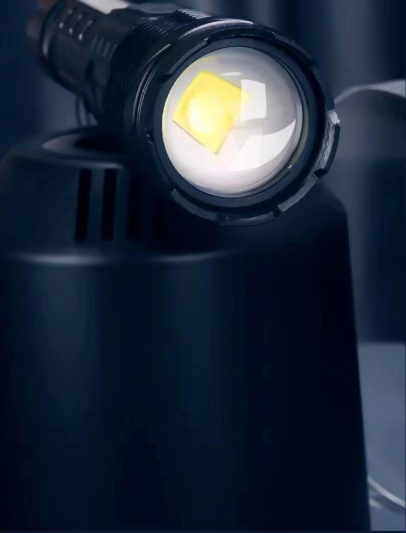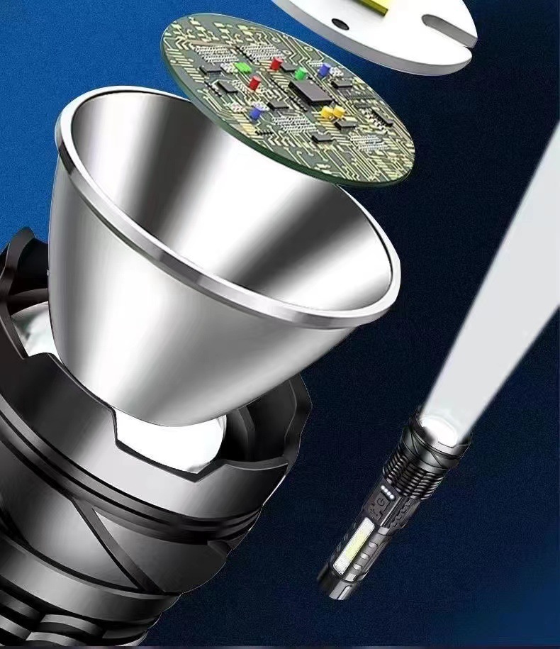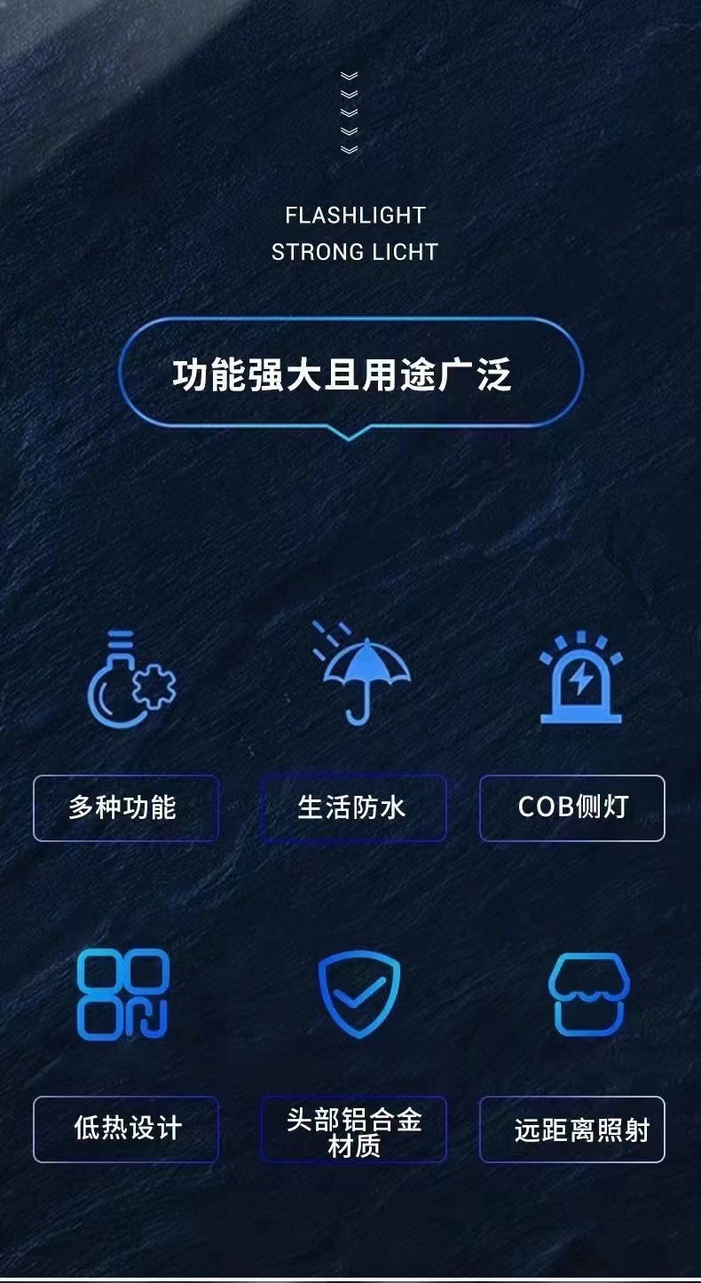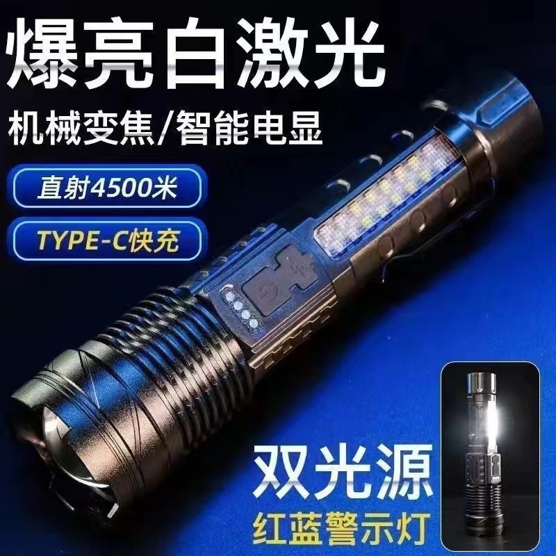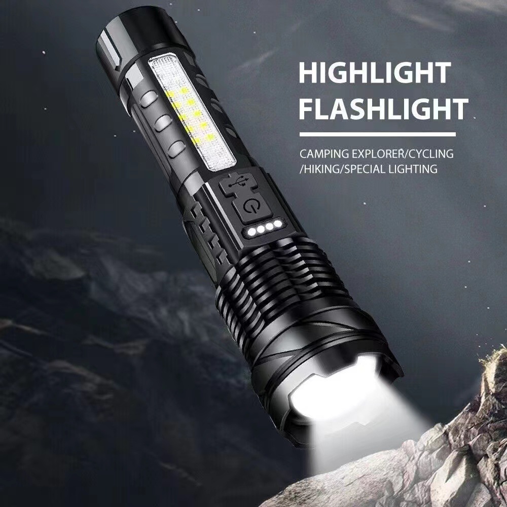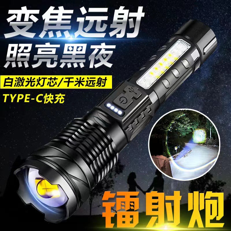 국경 간 인기 강한 빛 손전등 충전식 야외 조명 다기능 COB 경고 빨간색과 파란색 플래시 측면 작업 조명