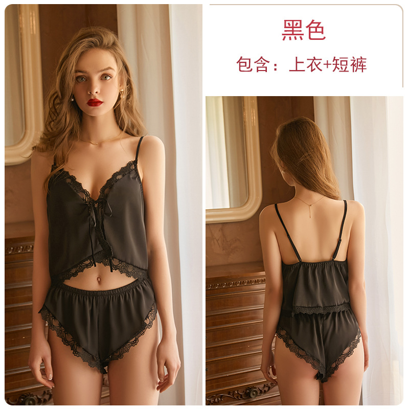 유럽과 미국의 오리지널 여성 섹시 딥 V 새틴 레이스 핫 슬링 반바지 홈 의류 세트 248