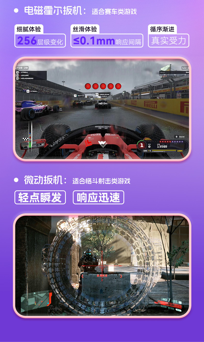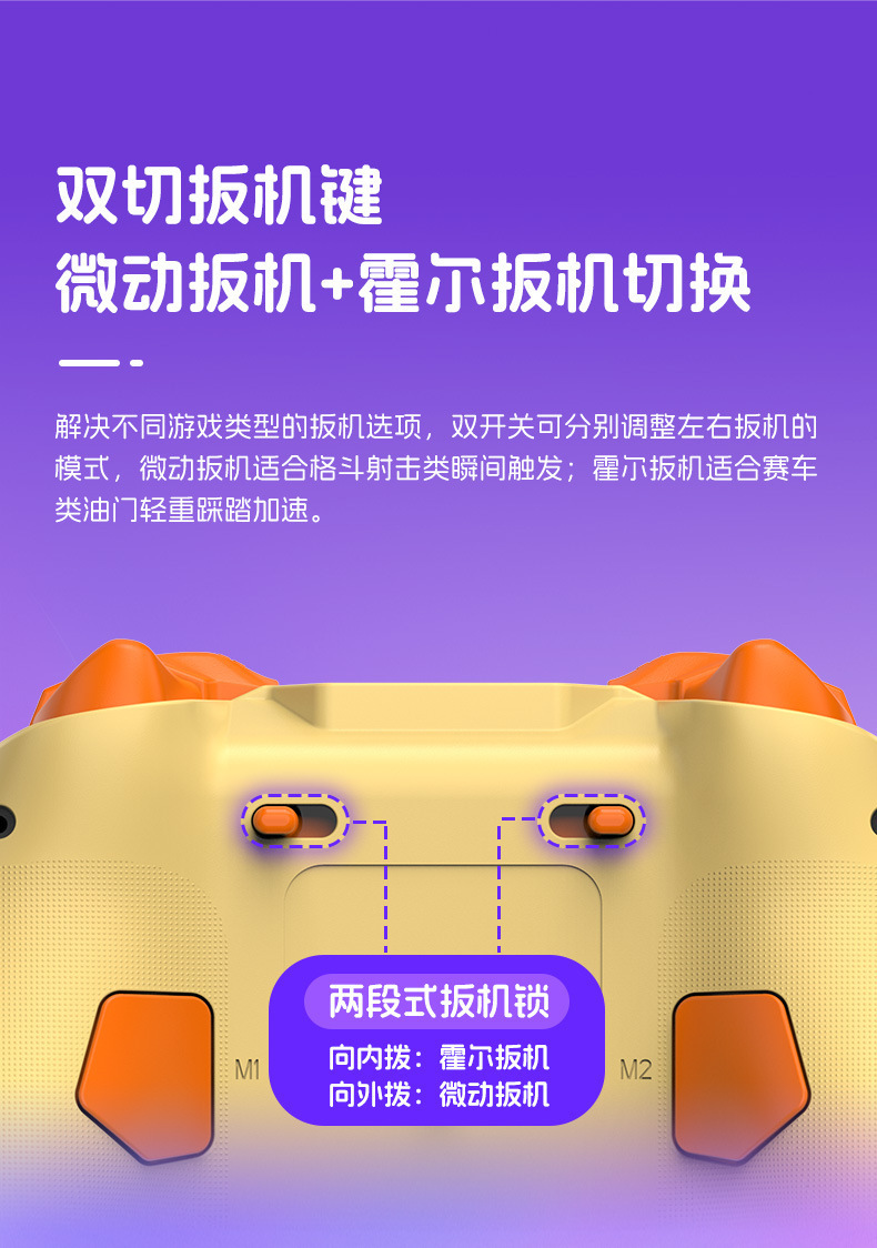 1.搭载霍尔摇杆、双切扳机键:微动扳机+霍尔扳机切换;