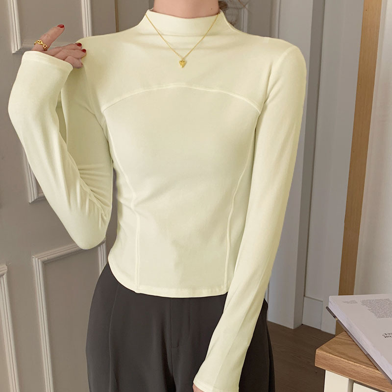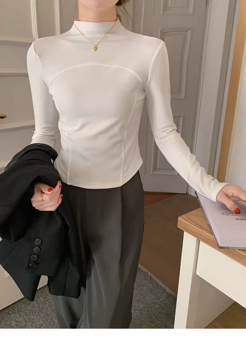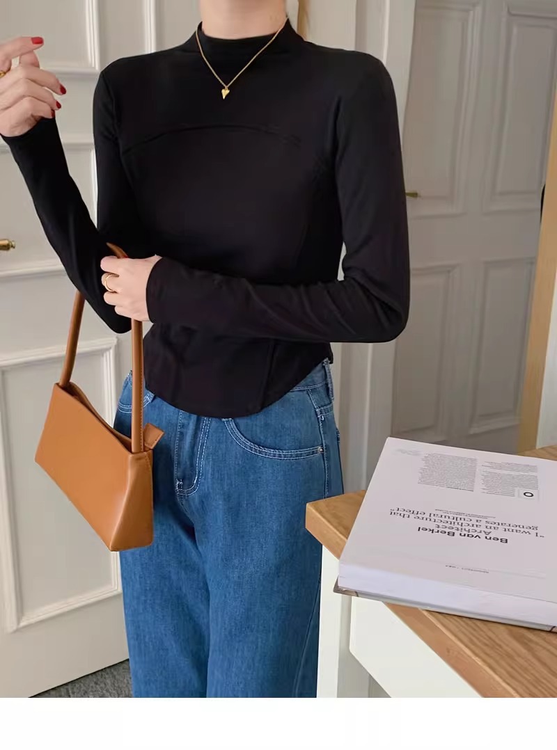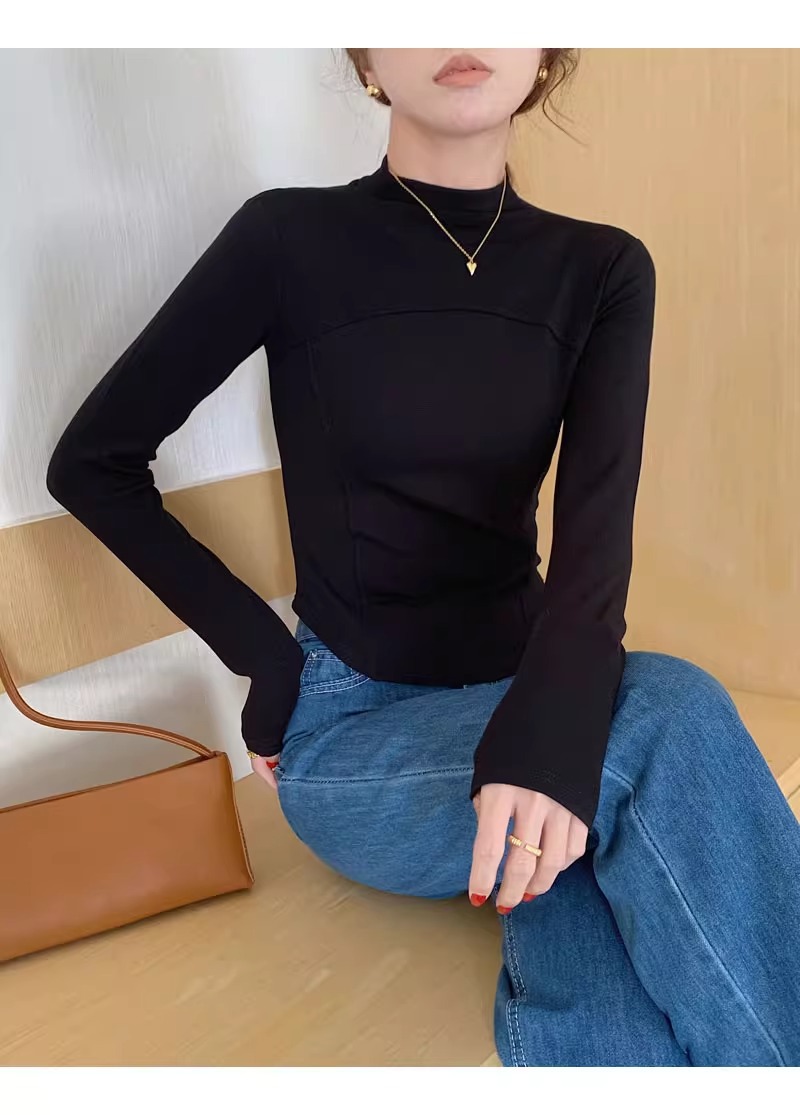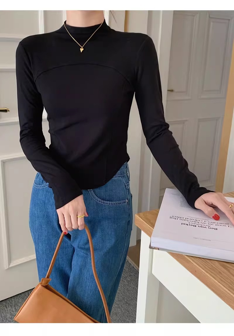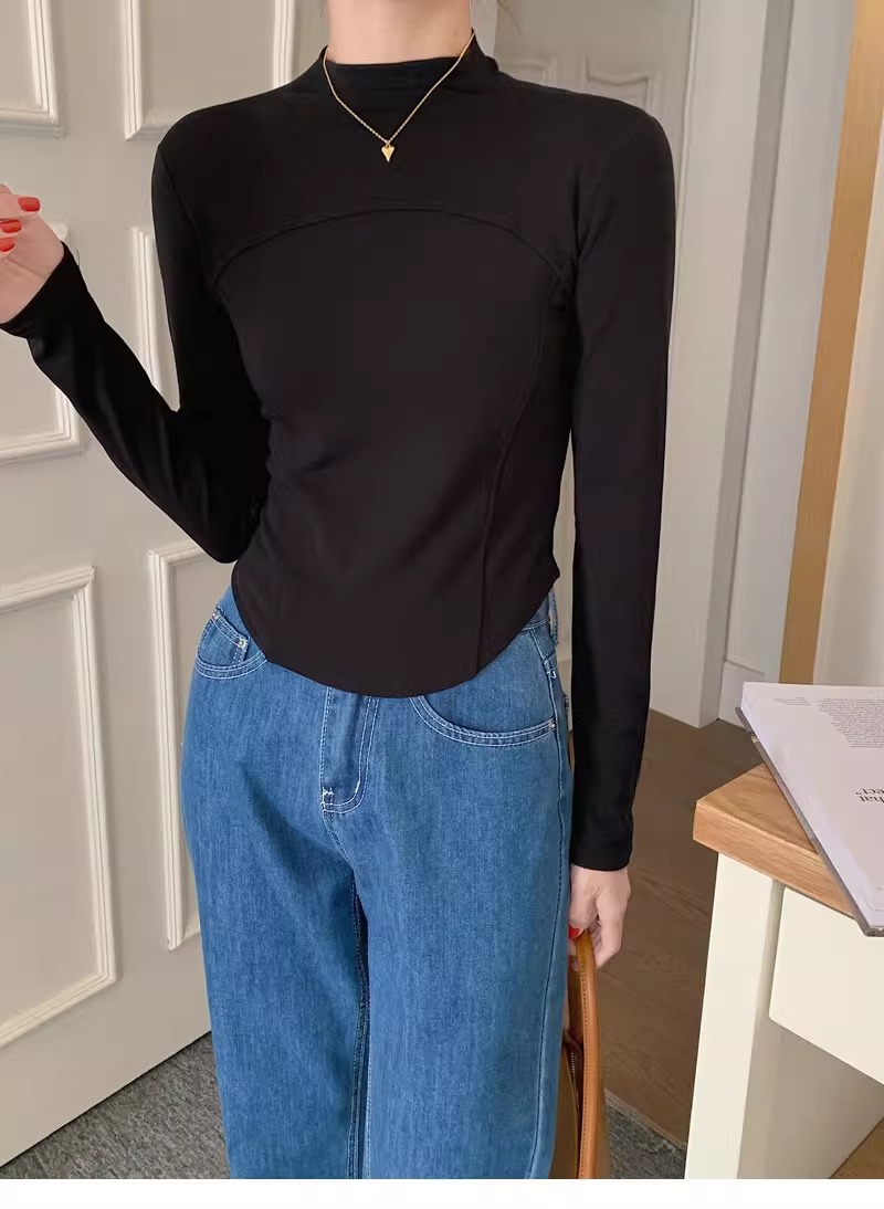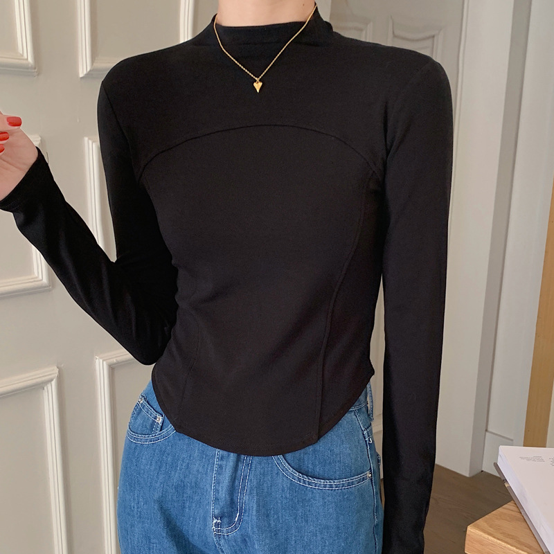 반 높이 칼라 벨벳베이스 셔츠 여성용 가을 긴팔 티셔츠 불규칙한 곡선 형 헴 올 매치 슬림 핏 탑인스토어 가기