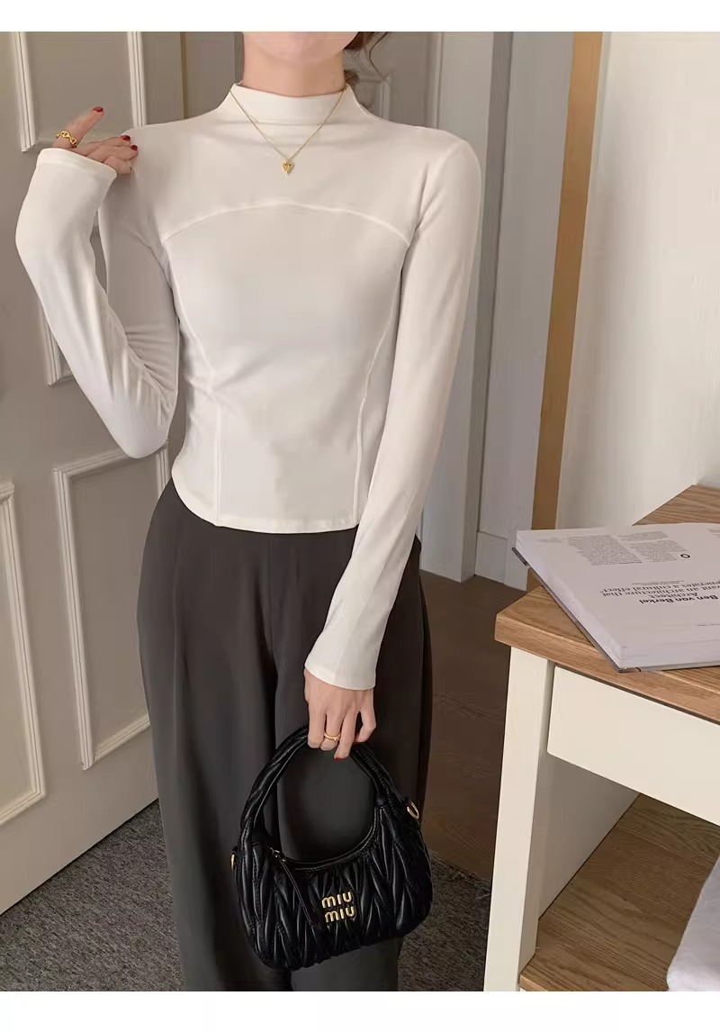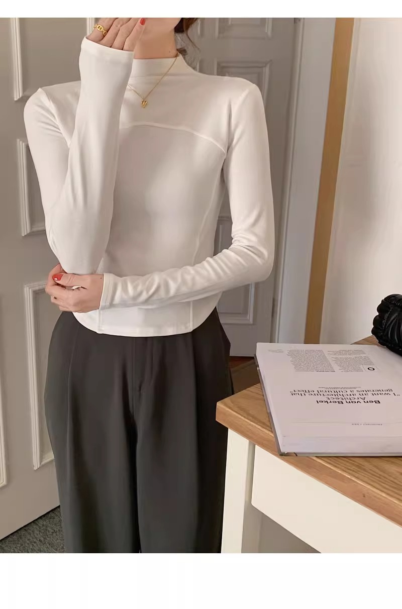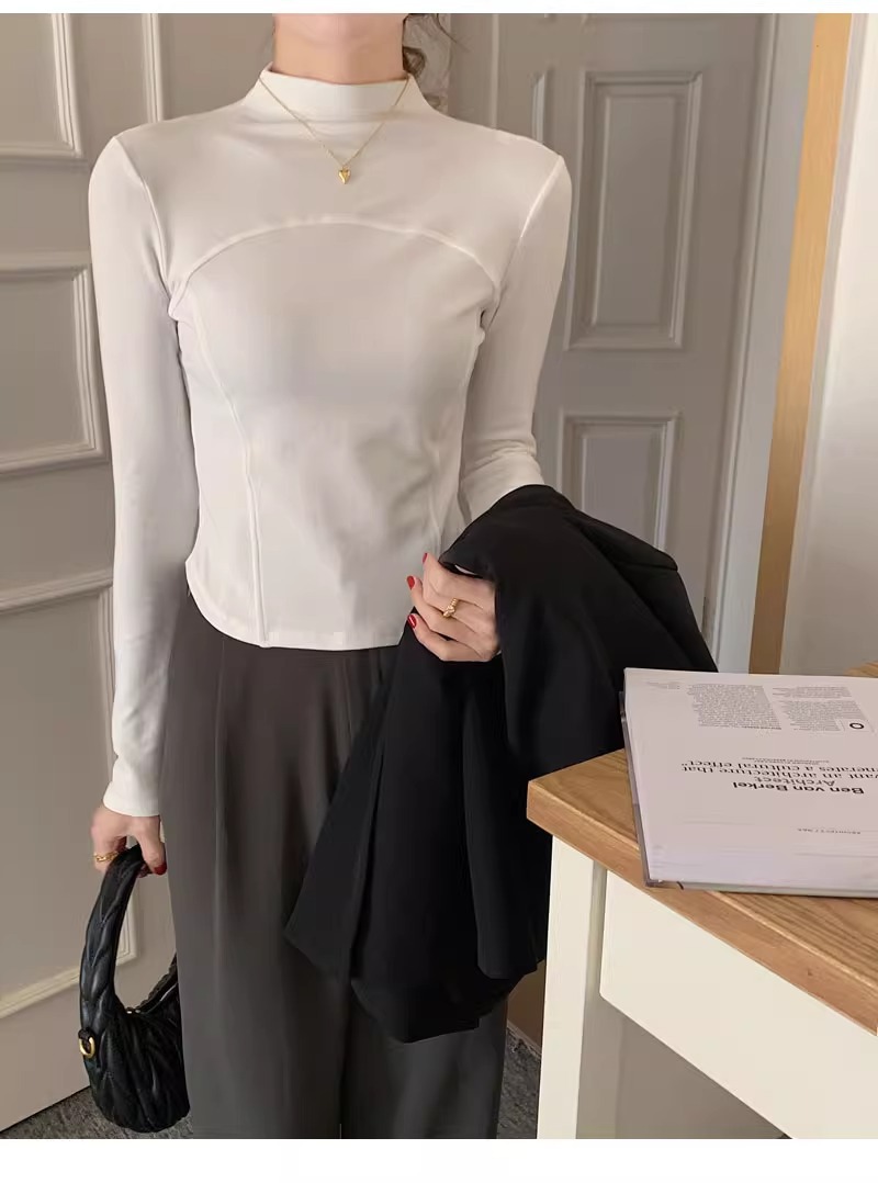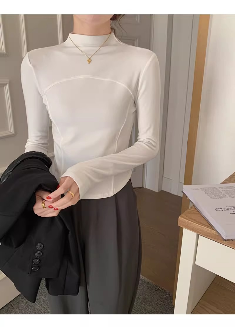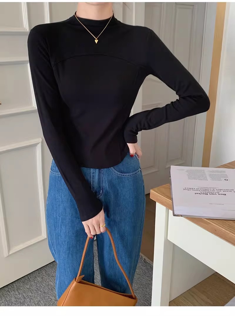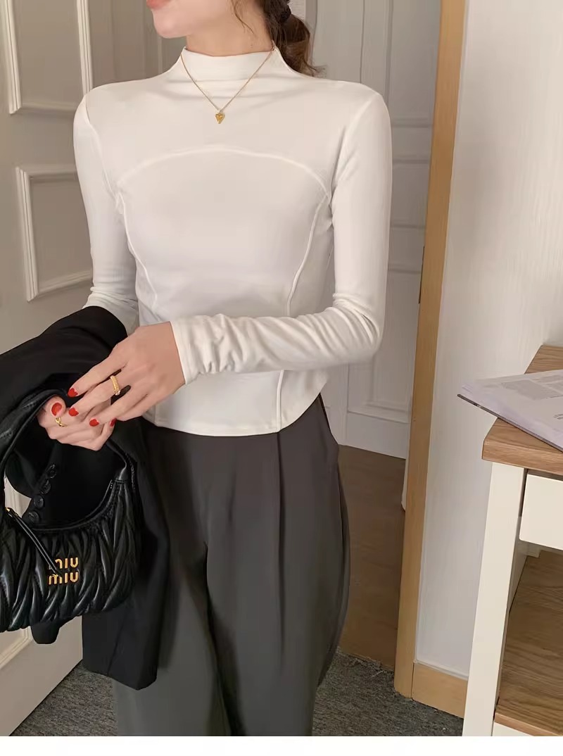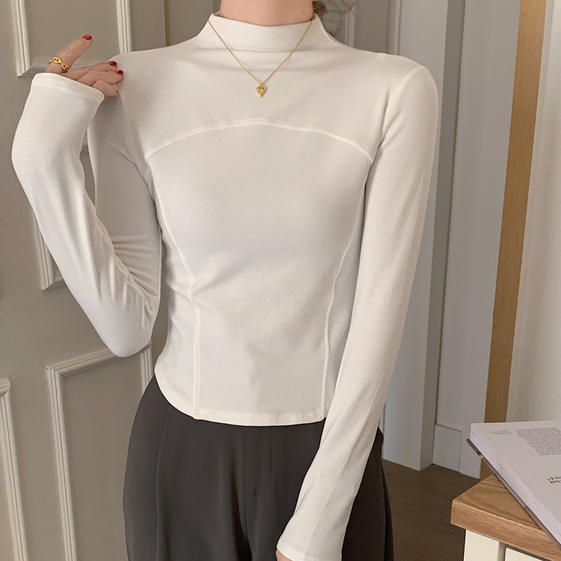 반 높이 칼라 벨벳베이스 셔츠 여성용 가을 긴팔 티셔츠 불규칙한 곡선 형 헴 올 매치 슬림 핏 탑인스토어 가기