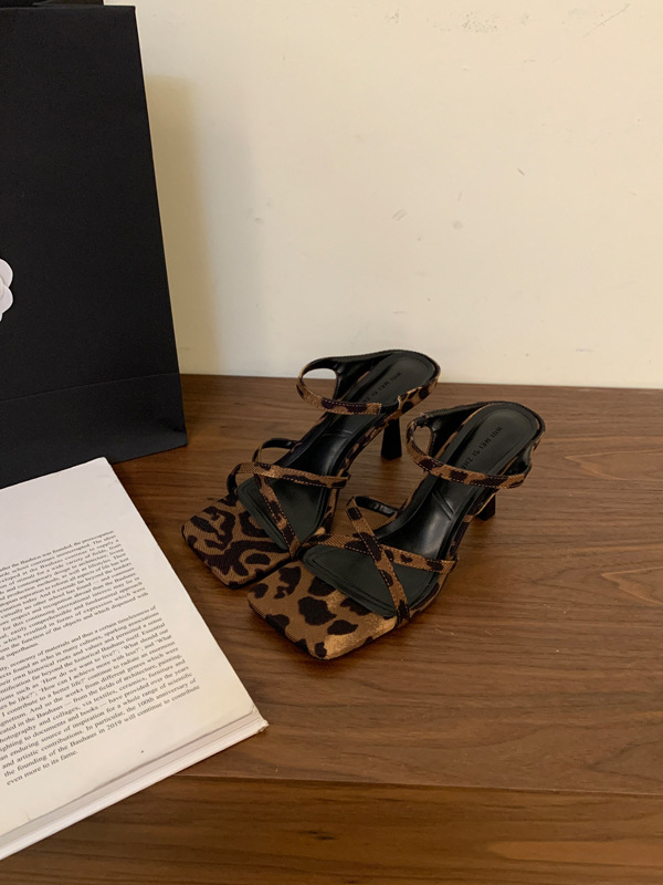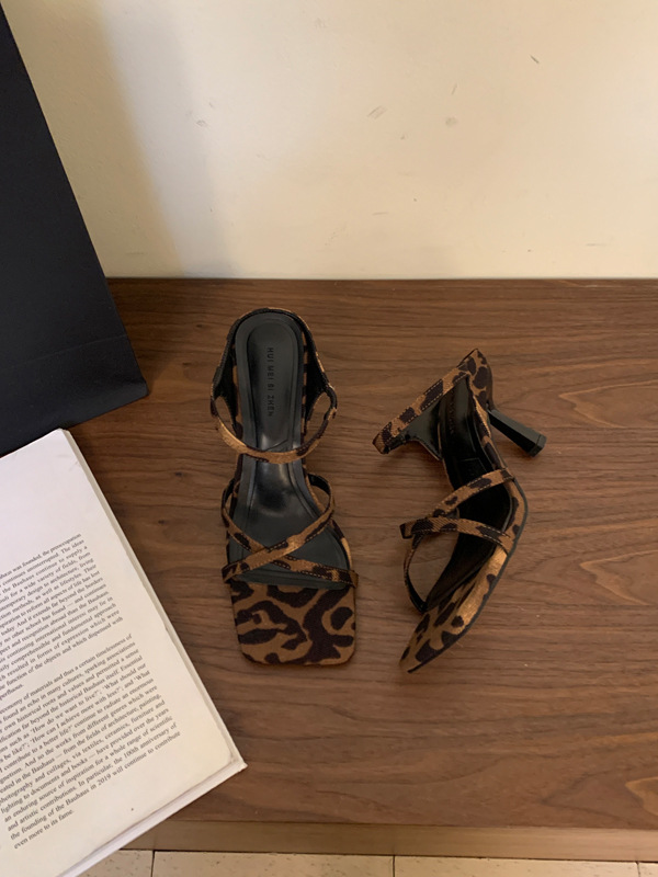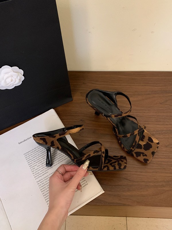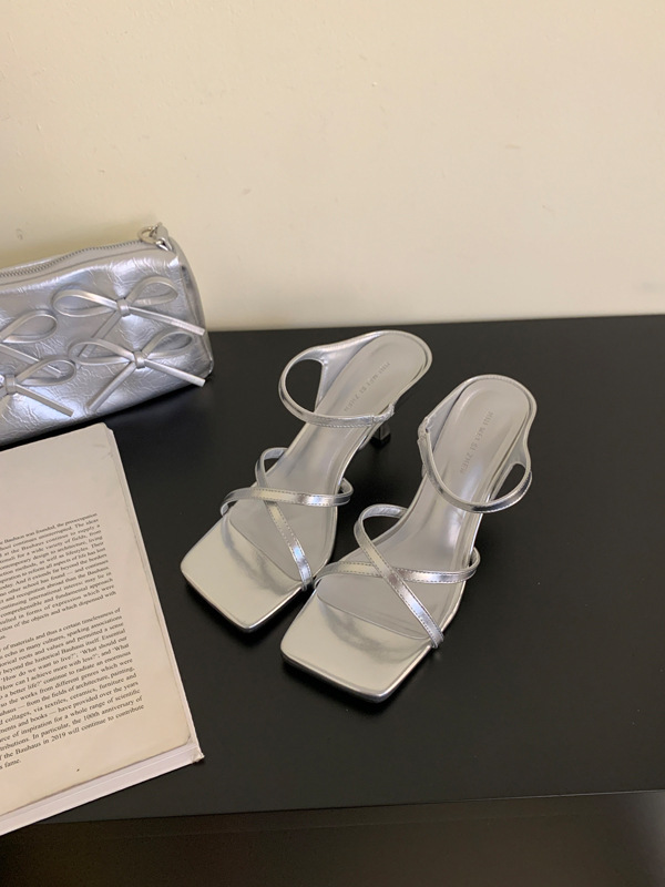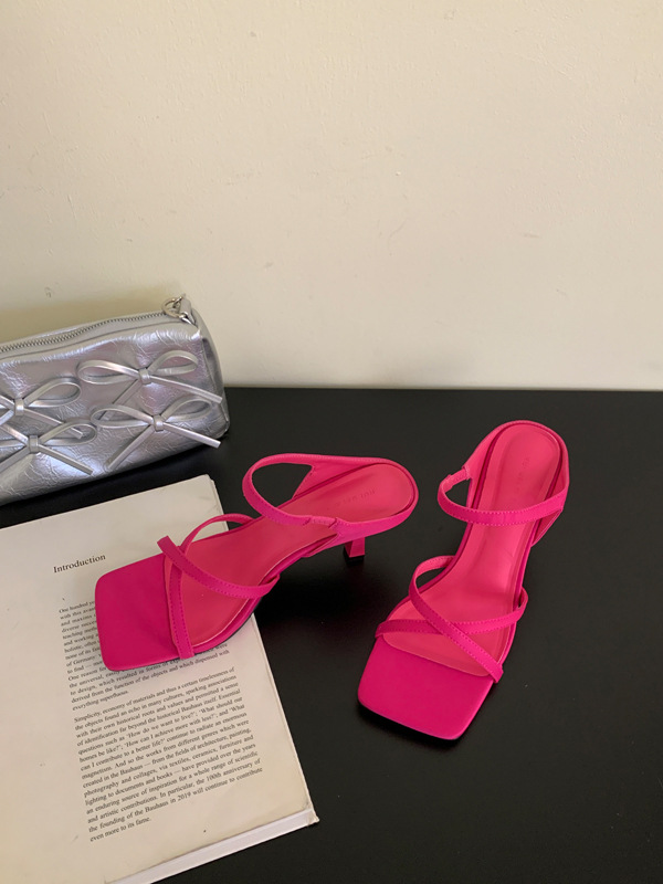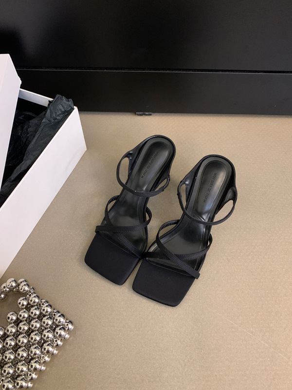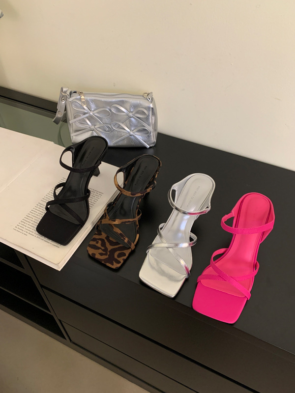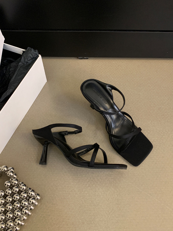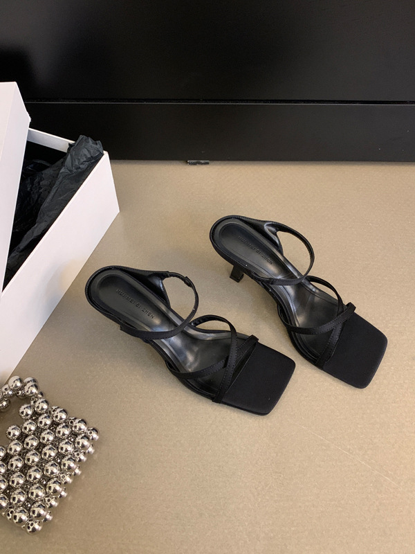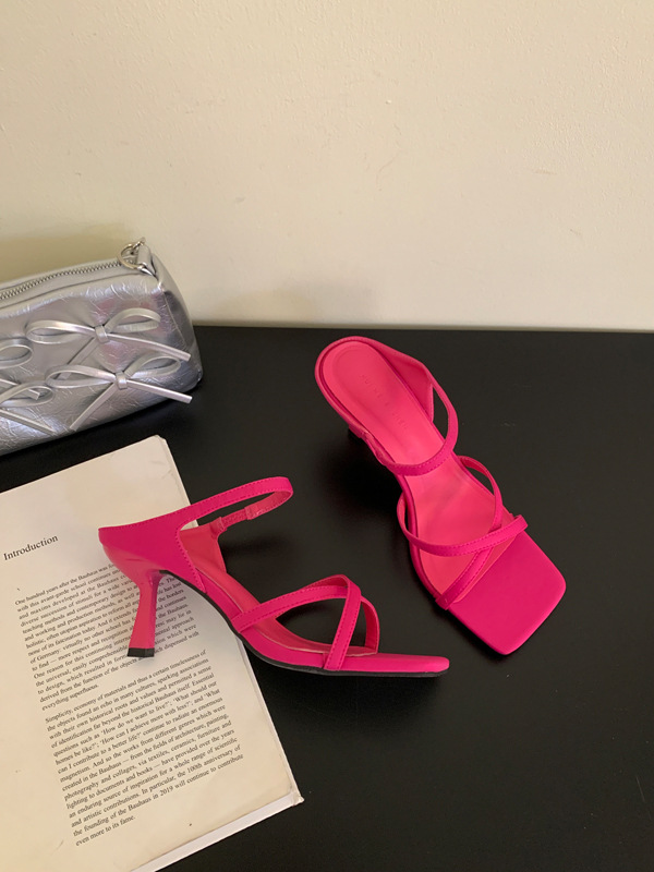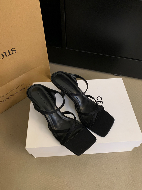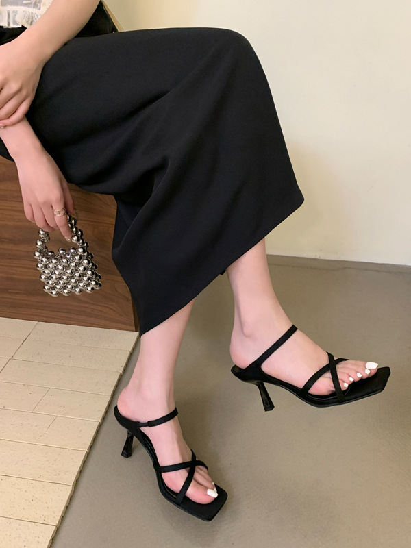 2024夏季韩版方头露趾细跟一字带交叉带后空一脚蹬性感女高跟凉鞋