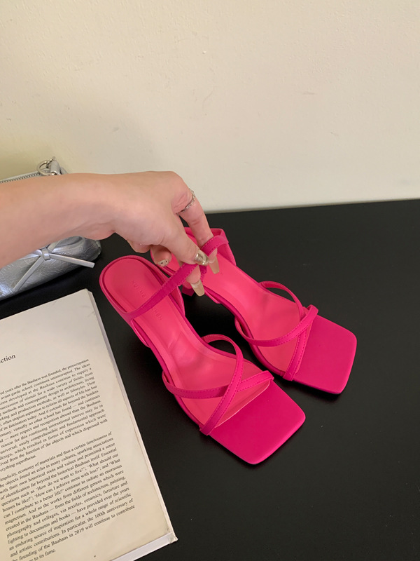 여름 2024 한국식 광장 발가락 오픈 발가락 얇은 힐 슬라이딩 벨트 크로스 벨트 빈 슬립 온 솔리드 컬러 여성용 하이힐 샌들