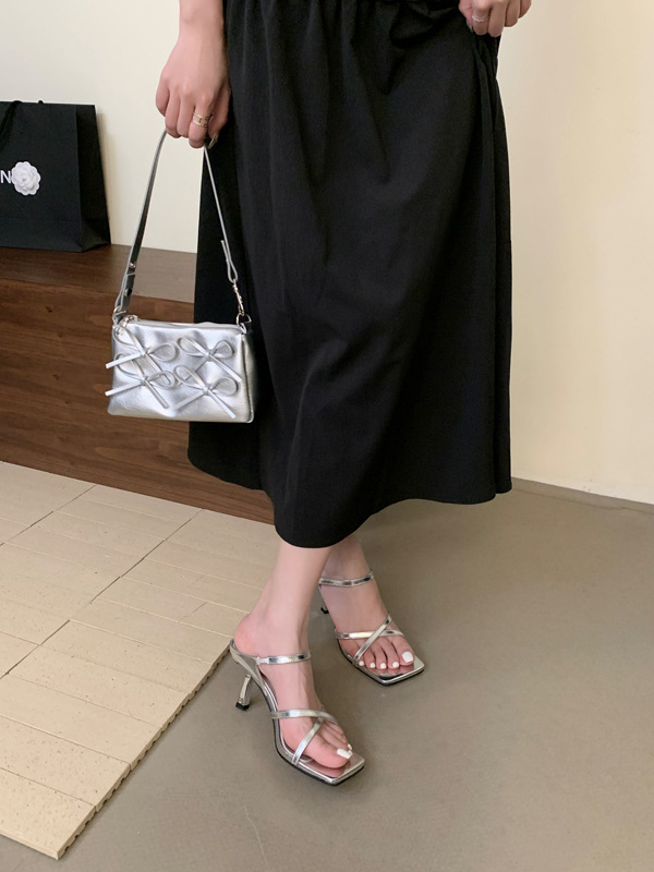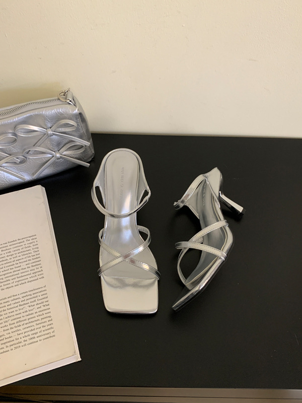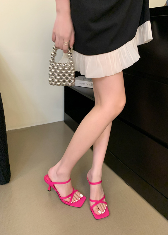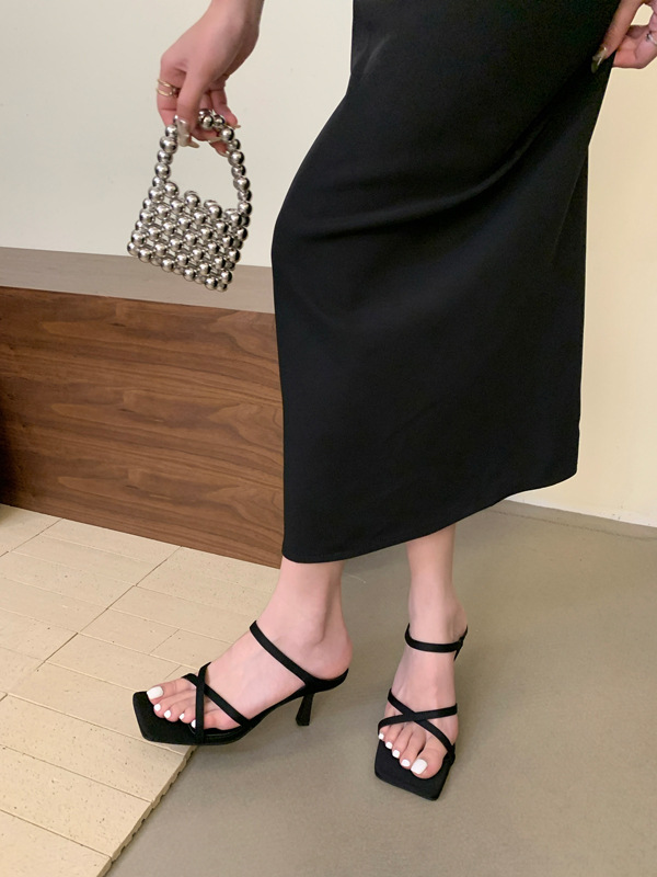여름 2024 한국식 광장 발가락 오픈 발가락 얇은 힐 슬라이딩 벨트 크로스 벨트 빈 슬립 온 솔리드 컬러 여성용 하이힐 샌들스토어 가기