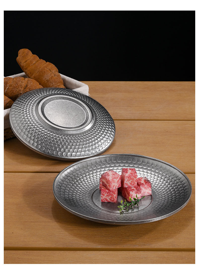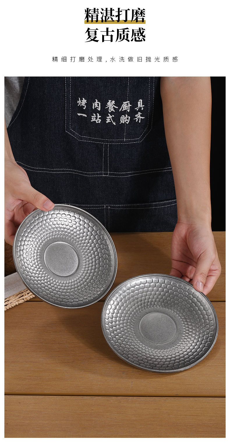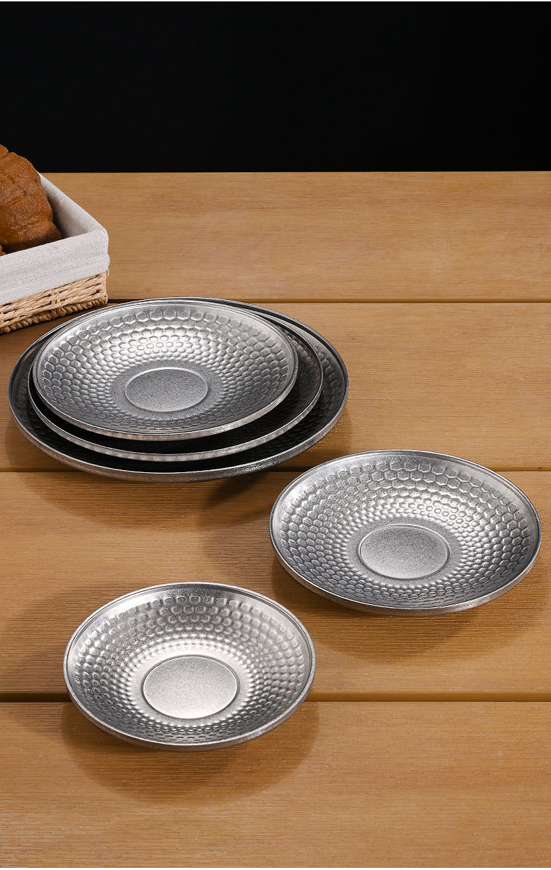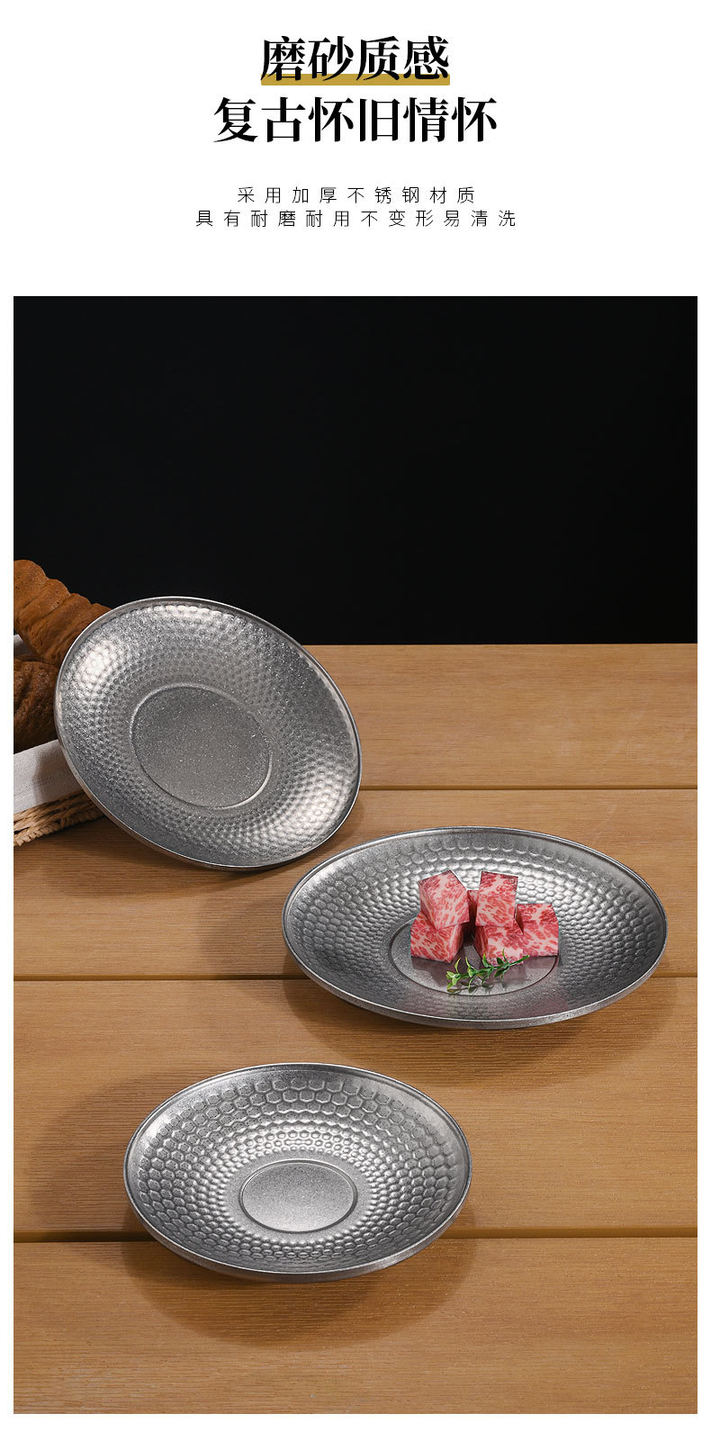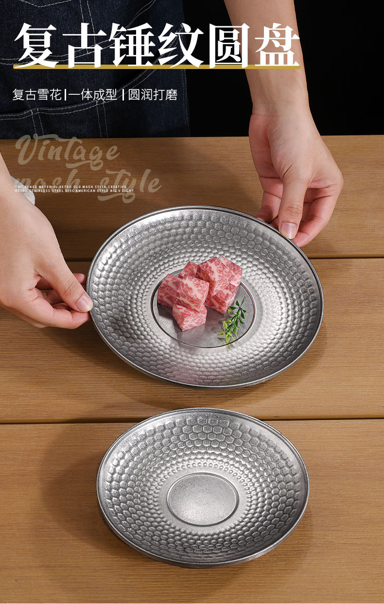 직접 공급 복고풍 304 스테인레스 스틸 디스크 상업 고민 바베큐 가게 망치 패턴 플레이트 산업 스타일의 디저트 케이크 플레이트