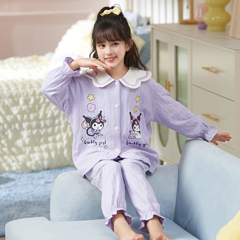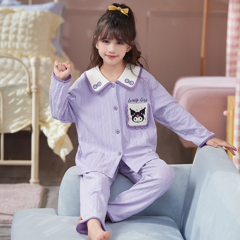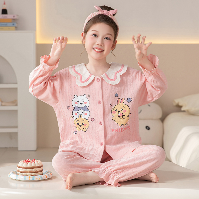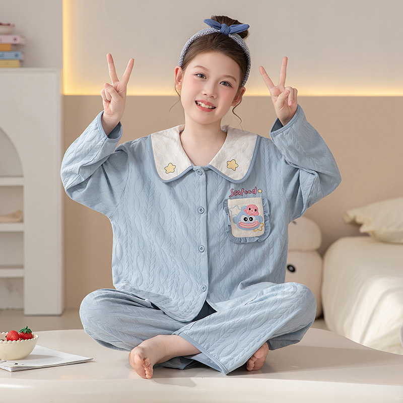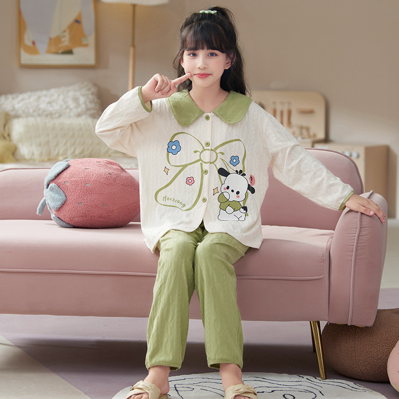 어린이 잠옷 소녀의 봄과 가을 얇은 순수 자카드 카디건 큰 어린이 공주 소녀의 집 옷 세트 여름