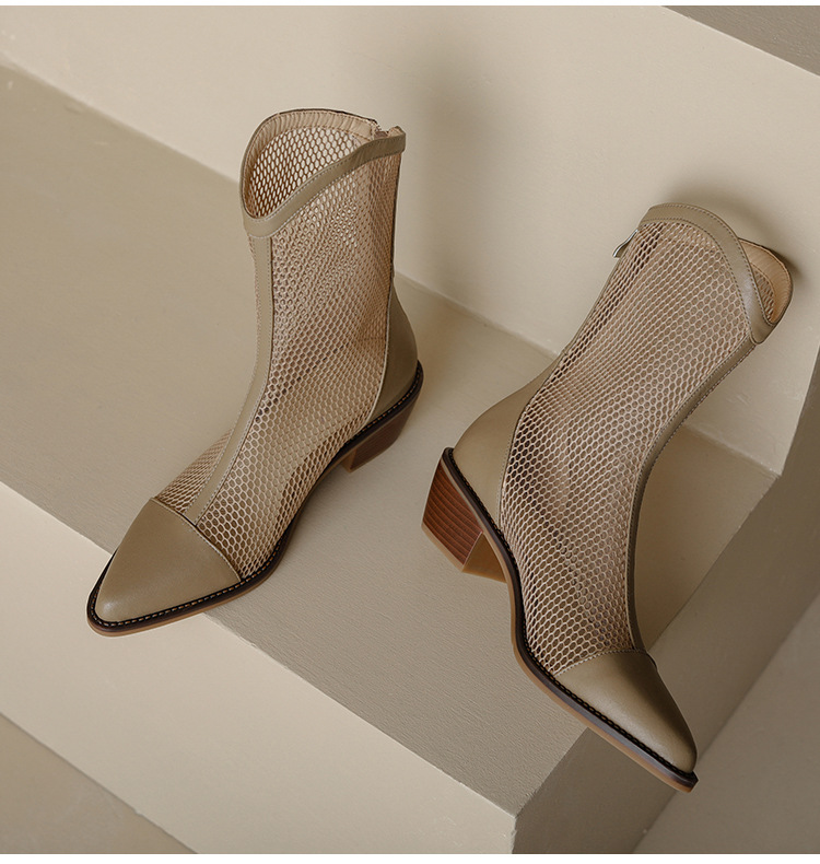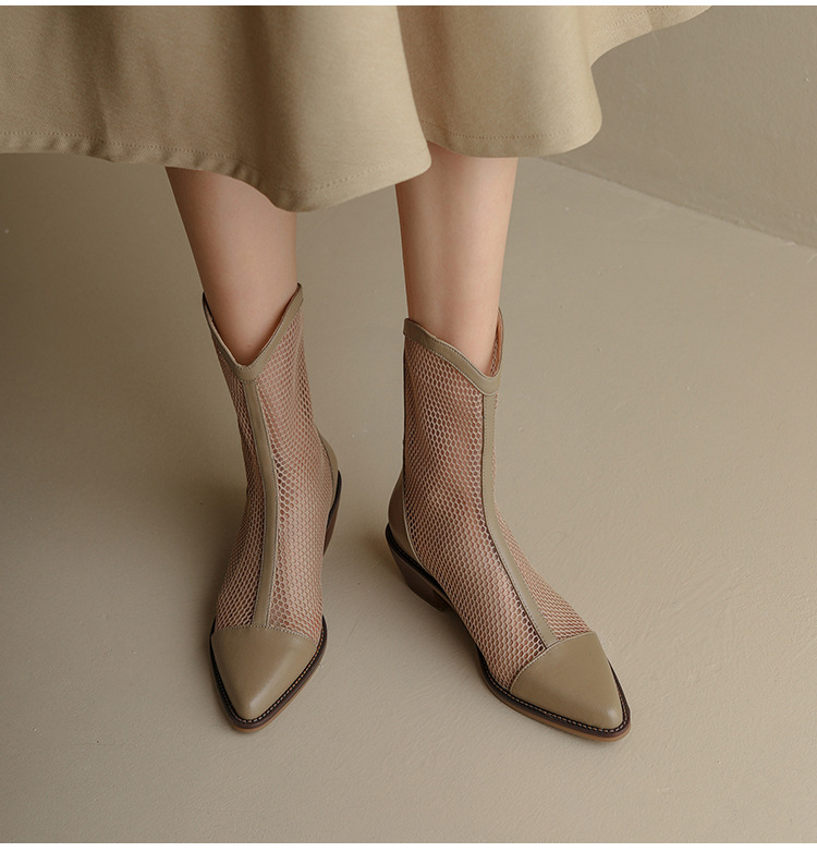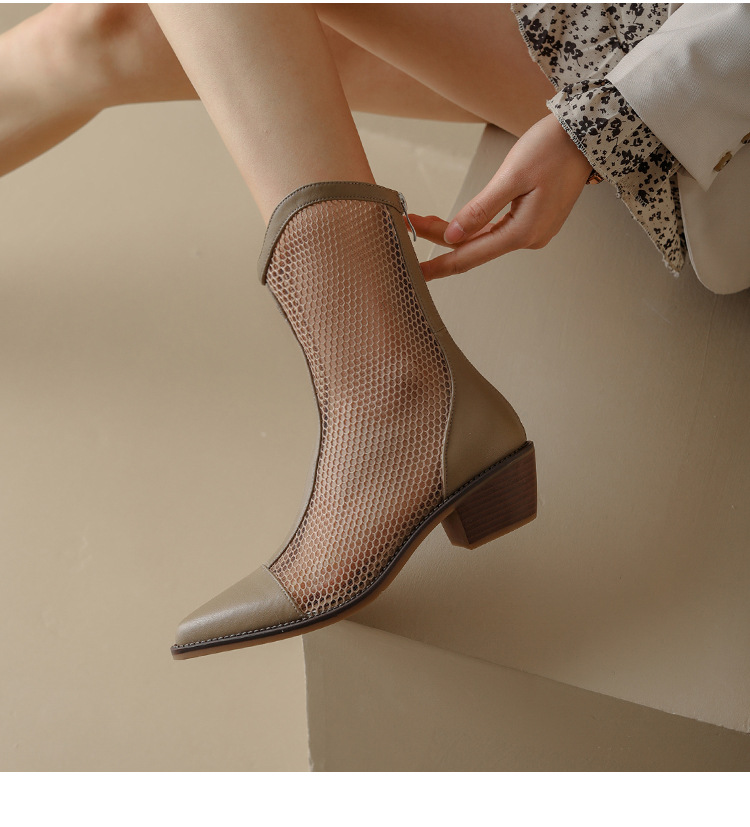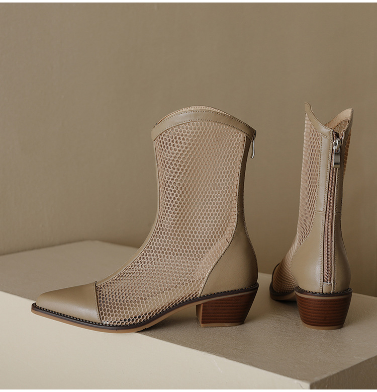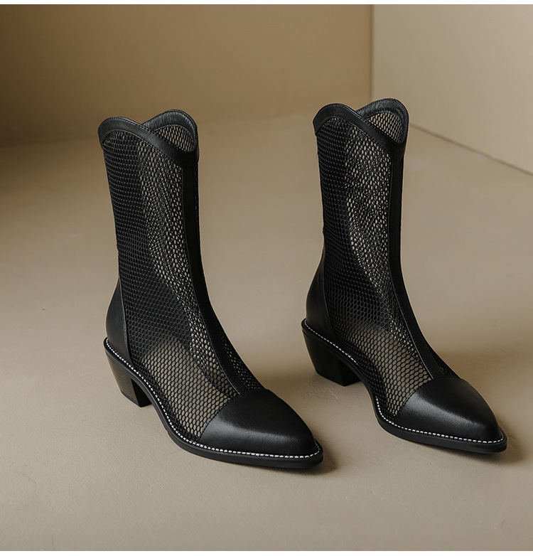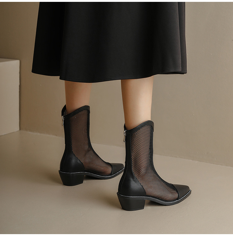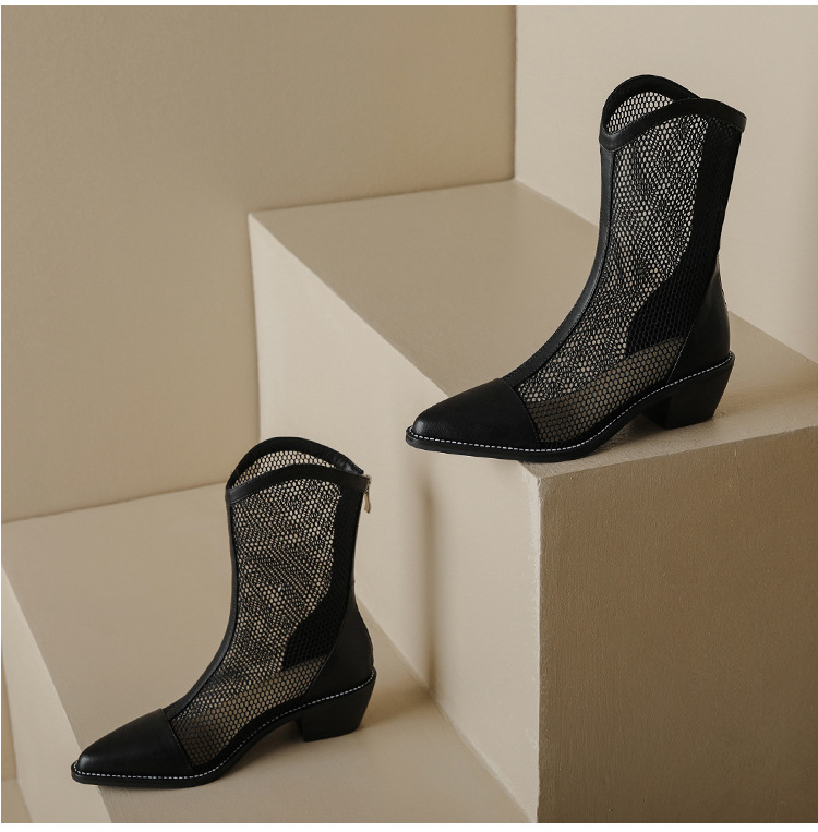 메쉬 마틴 부츠 여성용 두꺼운 힐 플랫폼 안티 슬립 메쉬 부츠 샌들 미드 힐 포인팅 블랙 V-입 할로우 웨스턴 발목 부츠
