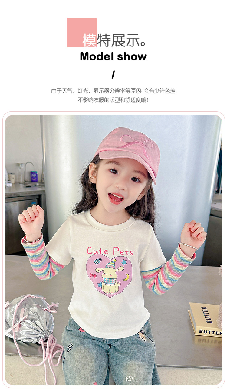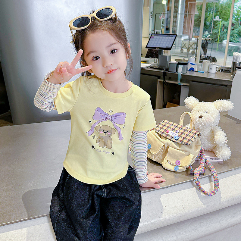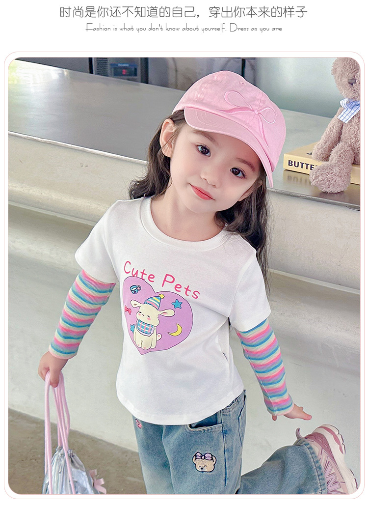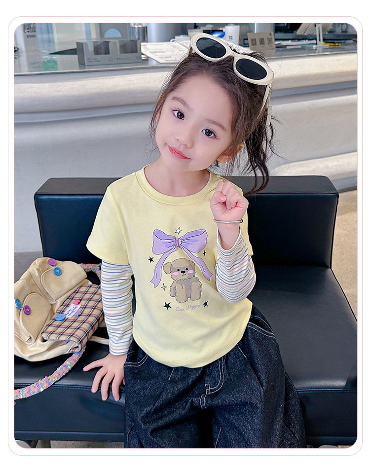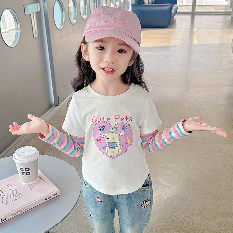 소녀베이스 셔츠 봄과 가을 2024 새로운 패션 어린 소녀 가짜 두 조각 만화 중소형 어린이를위한 긴팔 탑스토어 가기