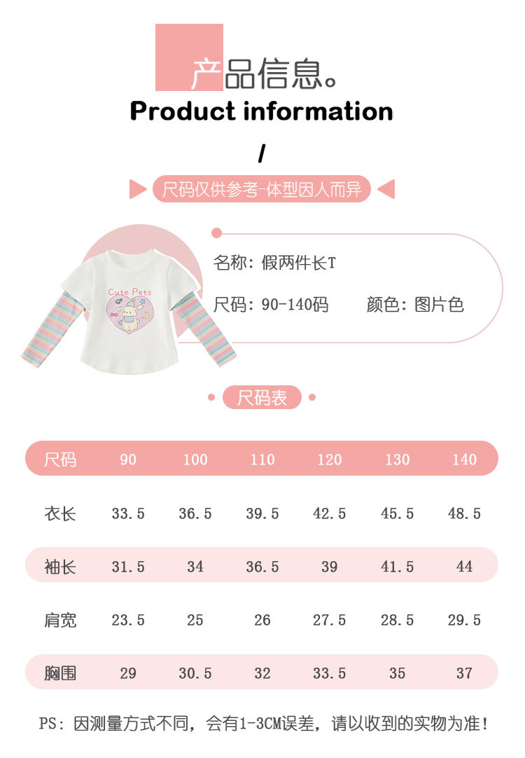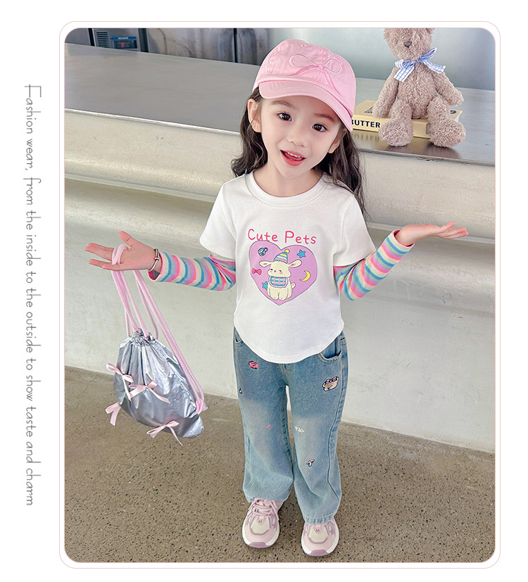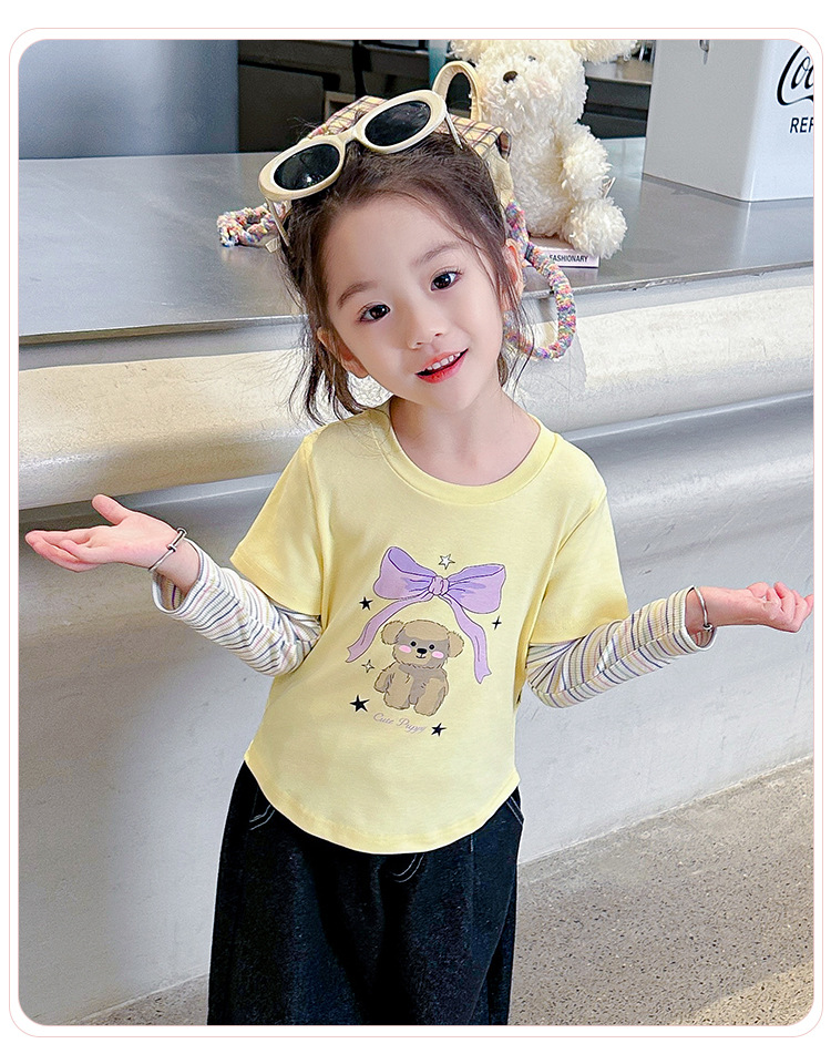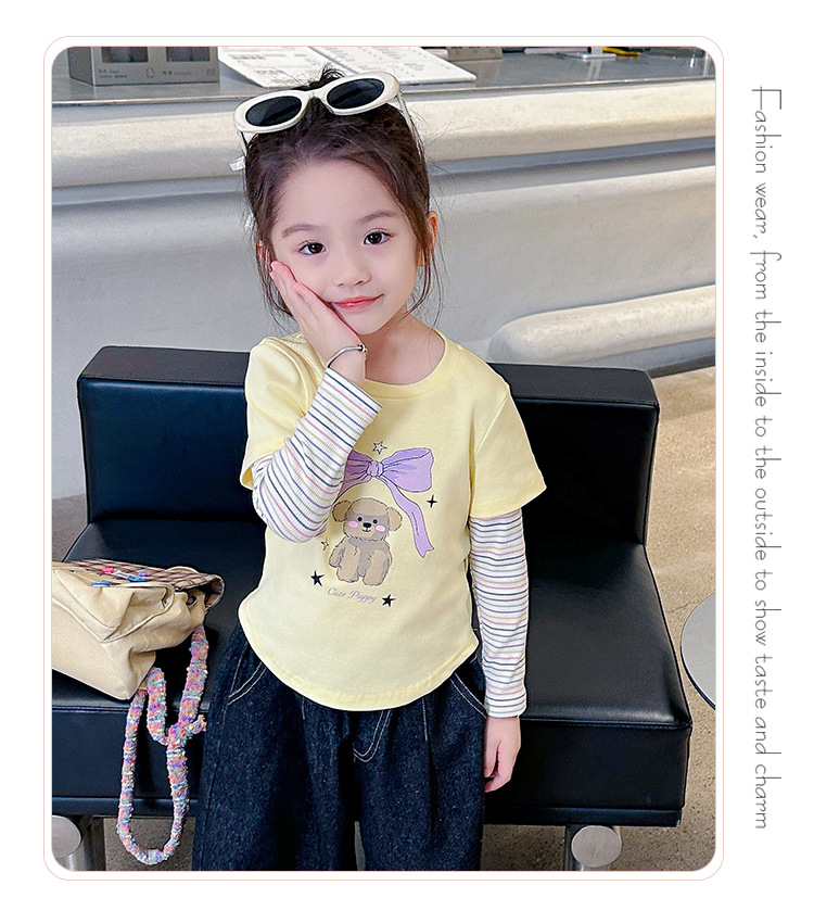 소녀베이스 셔츠 봄과 가을 2024 새로운 패션 어린 소녀 가짜 두 조각 만화 중소형 어린이를위한 긴팔 탑스토어 가기