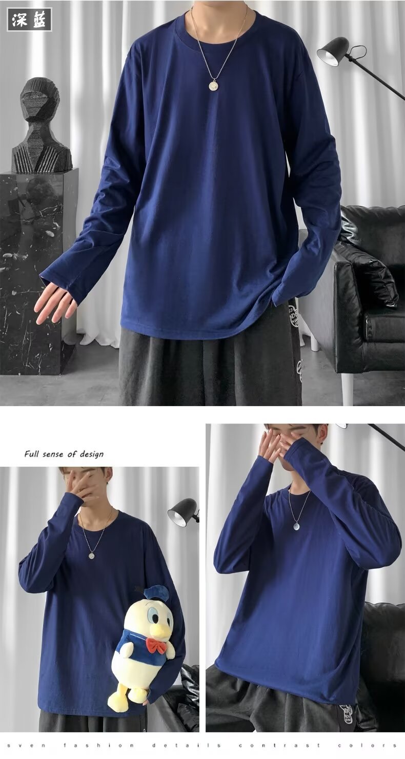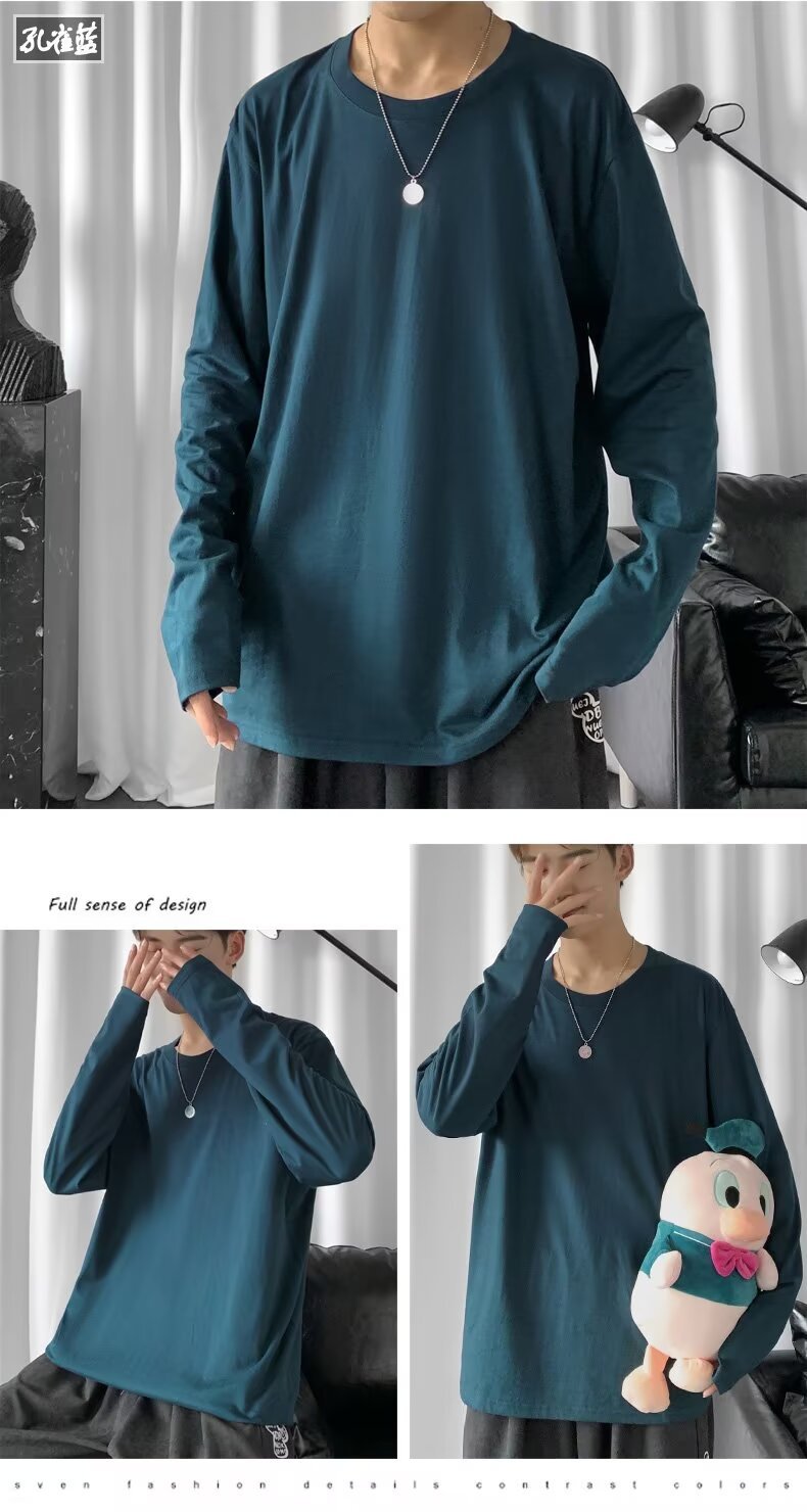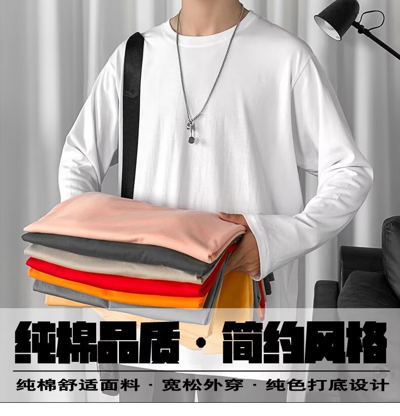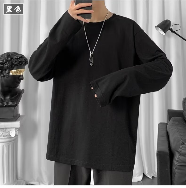 새로운 솔리드 컬러 코튼 긴팔 티셔츠 남성용 루즈 라운드 넥 기본베이스 셔츠 화이트 티셔츠스토어 가기