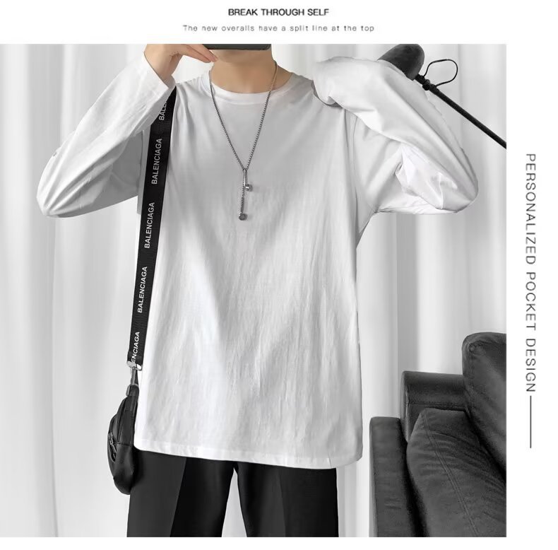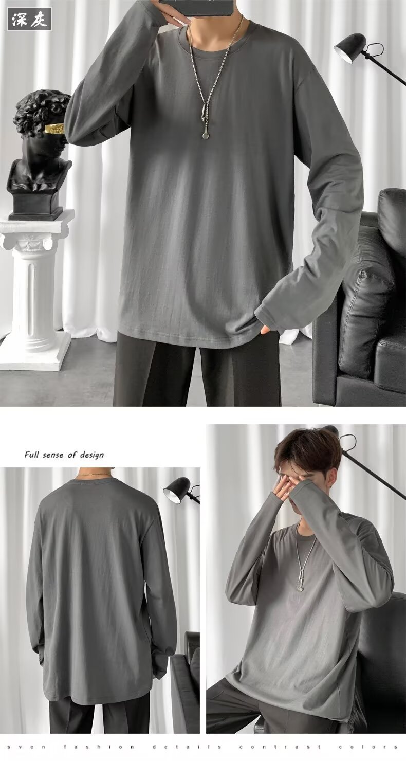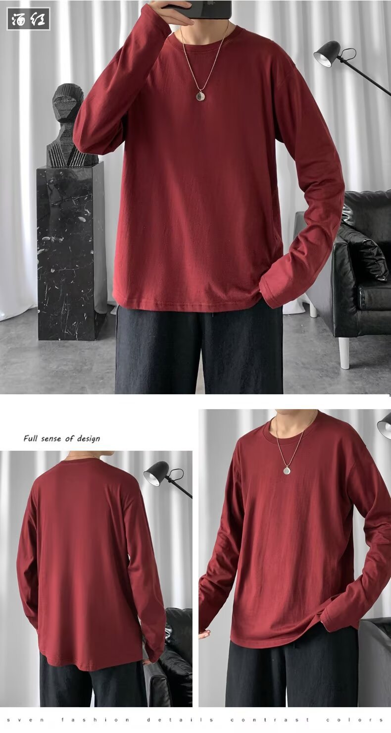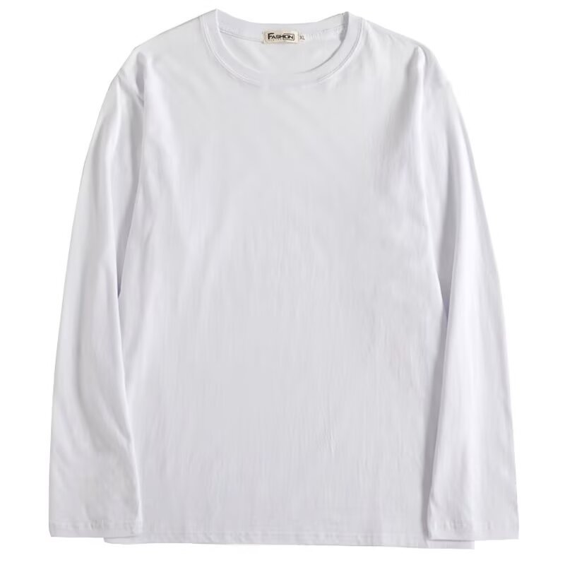 새로운 솔리드 컬러 코튼 긴팔 티셔츠 남성용 루즈 라운드 넥 기본베이스 셔츠 화이트 티셔츠